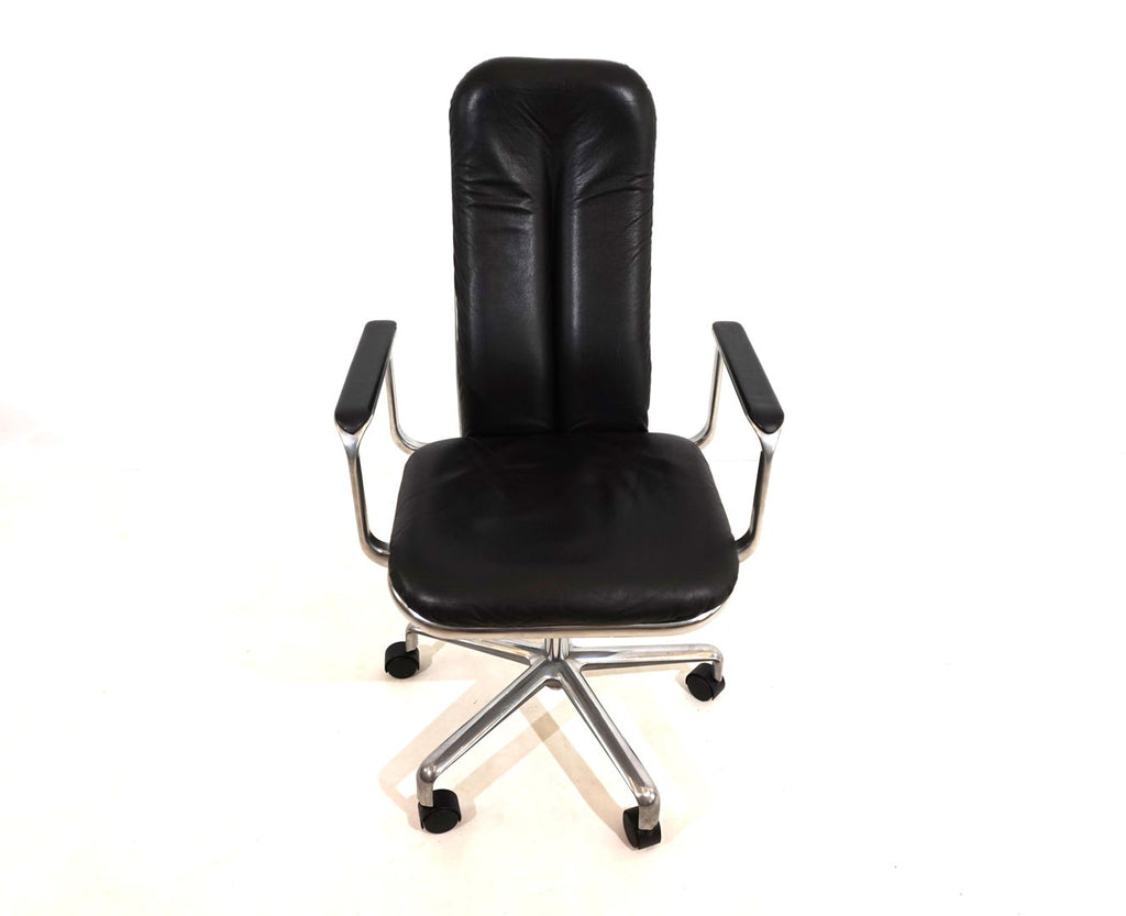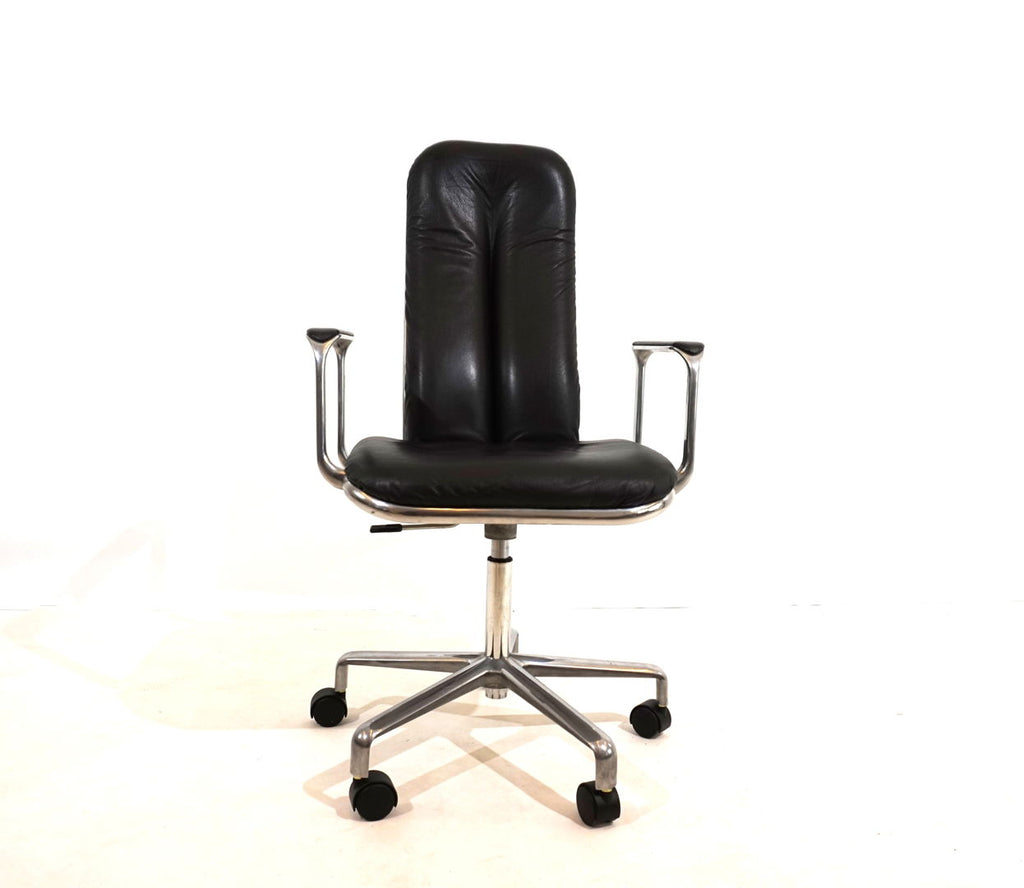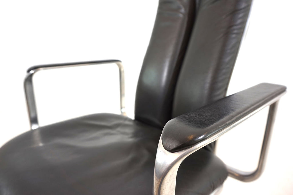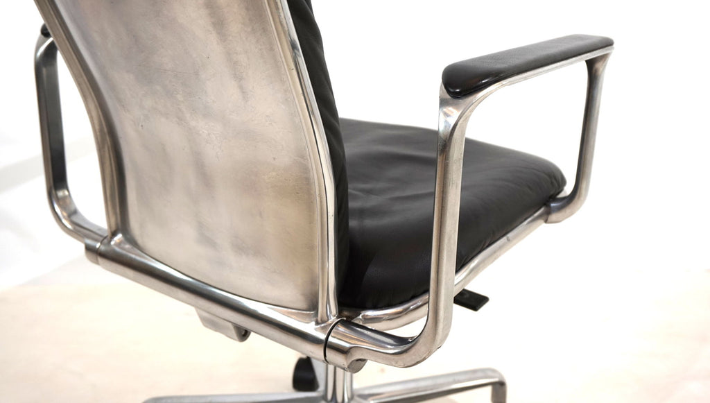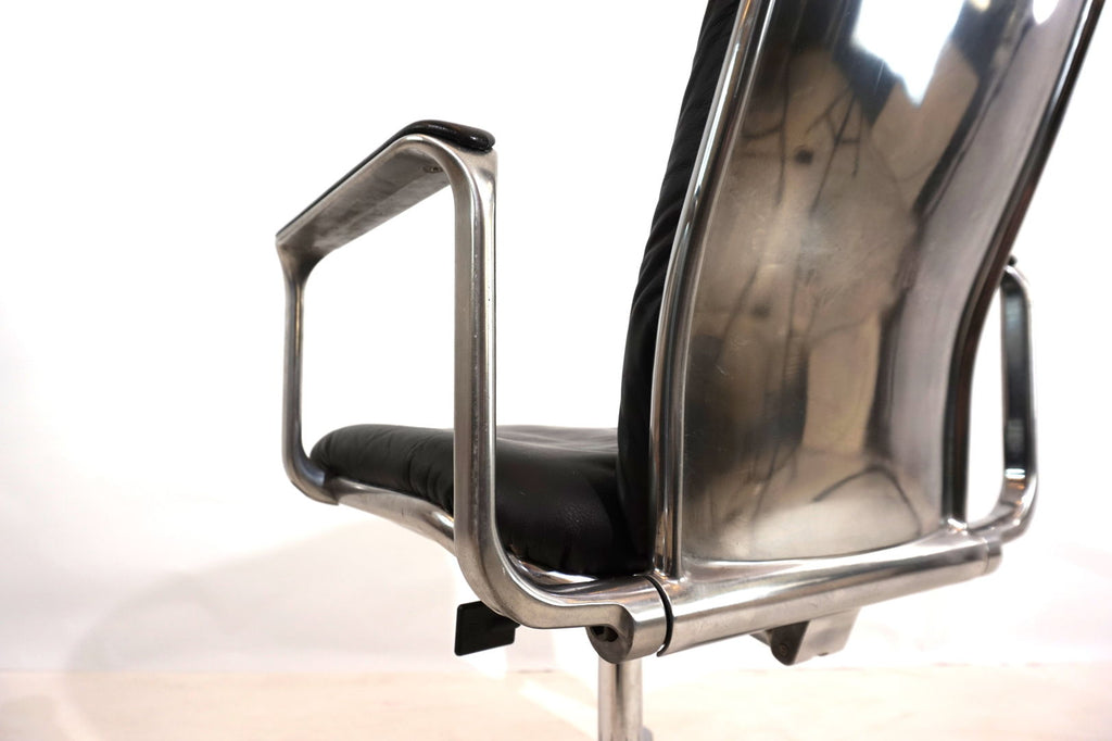 This always-attractive Supporto office chair is in very good condition and comes in the most beautiful combination of black leather/polished aluminum frame. The black leather pads on the backrest and seat are flawless, the polished aluminum surfaces of the backrest and the leather pads on the armrests show minimal signs of wear. The chair is height adjustable from 48-58 cm seat height, the backrest is also cushioned by hydraulics and can be infinitely adjusted backwards. The hydraulics of the height adjustment and the backrest work perfectly. The Supporto was the most outstanding success of the British designer Frederick Scott, who designed it in 1976. It was produced by Hille UK and later by the Italian manufacturer ICF.