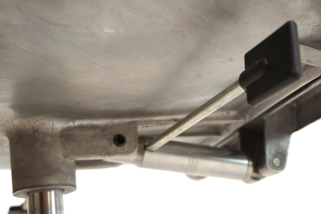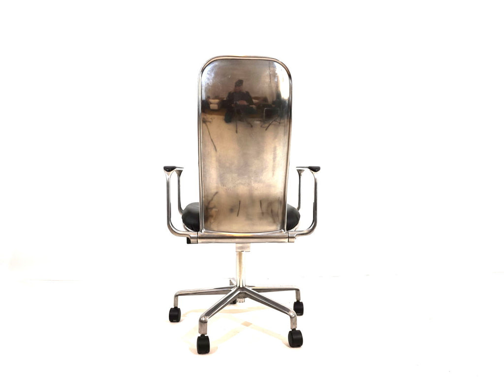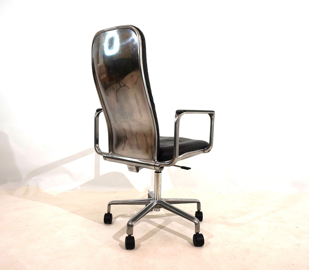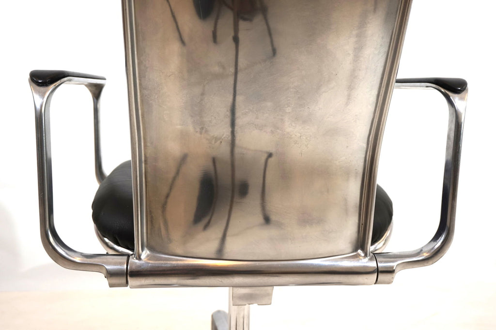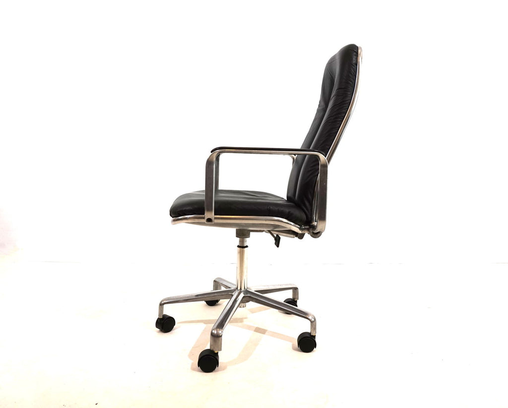 This always-attractive Supporto office chair is in very good condition and comes in the most beautiful combination of black leather/polished aluminum frame. The black leather pads on the backrest and seat are flawless, the polished aluminum surfaces of the backrest and the leather pads on the armrests show minimal signs of wear. The chair is height adjustable from 48-58 cm seat height, the backrest is also cushioned by hydraulics and can be infinitely adjusted backwards. The hydraulics of the height adjustment and the backrest work perfectly. The Supporto was the most outstanding success of the British designer Frederick Scott, who designed it in 1976. It was produced by Hille UK and later by the Italian manufacturer ICF.