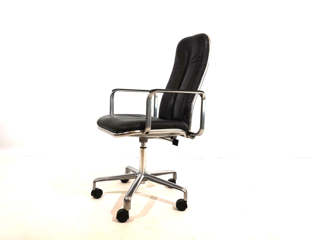 항상 매력적인 이 Supporto 사무용 의자는 상태가 매우 좋으며 검은색 가죽/광택 알루미늄 프레임의 가장 아름다운 조합으로 제공됩니다. 등받이와 시트의 검정색 가죽 패드는 흠집이 없으며, 등받이의 광택 알루미늄 표면과 팔걸이의 가죽 패드는 마모 흔적이 거의 없습니다. 의자는 좌석 높이 48~58cm로 높이 조절이 가능하며, 등받이도 유압 장치로 쿠션 처리되어 뒤로 무제한으로 조절할 수 있습니다. 높이 조절과 등받이의 유압 장치가 완벽하게 작동합니다. Supporto는 영국 디자이너 Frederick Scott이 1976년에 디자인한 가장 뛰어난 성공작입니다. 이 제품은 Hille UK에서 생산되었고 나중에는 이탈리아 제조업체인 ICF에서 생산되었습니다.