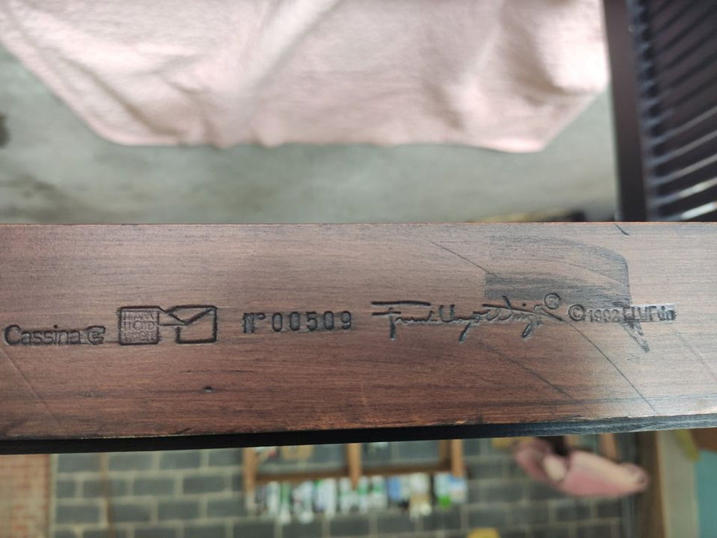 Husser 615 식탁은 Frank Lloyd Wright가 1899년 시카고 Husser 집을 위해 디자인했습니다. Husser House는 Frank Lloyd Wright가 Helen과 Joseph Husser를 위해 디자인했습니다. 이 테이블은 1992년 Cassina에 의해 재발행되었으며 "Cassina I Maestri" 컬렉션에 포함되어 더 이상 생산되지 않습니다. 테이블은 블랙 에디션으로 존재하지만 나중에 블랙으로 래커 처리되었습니다. 서명하고 번호를 매겼습니다! Dxhxl: 127x74x153 cm 약간의 사용감 있음(사진 참조)