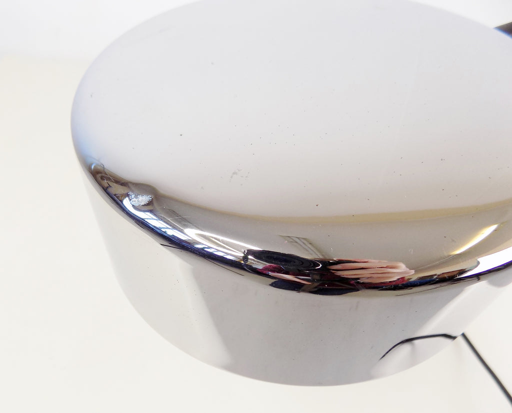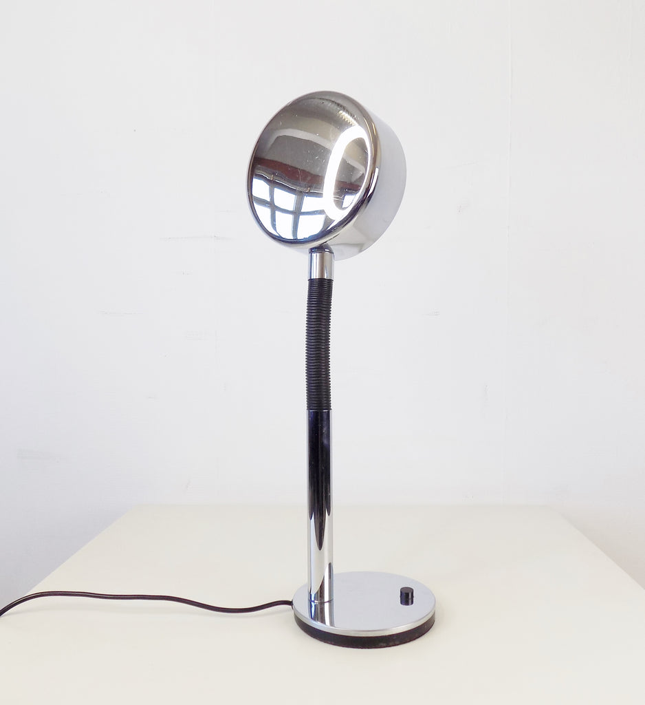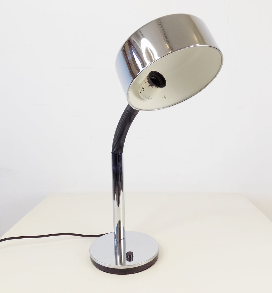 구즈넥의 플라스틱 호스와 마찬가지로 크롬도 흠잡을 데가 없습니다. 갓에는 한군데 움푹 들어간 곳이 있습니다. 목의 가동성은 물론 기능성도 충분히 발휘. 독일 제조업체 Hustadt는 1970년대에 이 램프를 만들었습니다.