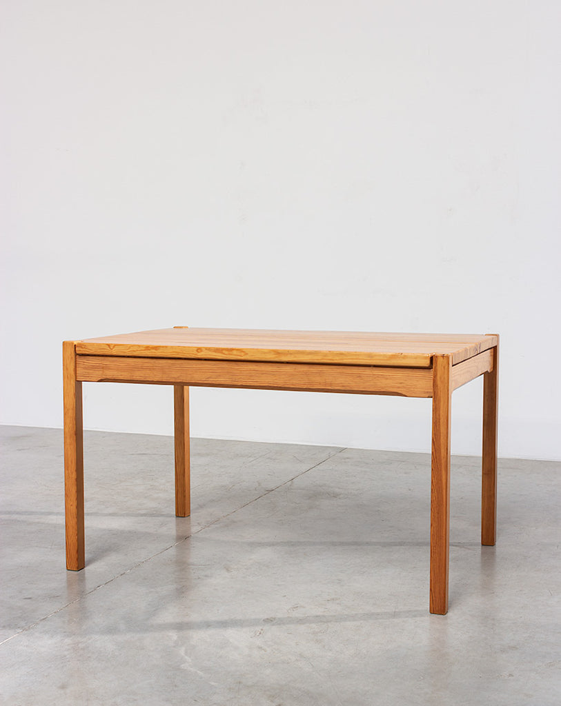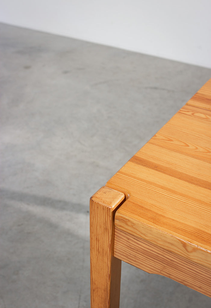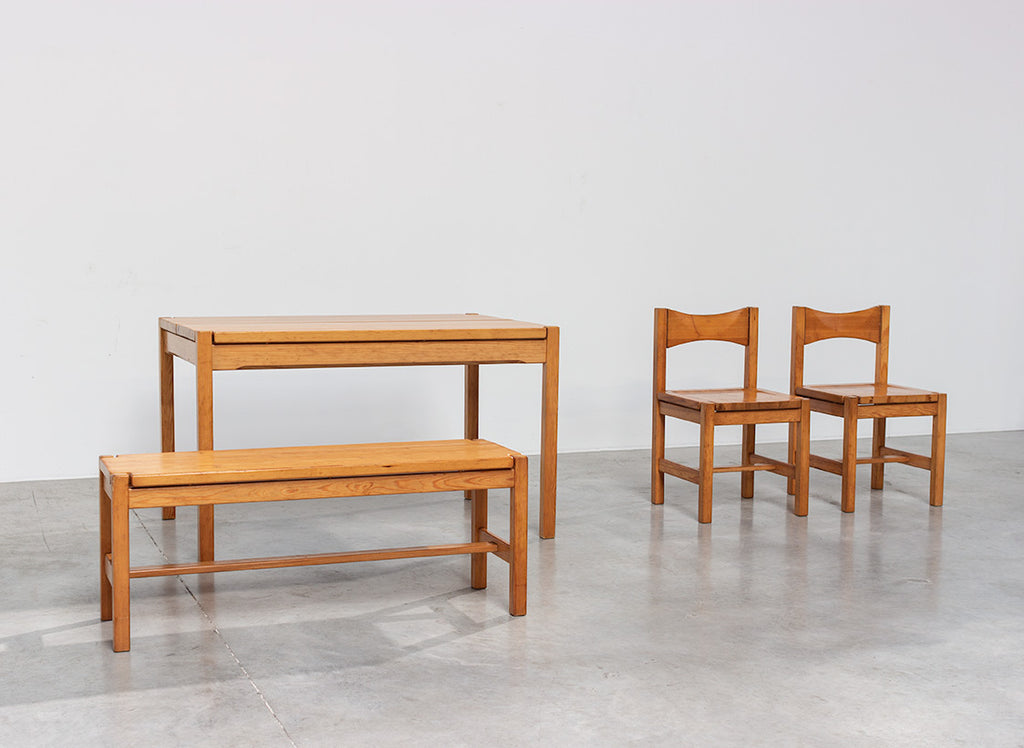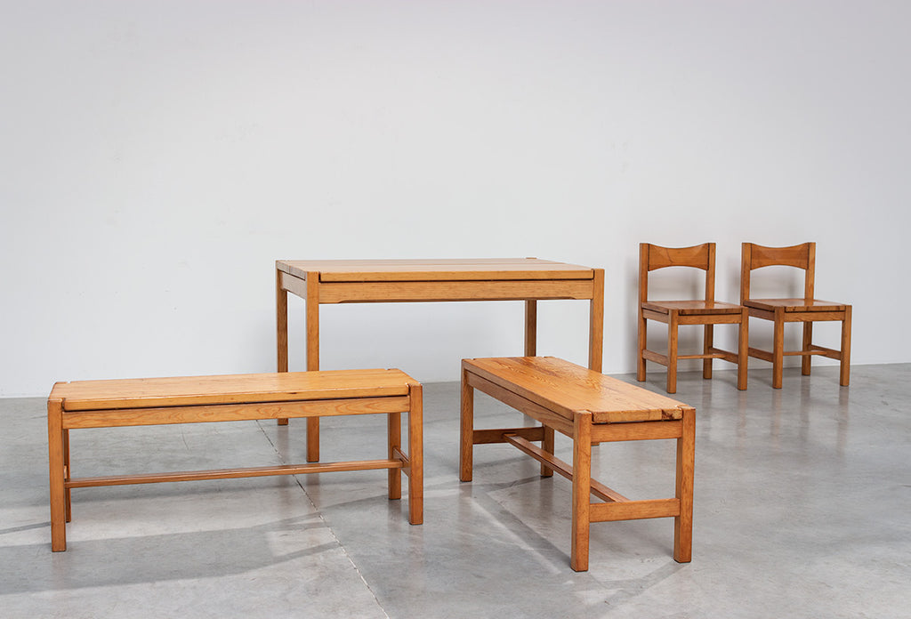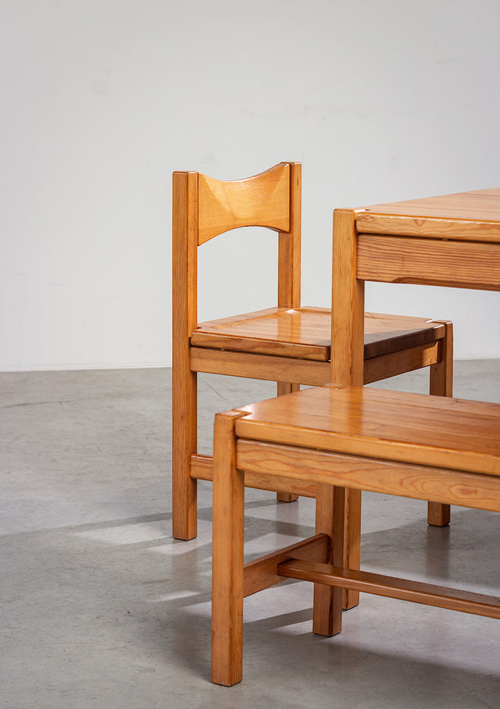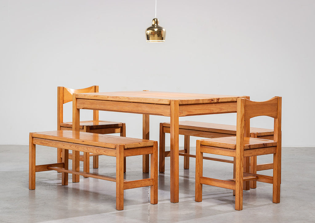 1963년 핀란드의 Laukaan Puu를 위해 Ilamri Tapiovaara가 디자인했습니다. 의자 2개, 벤치 2개, 식탁. 단단한 소나무로 만들어졌습니다. 일반적으로 Tapiovaara 테이블 분할 상단은 눈에 보이는 다웰로 구분됩니다. 테이블 상판과 좌석은 유사한 방식으로 프레임 위에 떠 있습니다. 디자인: Ilamri Tapiovaara 프로듀서: Laukaan Puu