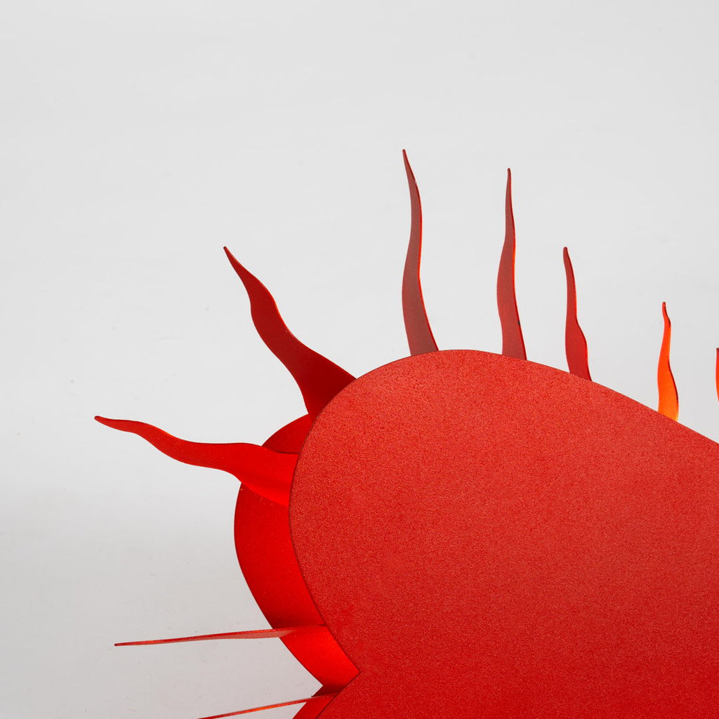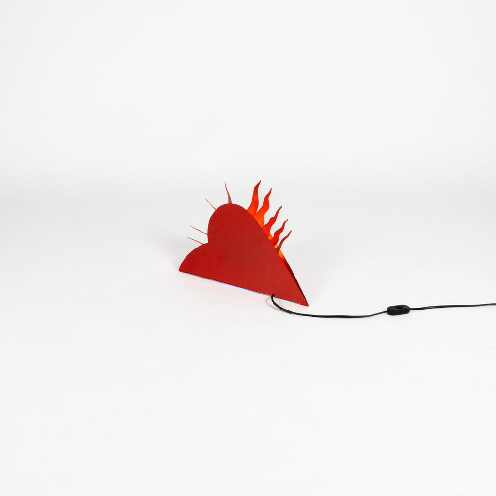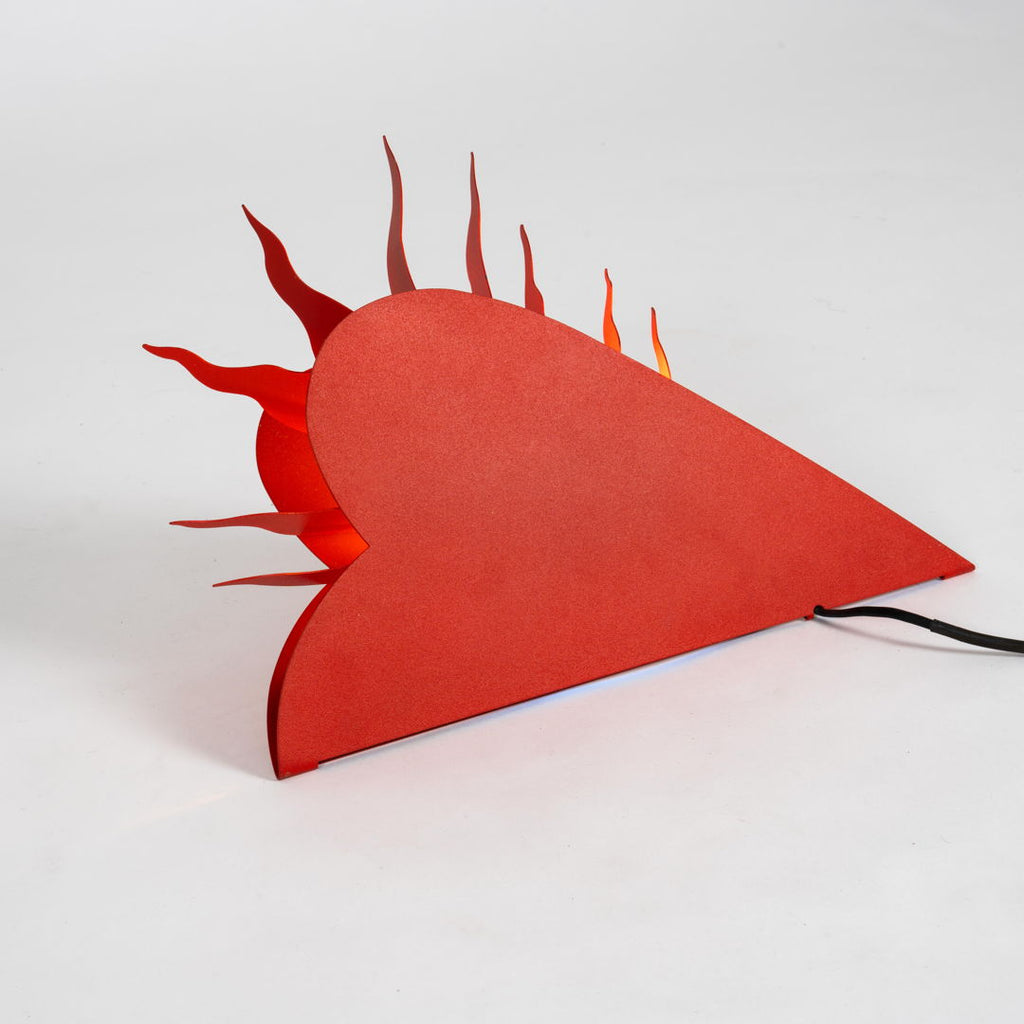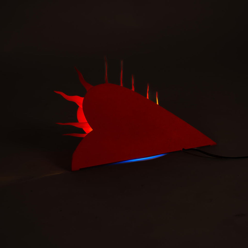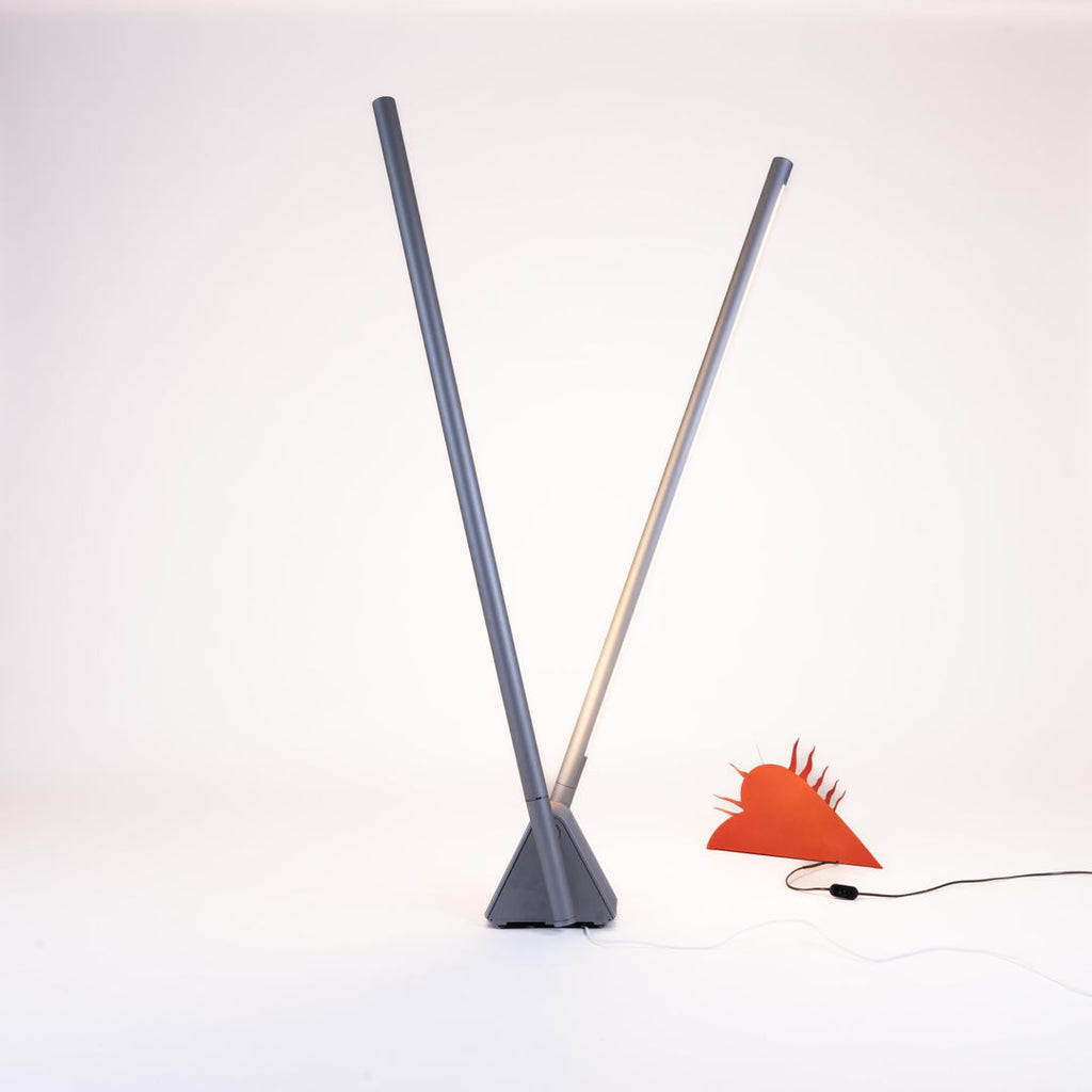 1994년 Ingo Maurer가 제작한 매우 희귀한 조각 벽 램프. 360도 회전 전등갓이 있는 빨간색 페인트 금속 프레임으로 구성되어 있습니다. 조각적인 그림자 놀이를 만들어내는 은은한 파란색/노란색 조명. 매우 좋은 오리지널 빈티지 상태입니다.