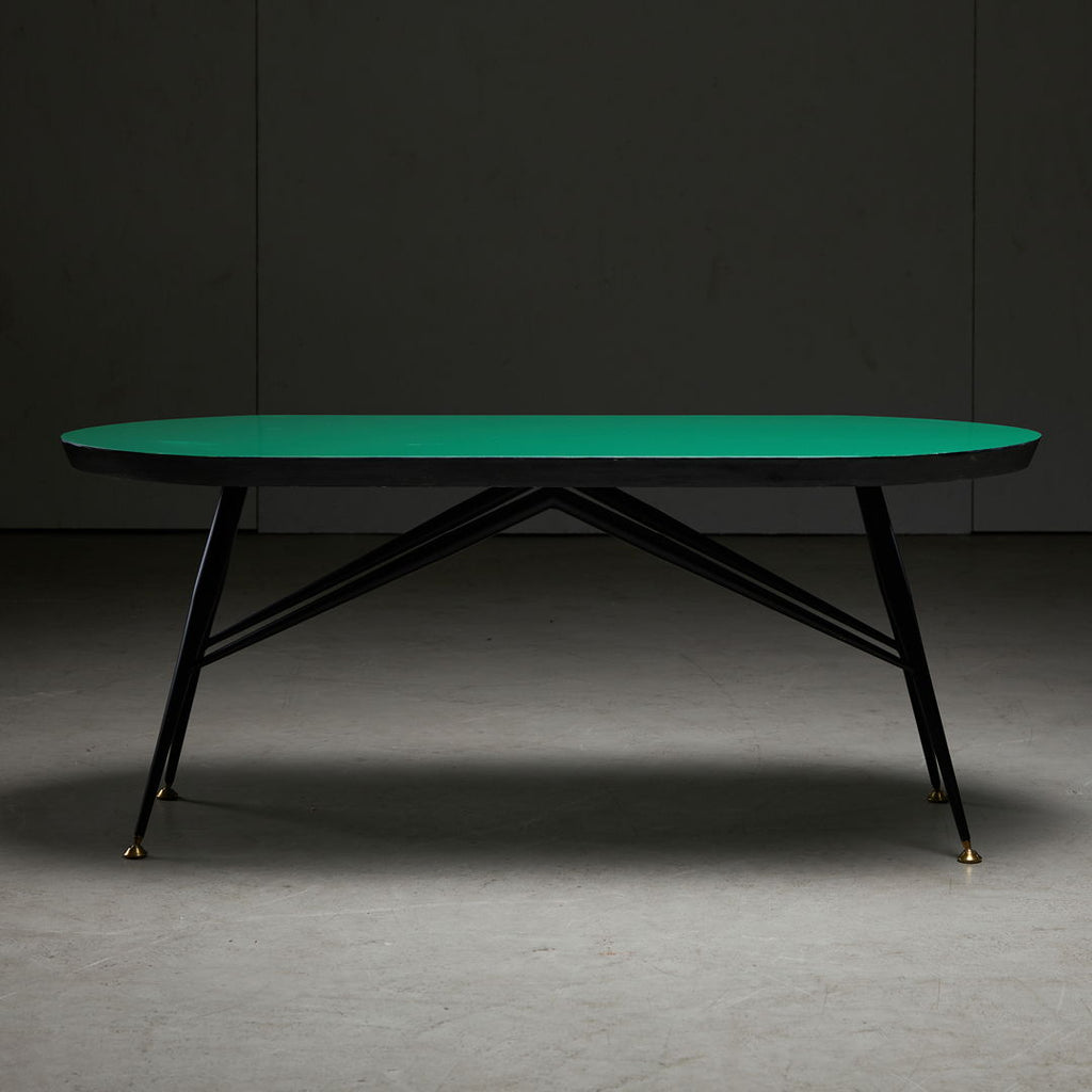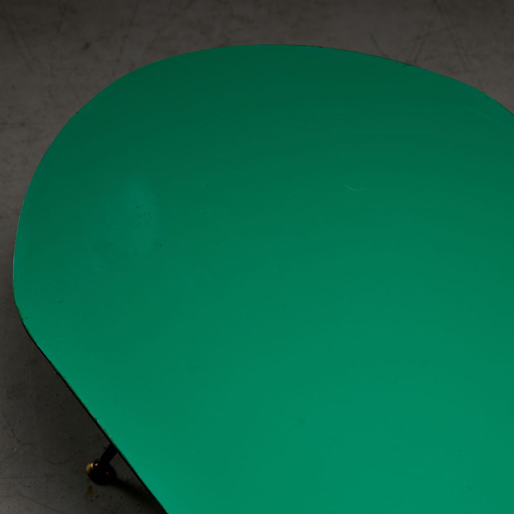 "1950~60년대 이탈리아 커피 테이블, 우아한 모양의 검은색 금속 다리, 구리 발, 스펀지 모양의 녹색 합판 목재 보드. 표면에 약간의 긁힘이 있는 아름다운 빈티지 상태입니다. "