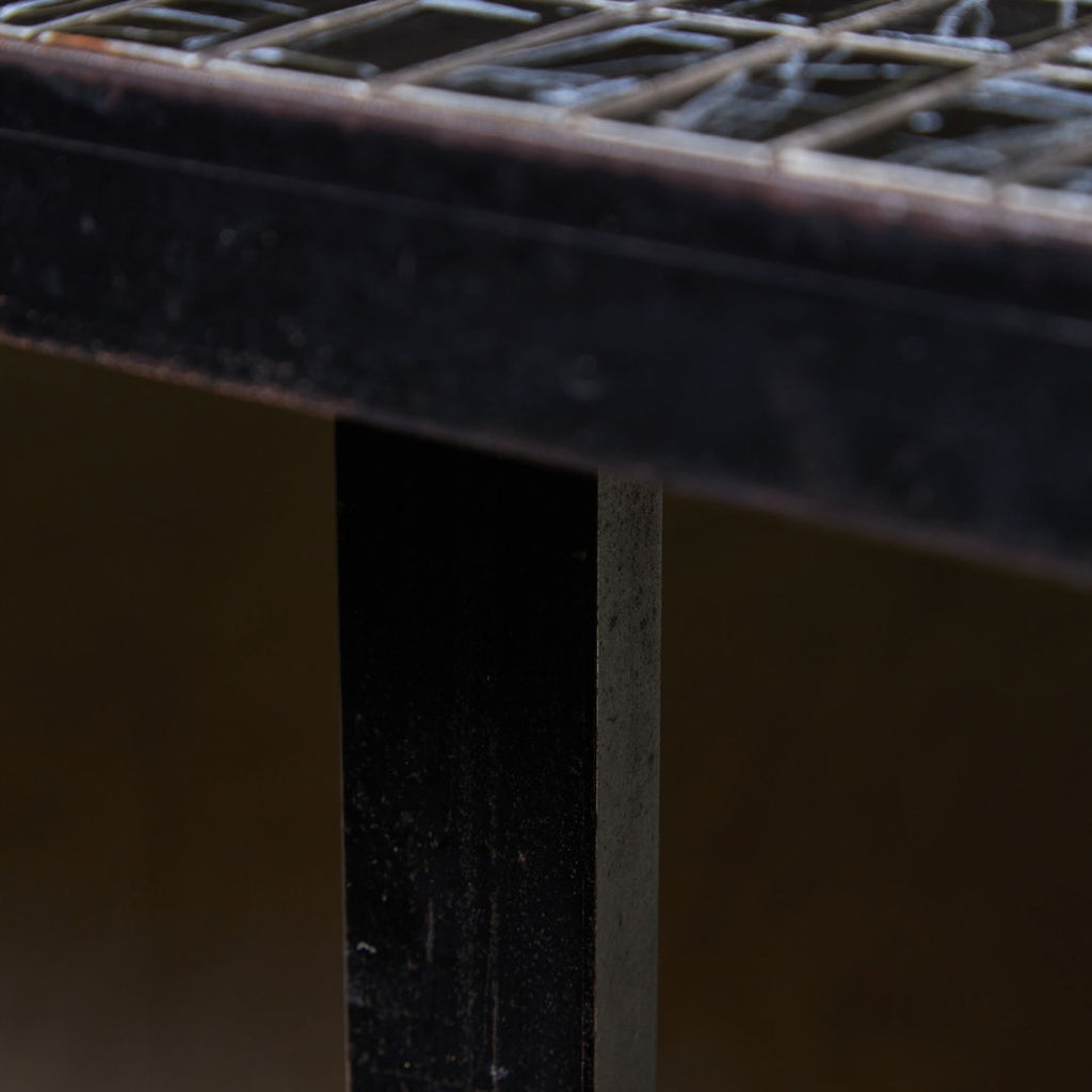 Italian 1980s coffee table on flat black metal frame, with angular oblong top and black and white mosaic tiles. Durable materials, signs of light wear consistent with age and scratches on the frame.