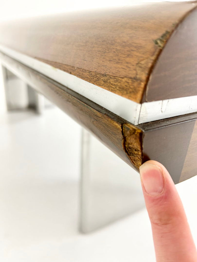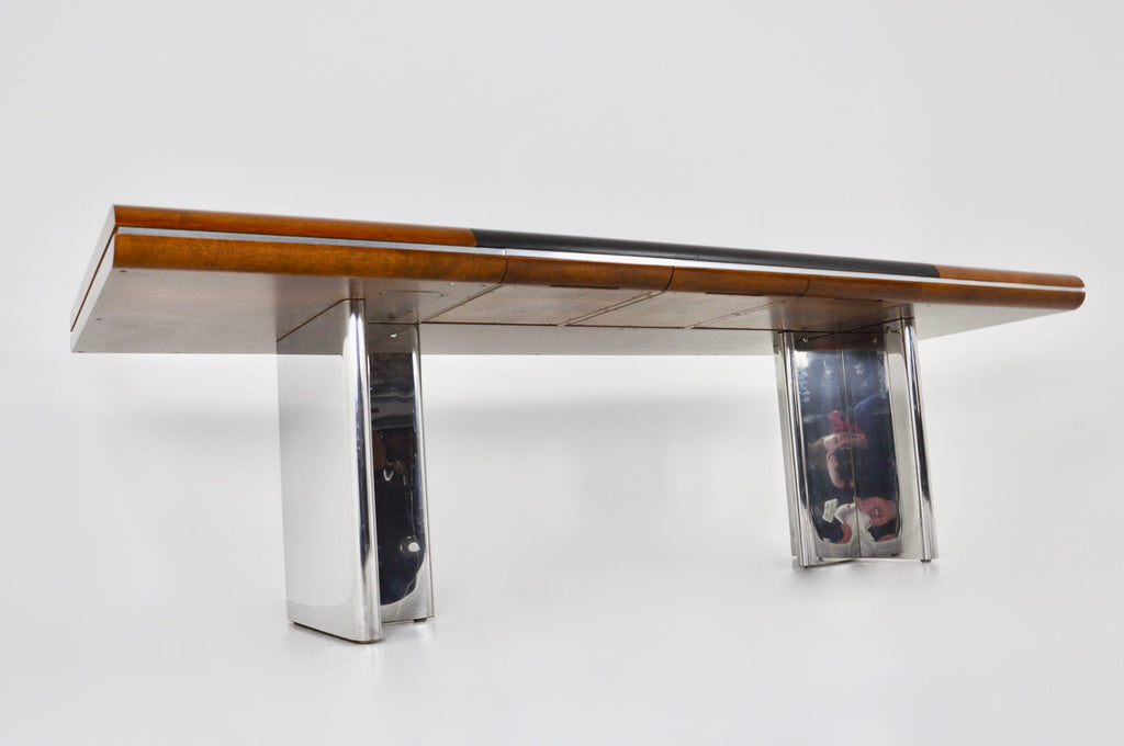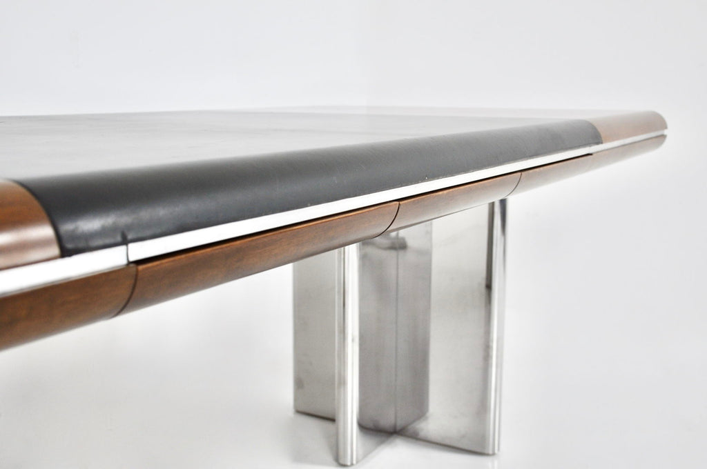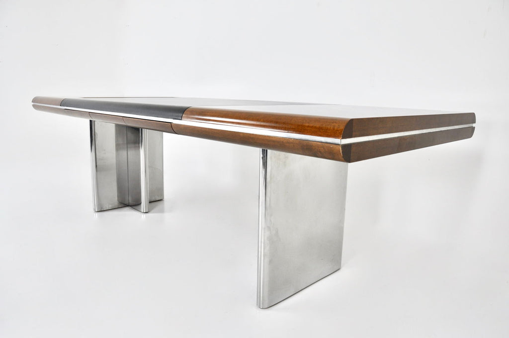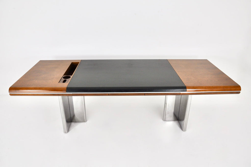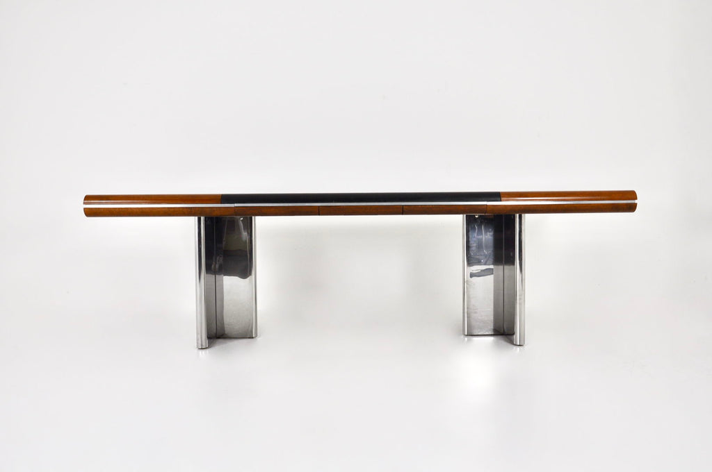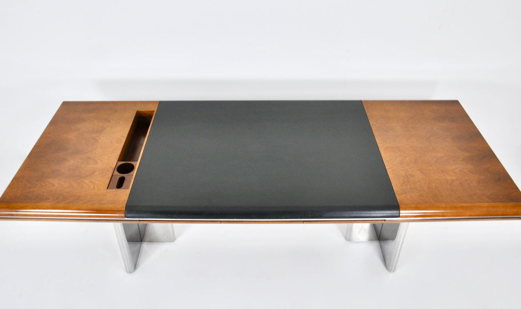 70년대 Hans Von Klier의 서랍 3개, 가죽 및 목재 상판, 크롬 도금 금속 다리가 있는 책상. 펜을 보관할 수 있는 큐브 2개가 있는 수납공간. 책상의 나이와 시간에 따른 마모.