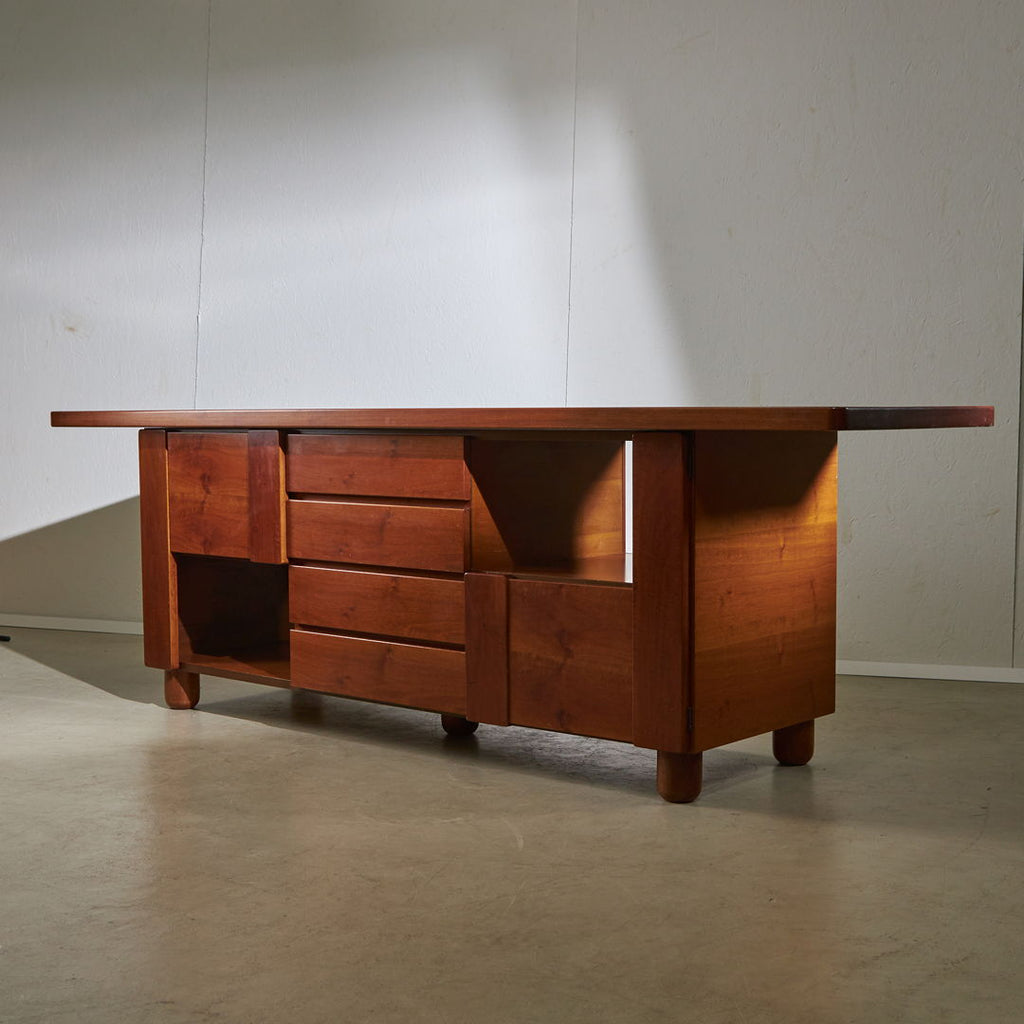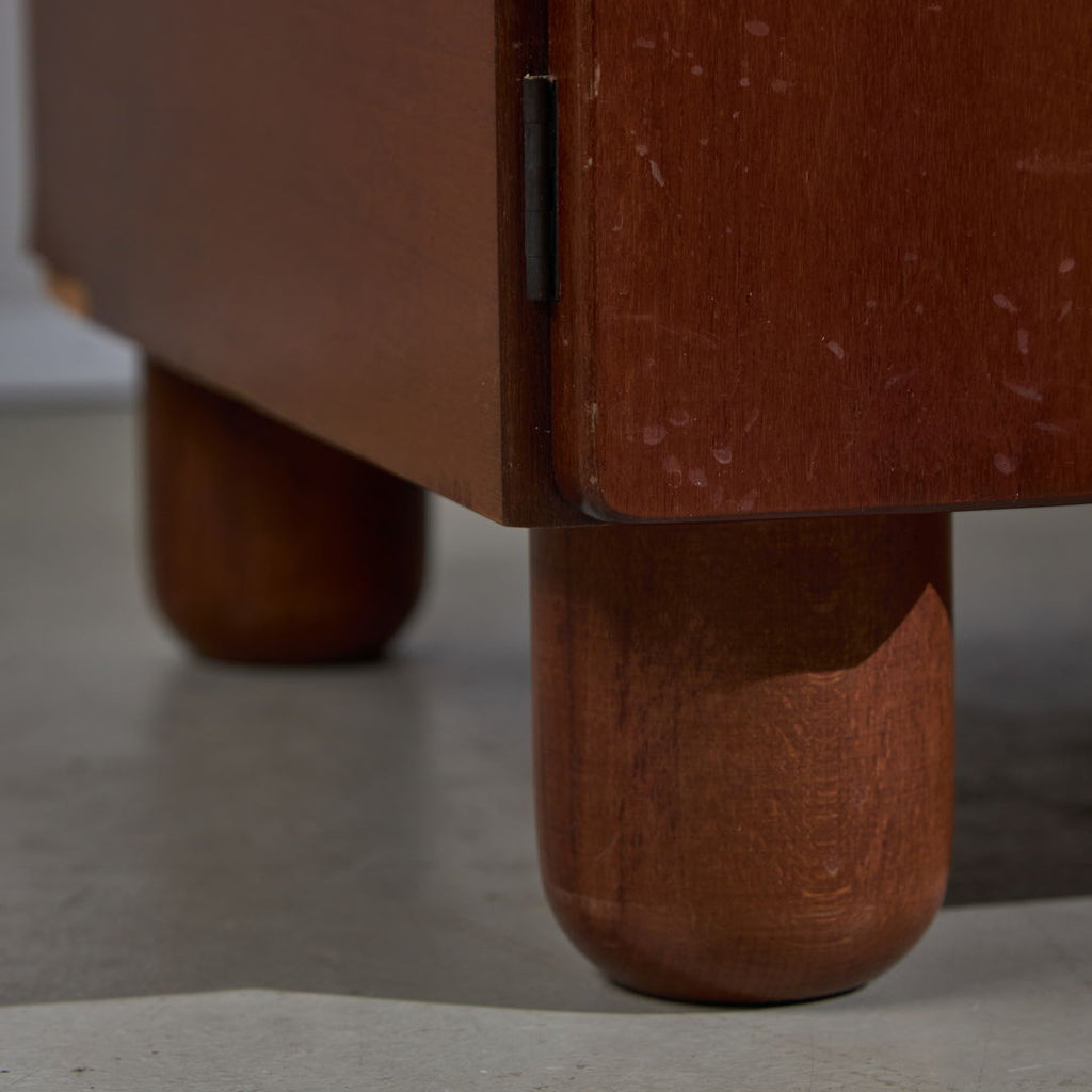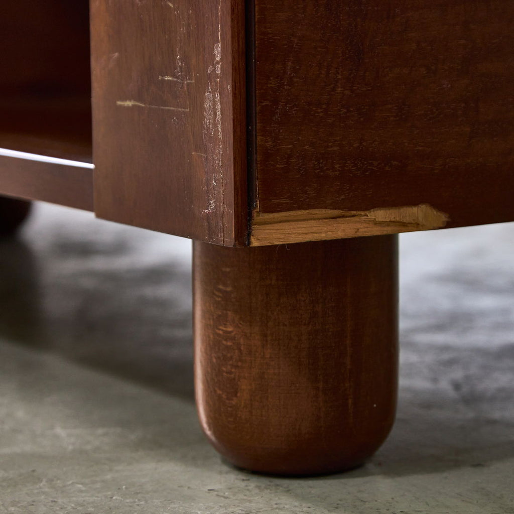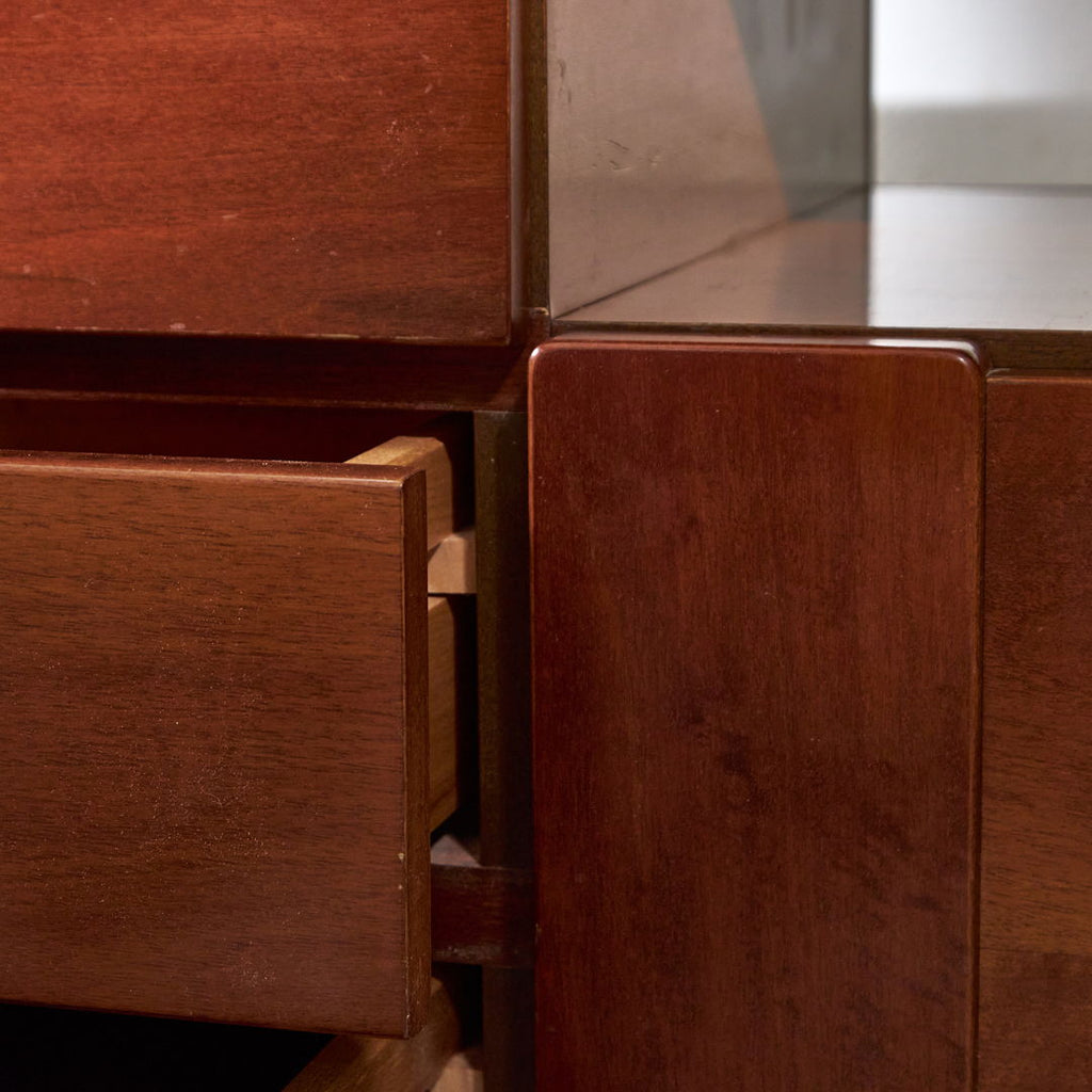 Mobil Girgi를 위해 디자인된 1970년대 이탈리안 호두나무 찬장. 중앙에 4개의 서랍이 있고 측면에 2개의 열린 서랍이 있습니다. 왼쪽 뒷부분 하단에 파손이 있고 세월과 사용감에 따른 표면 긁힘이 있습니다. 오른쪽 개방형 수납공간 표면에 주황색 얼룩이 보입니다.