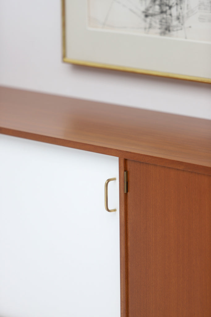 외부 서랍 4개, 미닫이문 2개, 2도어 수납장 공간이 있습니다. 슬라이딩 도어는 황동 U자형 도어 핸들로 디테일이 있으며 도어 전면에는 흰색 포미카가 있습니다.