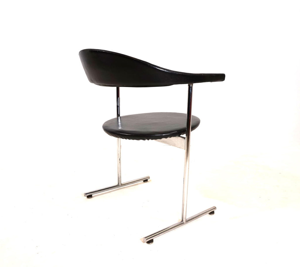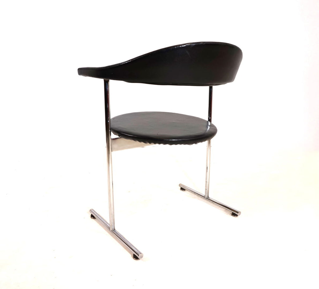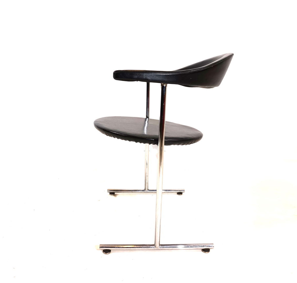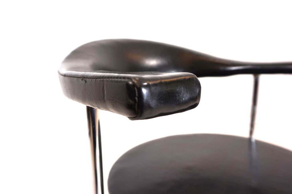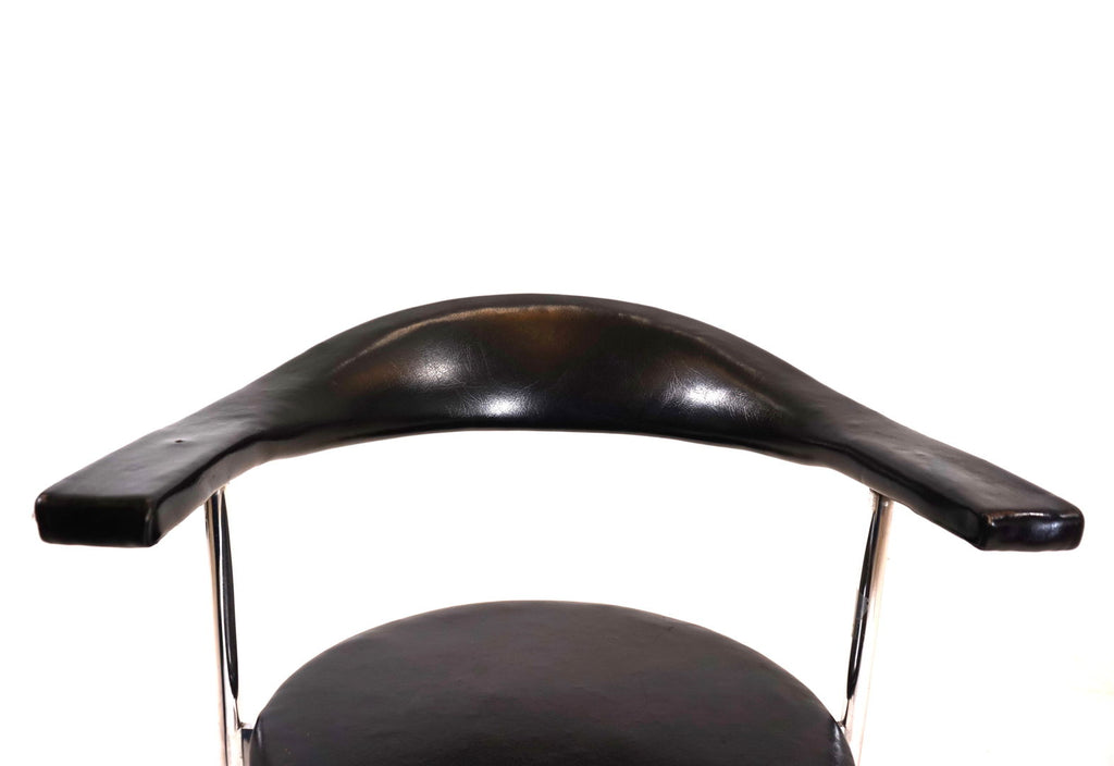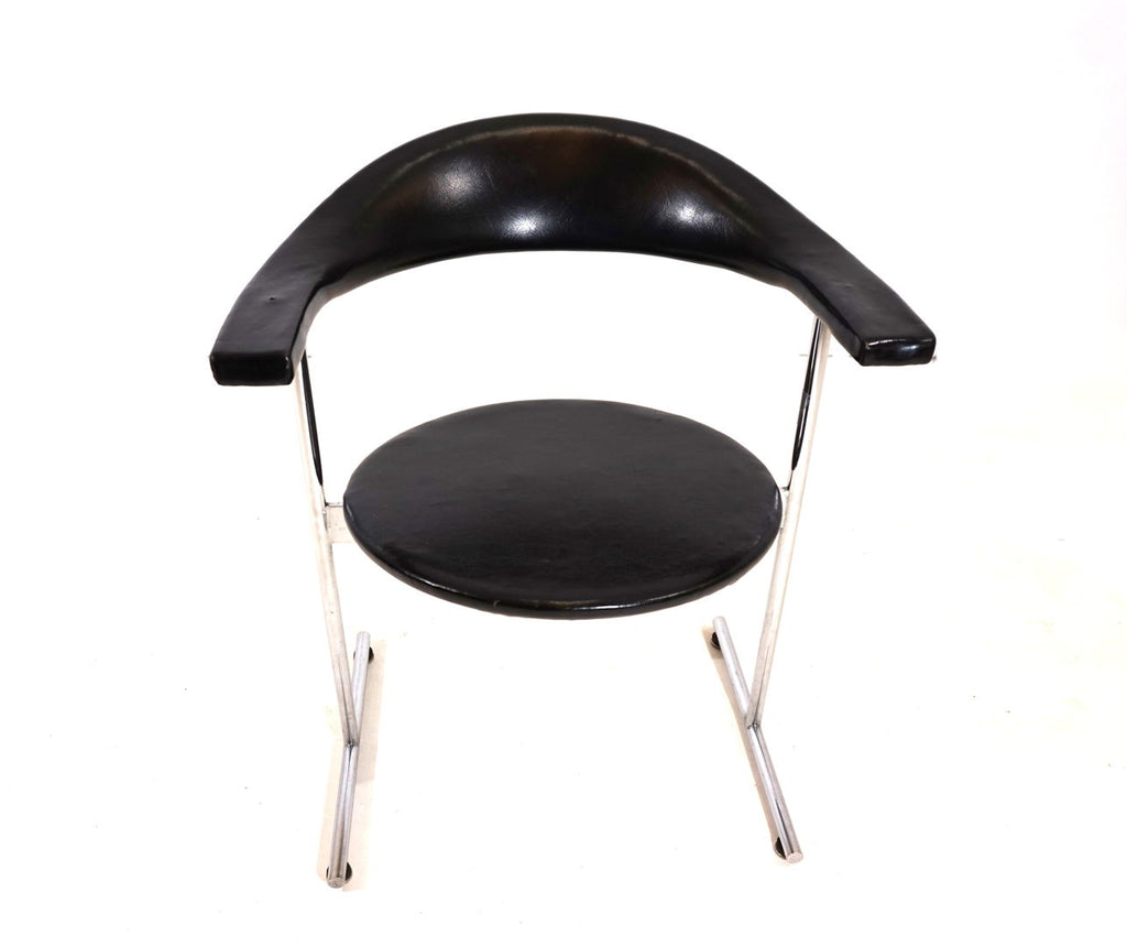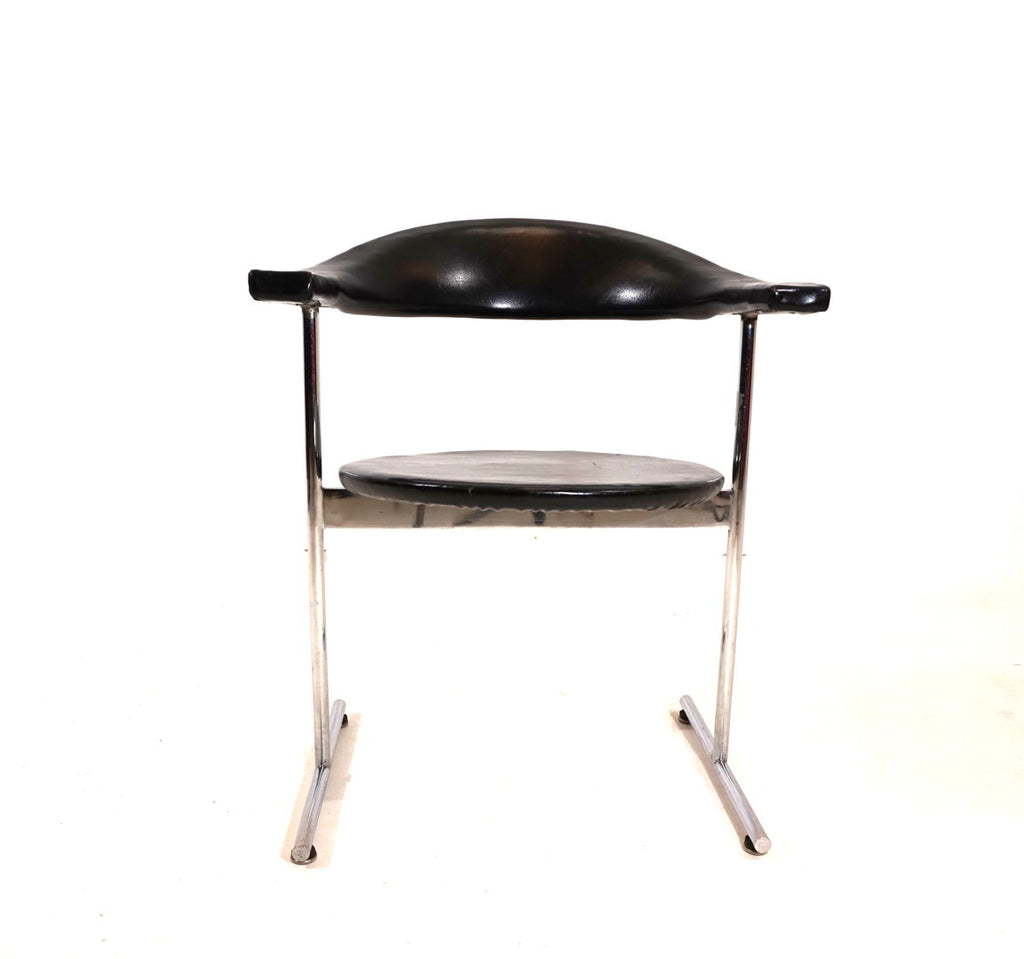The Airport 037 chair impresses with its unique and absolutely timeless design. This chair is in very good condition. The black original artificial leather is in very good condition with minimal signs of wear. The chrome frame has a patina typical of its age. Due to the lines of the armrests, the chair is also known as the bullhorn chair.