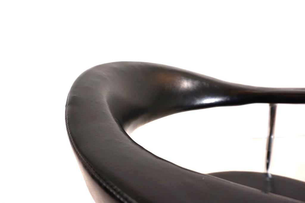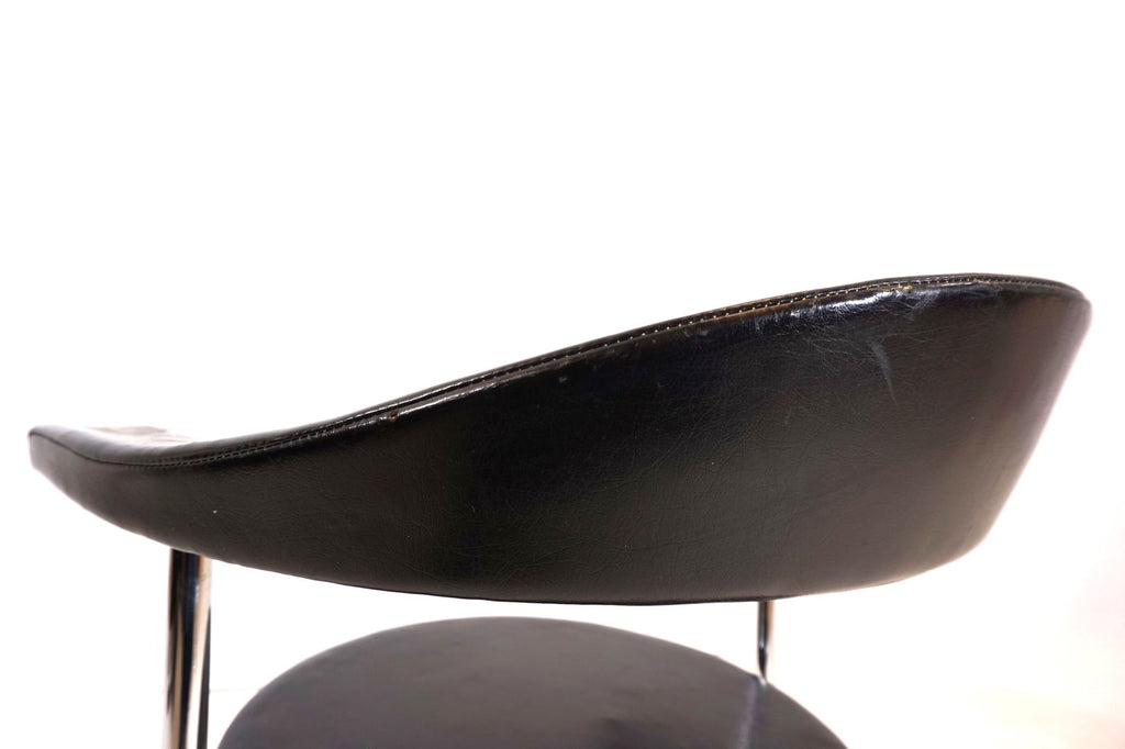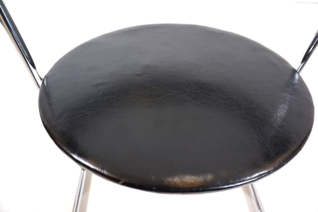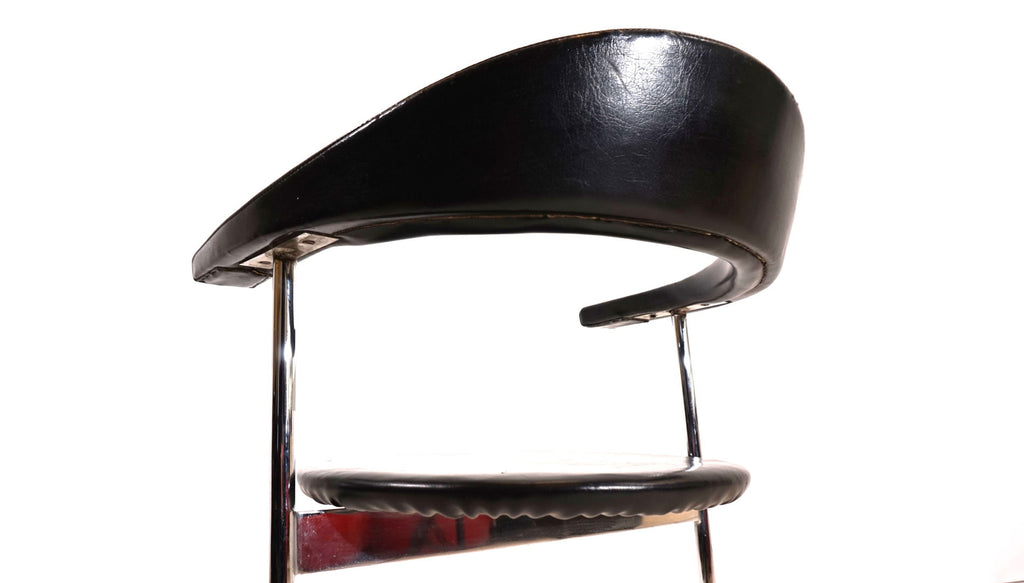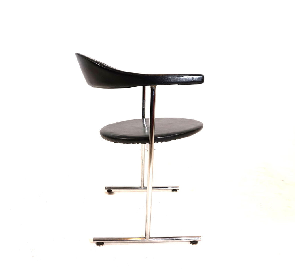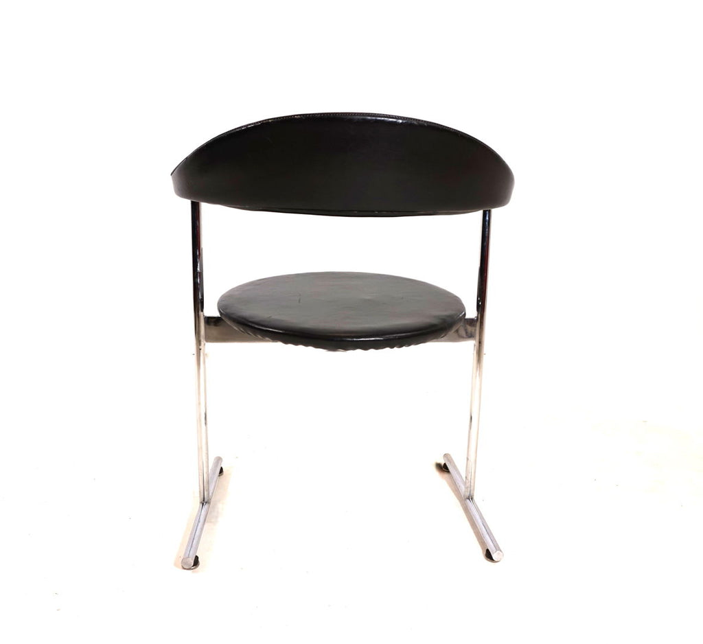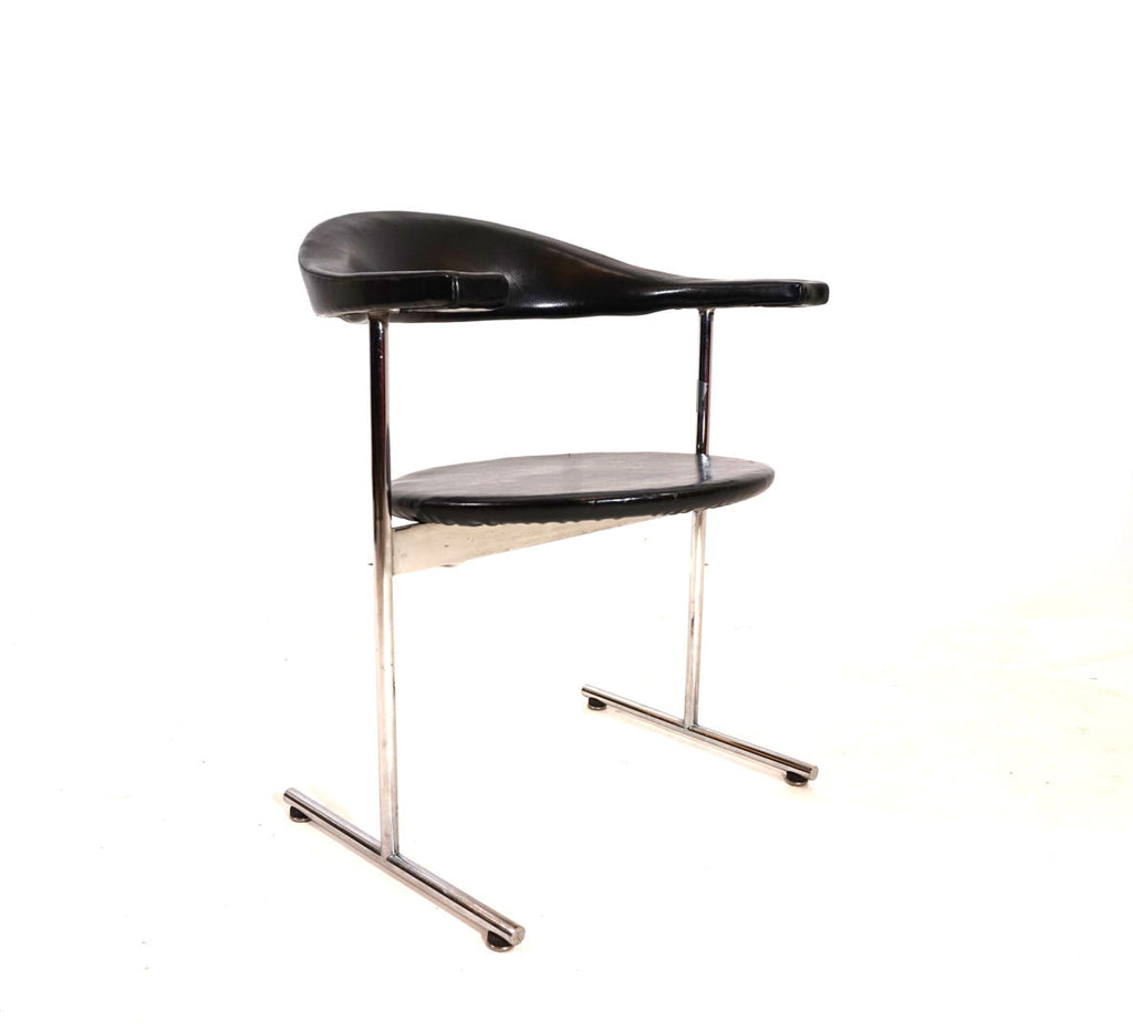 The Airport 037 chair impresses with its unique and absolutely timeless design. This chair is in very good condition. The black original artificial leather is in very good condition with minimal signs of wear. The chrome frame has a patina typical of its age. Due to the lines of the armrests, the chair is also known as the bullhorn chair.