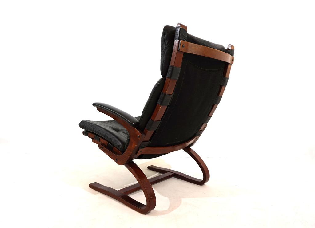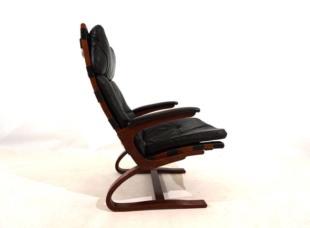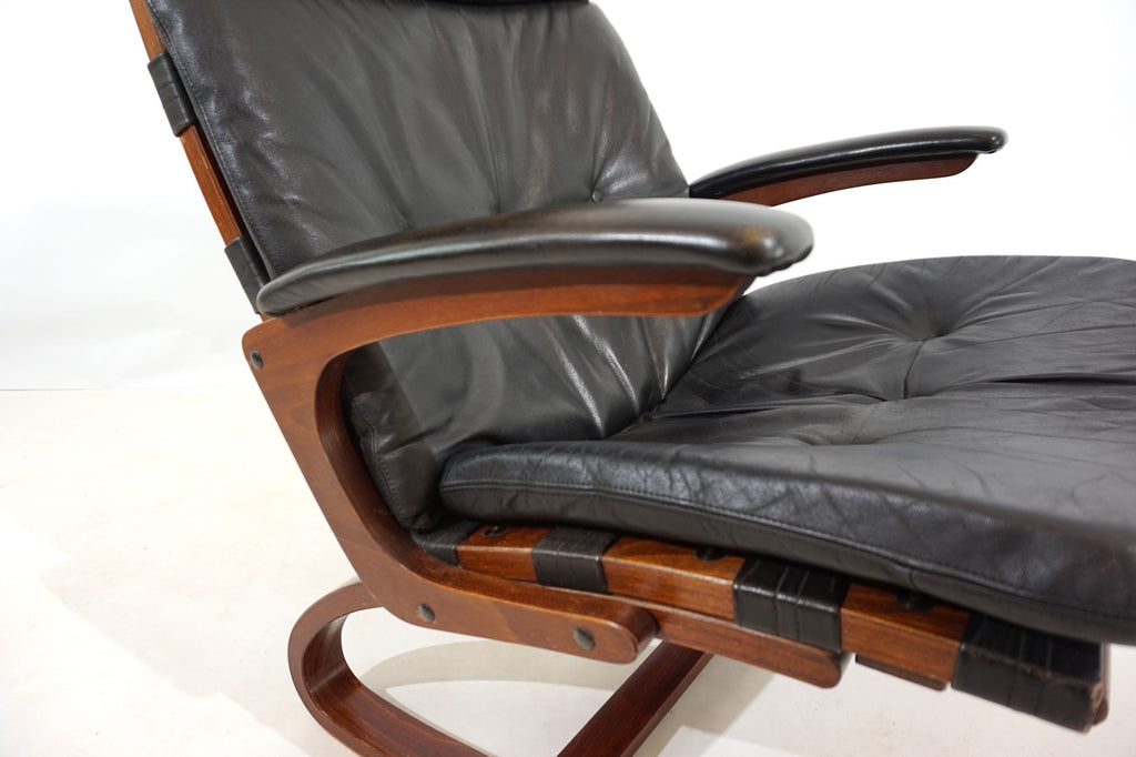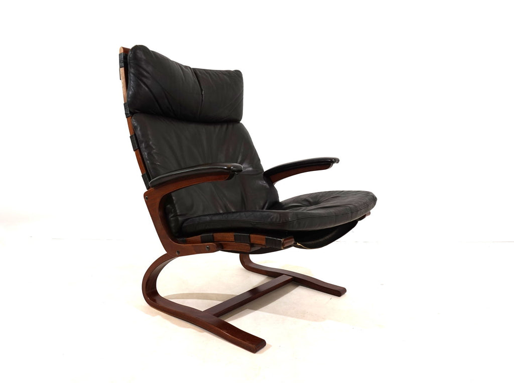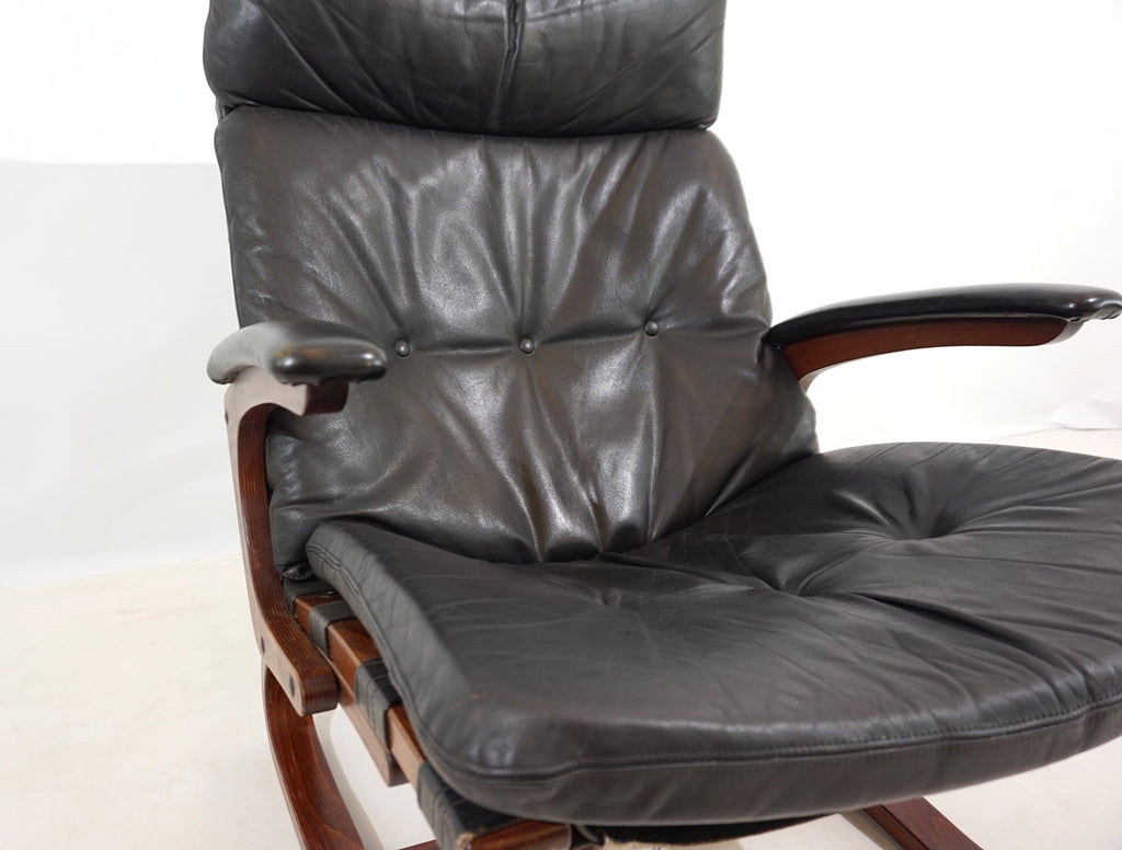 This Kengu comes in black leather with a teak-colored wooden frame and in the special version with armrests. The leather is in perfect condition with minimal signs of wear. The wooden frame shows slight signs of wear, especially on the back. The armchair is the model with a high backrest. Due to its swinging construction, the armchair is very comfortable and offers good seating comfort. In the 60s the Kengu armchair was designed by Elsa & Nordahl Solheim for the Norwegian manufacturer Rybo Rykken Furniture & Co. designed. It was produced until the 70s.