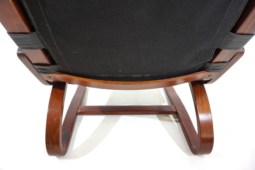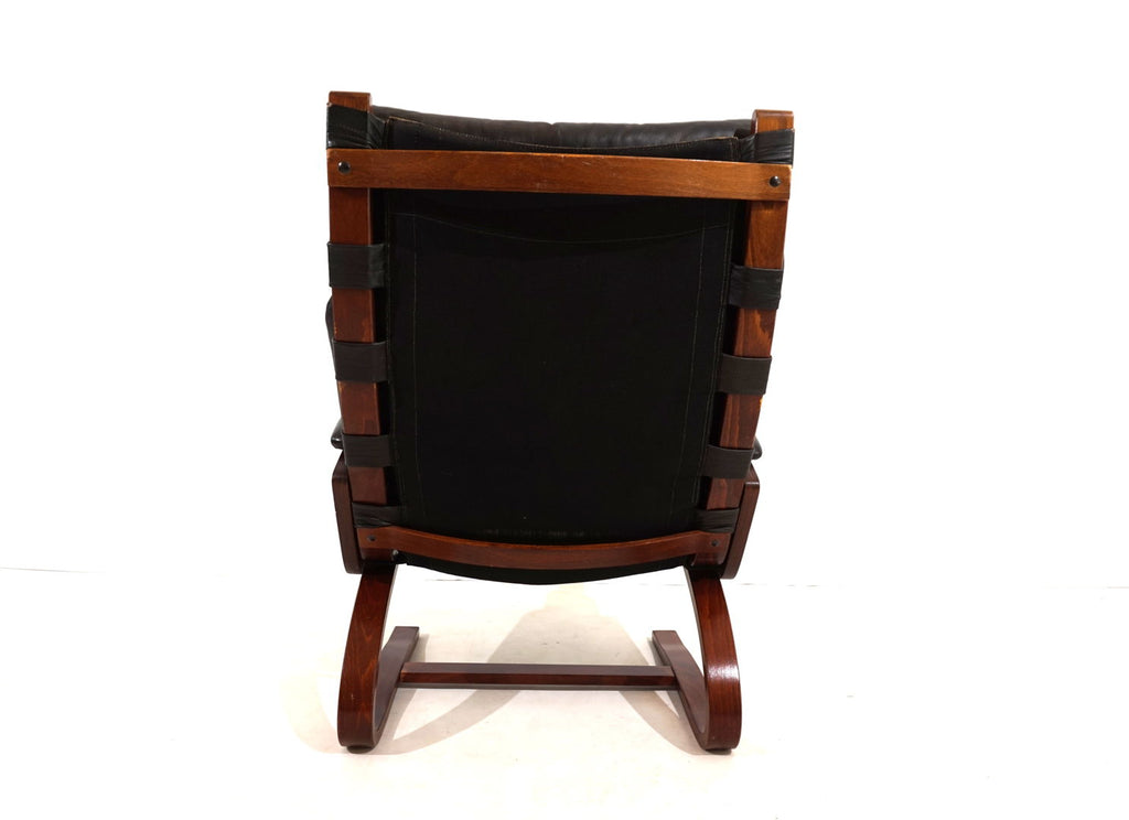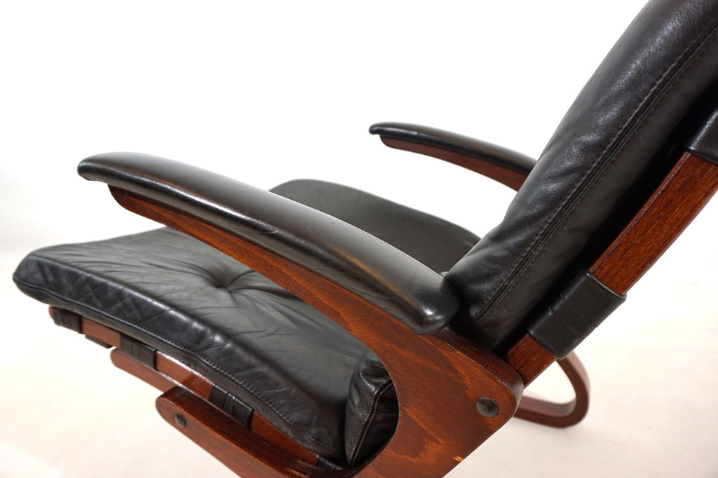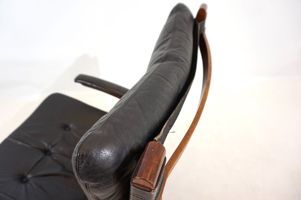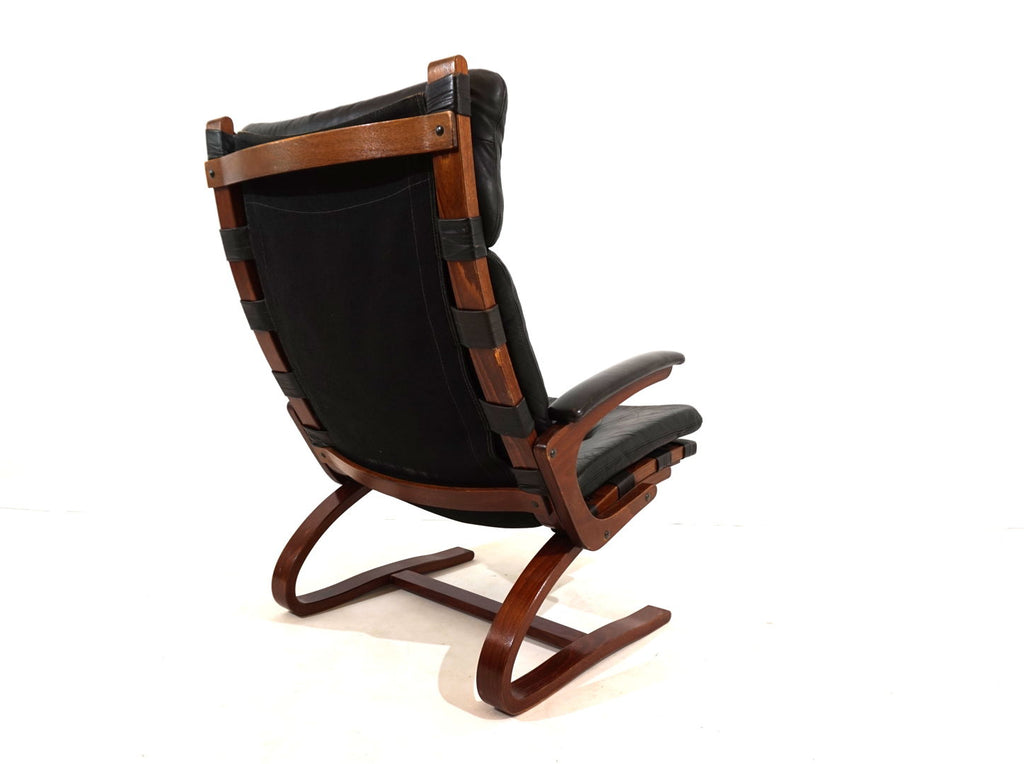 This Kengu comes in black leather with a teak-colored wooden frame and in the special version with armrests. The leather is in perfect condition with minimal signs of wear. The wooden frame shows slight signs of wear, especially on the back. The armchair is the model with a high backrest. Due to its swinging construction, the armchair is very comfortable and offers good seating comfort. In the 60s the Kengu armchair was designed by Elsa & Nordahl Solheim for the Norwegian manufacturer Rybo Rykken Furniture & Co. designed. It was produced until the 70s.