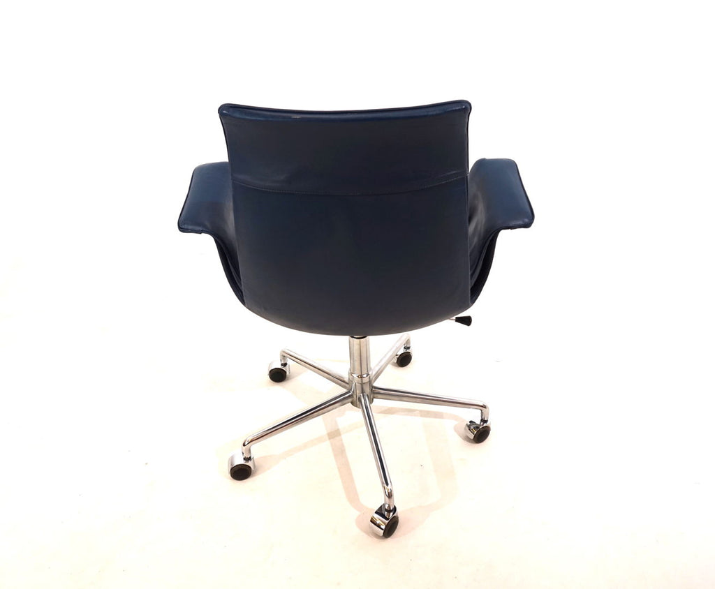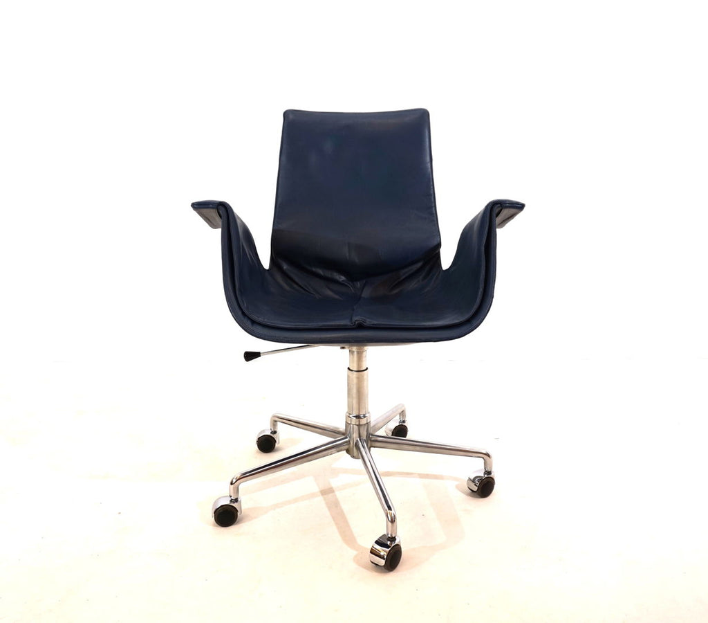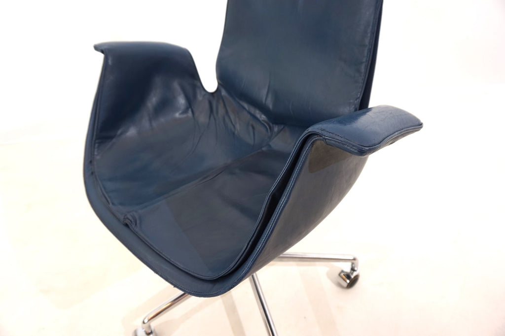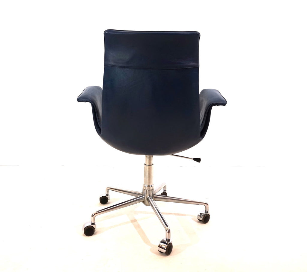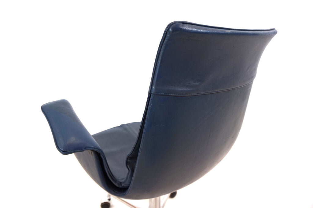 This Kill 6727, the so-called Bird or Tulip chair, is the hard-to-find version of an office chair with height adjustment. The blue leather comes in excellent condition with beautiful patina and minimal signs of wear. The chrome frame with smooth-running wheels shows hardly any signs of aging. The hydraulic height adjustment works perfectly and allows a seat height of 43 - 51 cm. This Kill version is the older original version designed by Kastholm&Fabricius for Alfred Kill International. These chairs were continued to be produced by Knoll in a later version. The designer duo Jorgen Kasthom & Preben Fabricius designed these chairs in the style of functional, aesthetic Scandinavian design in the 1960s and created an absolute design icon.