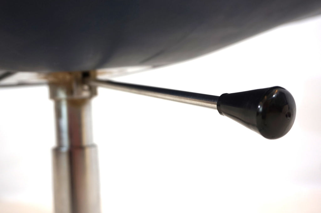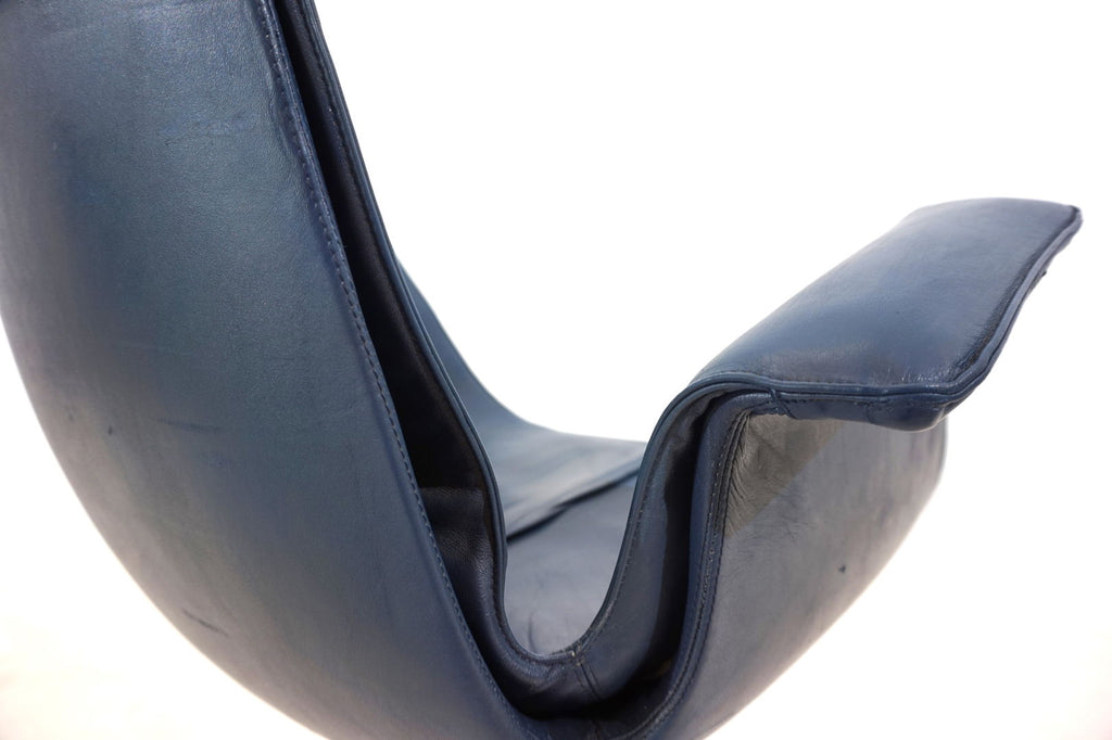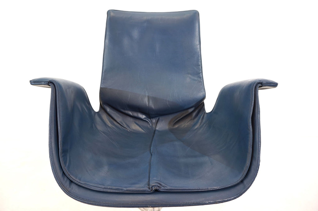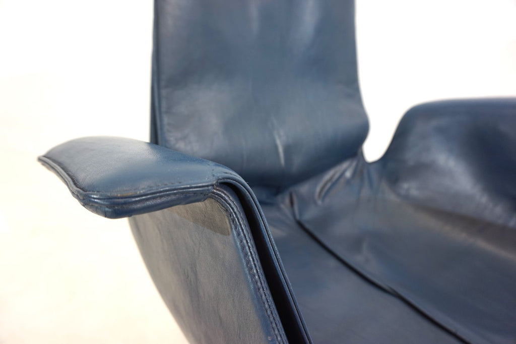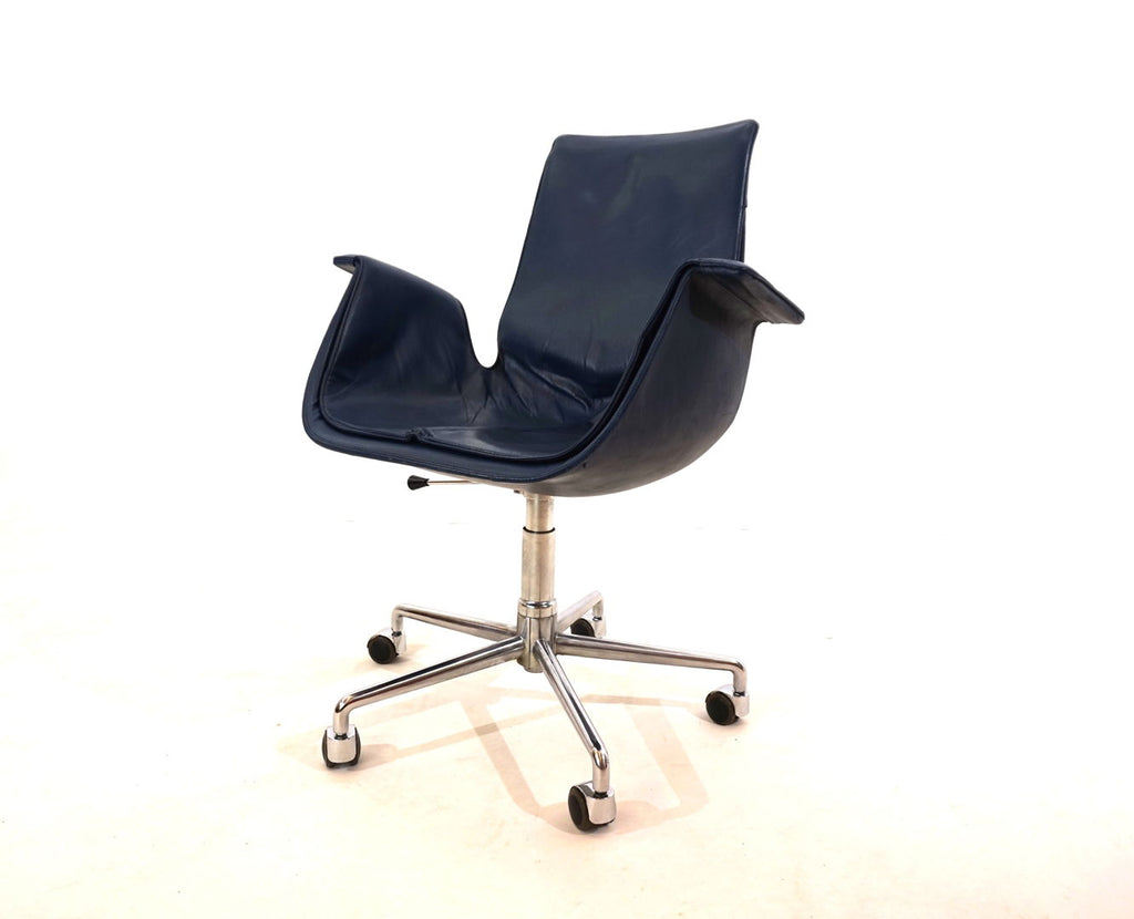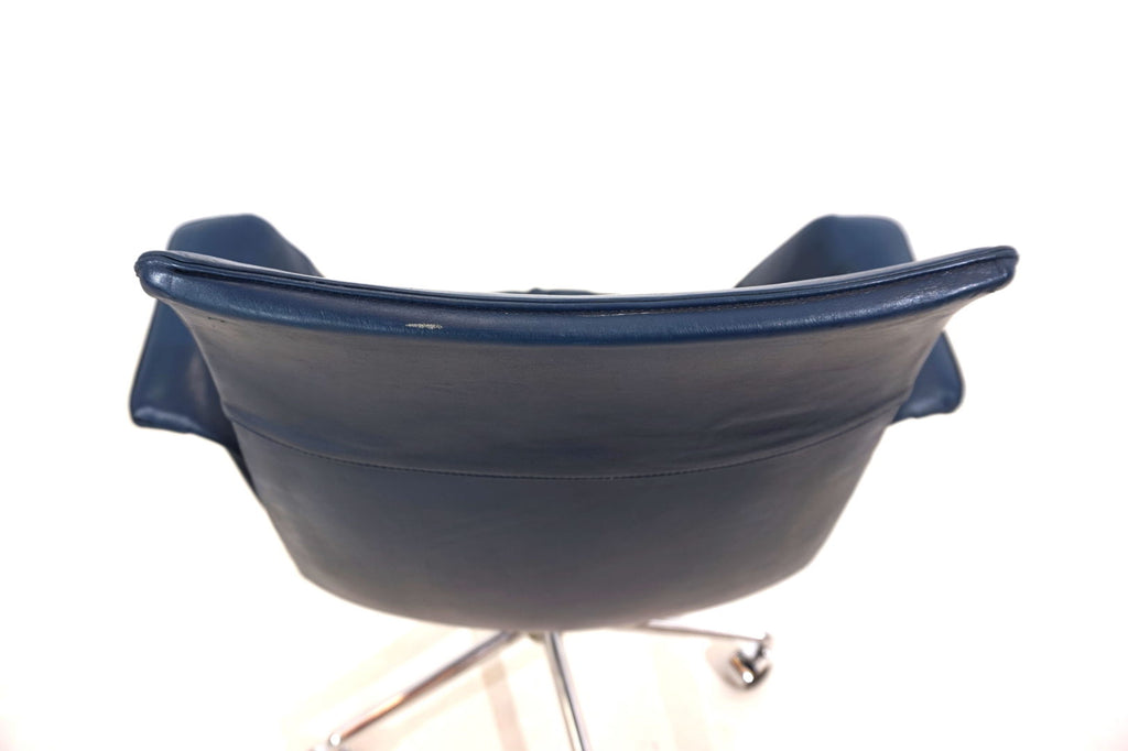 This Kill 6727, the so-called Bird or Tulip chair, is the hard-to-find version of an office chair with height adjustment. The blue leather comes in excellent condition with beautiful patina and minimal signs of wear. The chrome frame with smooth-running wheels shows hardly any signs of aging. The hydraulic height adjustment works perfectly and allows a seat height of 43 - 51 cm. This Kill version is the older original version designed by Kastholm&Fabricius for Alfred Kill International. These chairs were continued to be produced by Knoll in a later version. The designer duo Jorgen Kasthom & Preben Fabricius designed these chairs in the style of functional, aesthetic Scandinavian design in the 1960s and created an absolute design icon.