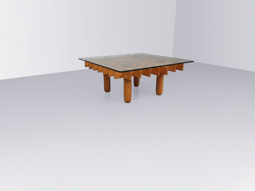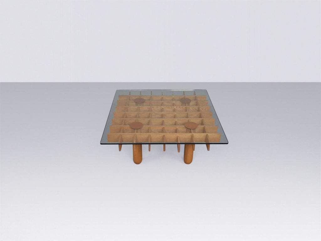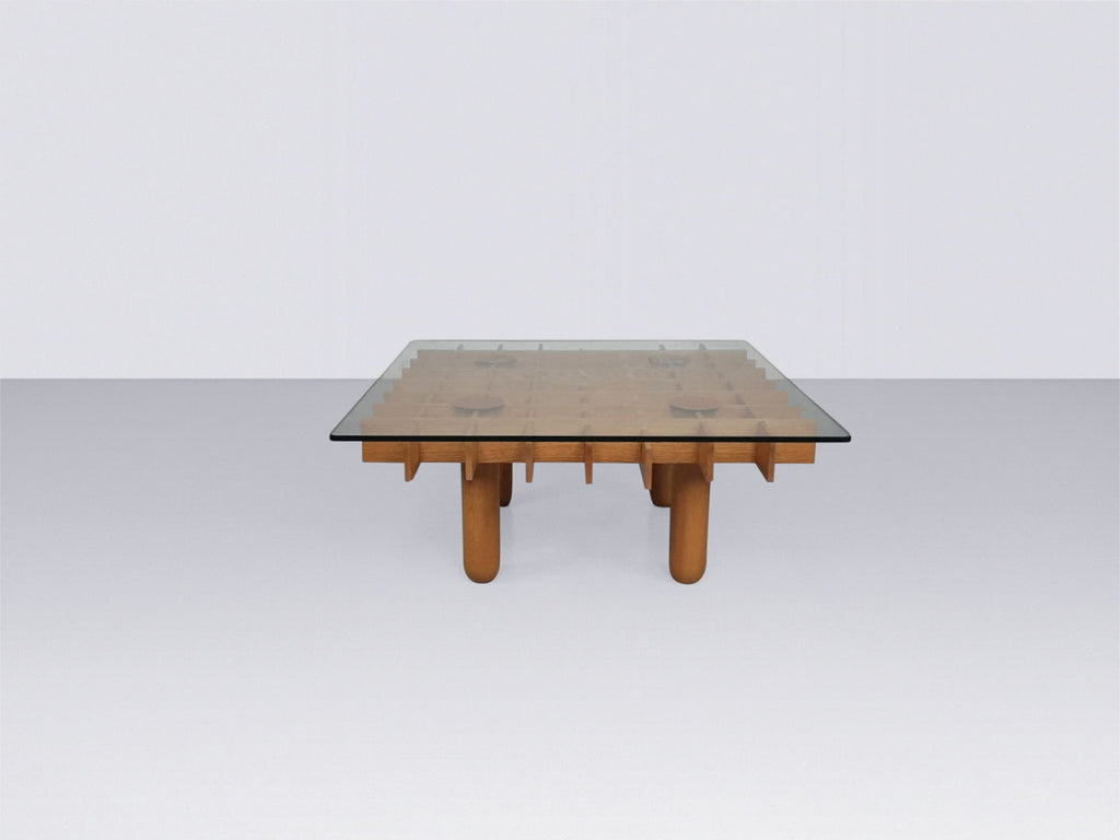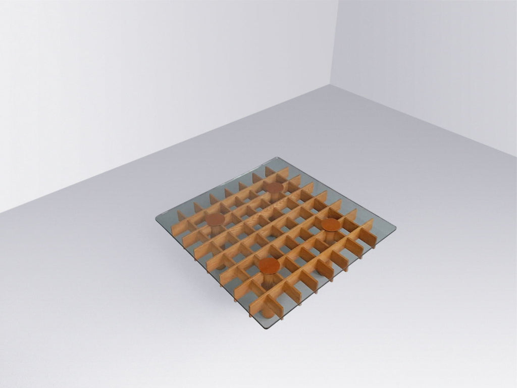 The frame is build up from maple wood and the horizontal and vertical beams provide a graphic grid. The beams can be disassembled and can be rearranged. The feet are seamlessly integrated in the frame and have a rounded shape. The thick glass plate doesn’t rest on the wooden frame but on 4 leather upholstered brown discs placed on top of the frame and that form an intermediary connection between glass top and wood frame.