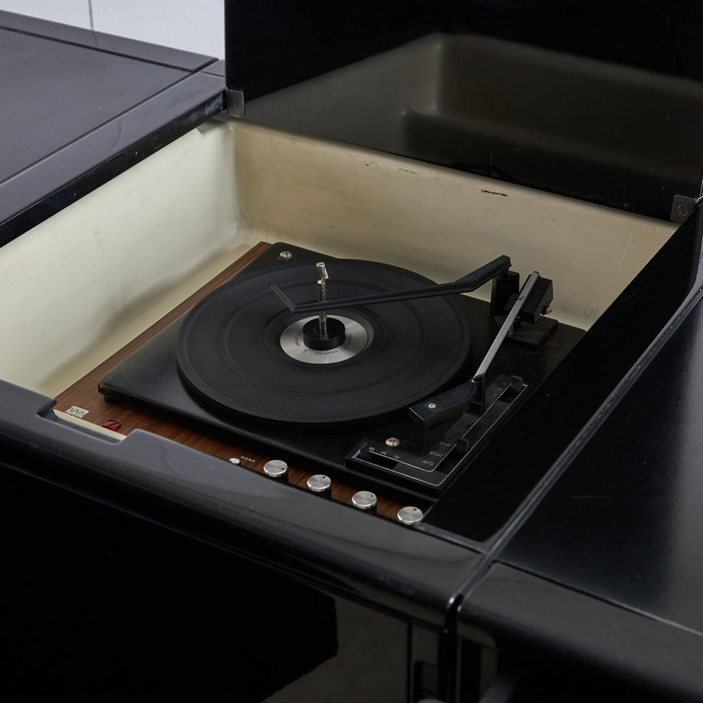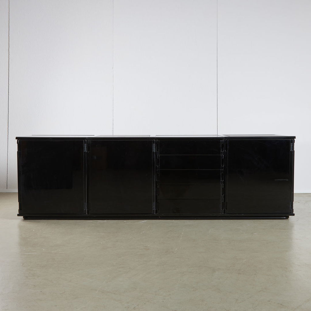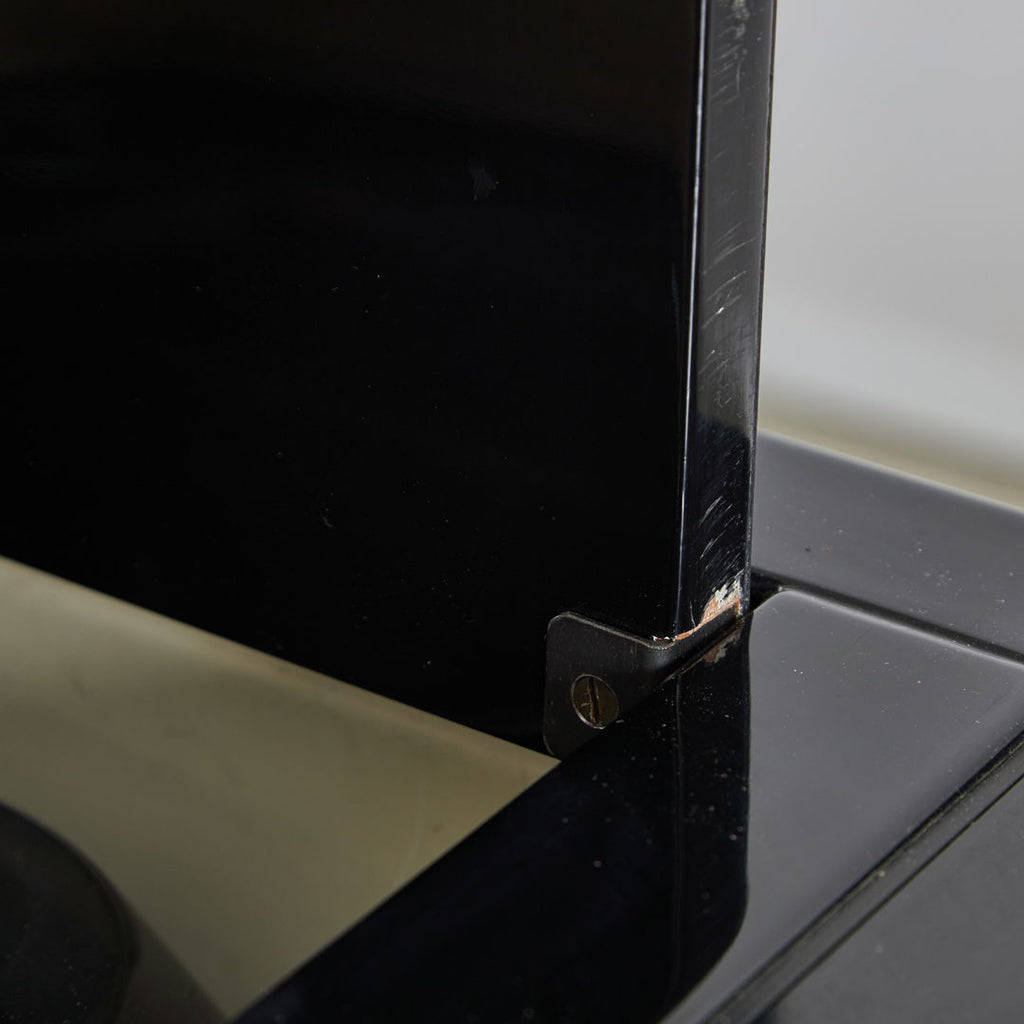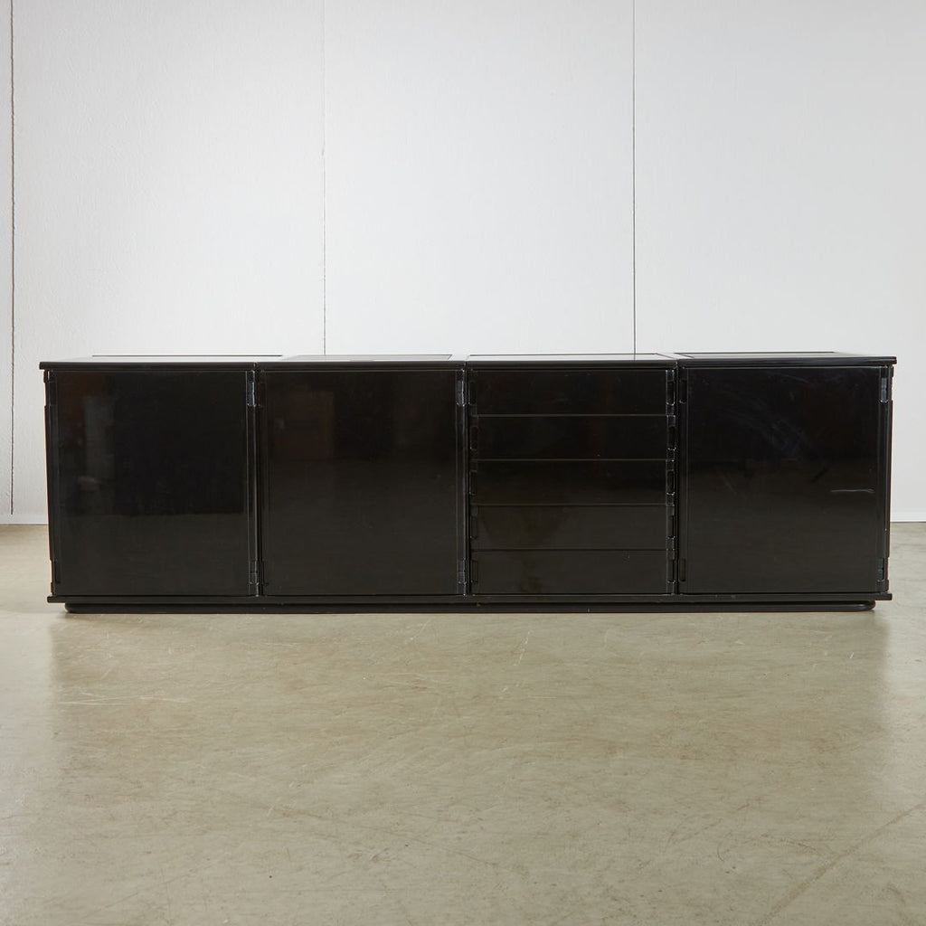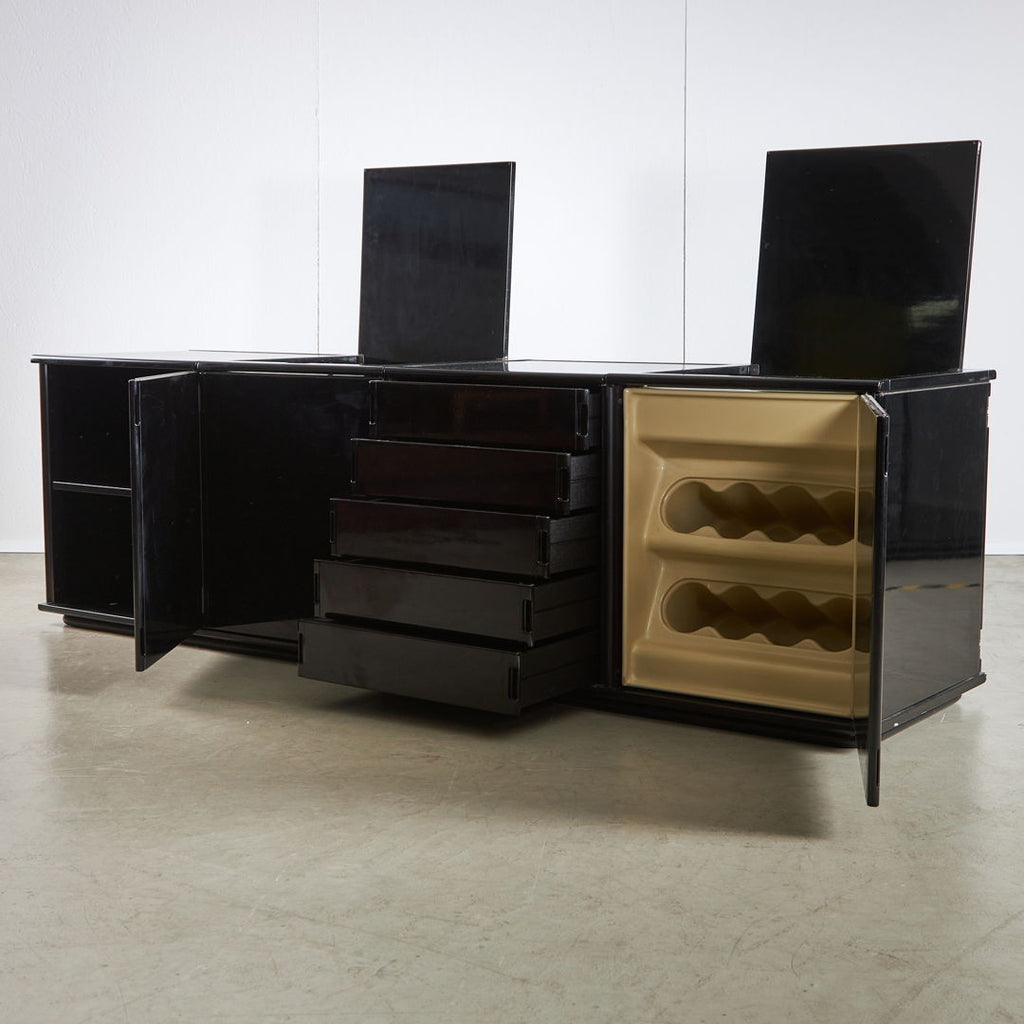 희귀한 Gianfranco Frattini Larco 시리즈의 Molteni 사이드보드는 블랙 래커와 고광택 아크릴 표면의 조합을 선보이며 상단 표면의 무광택 블랙 패널로 보완됩니다. 이 모듈형 케이스굿 시리즈는 삽입된 관형 금속 베이스에 함께 결합된 4개의 부품으로 구성됩니다. 사이드보드는 서랍, 문, 병 걸이, 성형 플라스틱 사운드 시스템 내부를 수용하는 플립 탑이 있는 중간 베이 등 다양한 보관 옵션을 제공합니다. 또한 플립 탑 바로 아래에 작동하는 비닐 플레이어가 있습니다. 서랍과 문에는 매끄러운 매립형 손잡이가 장착되어 있어 세련된 외관을 더욱 돋보이게 합니다. 이 품목은 모든 기능을 갖추고 있으며 좋은 빈티지 상태입니다. 사진에서 볼 수 있듯이 세월과 사용에 따른 긁힘과 마모 흔적이 발견될 수 있습니다.