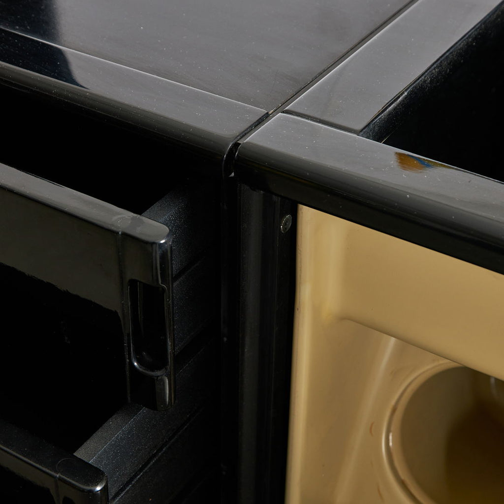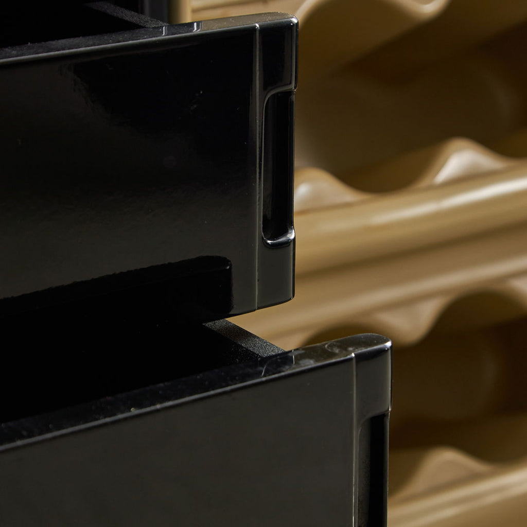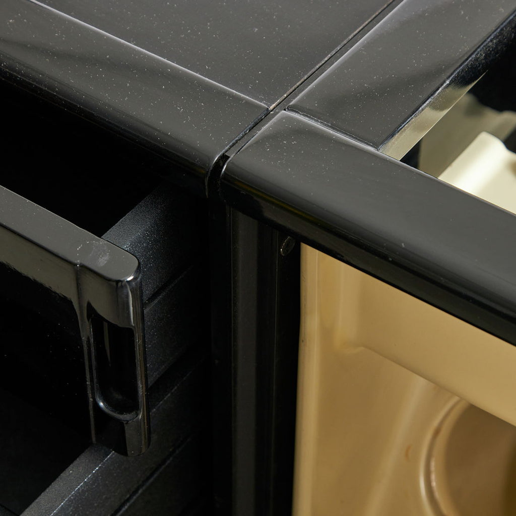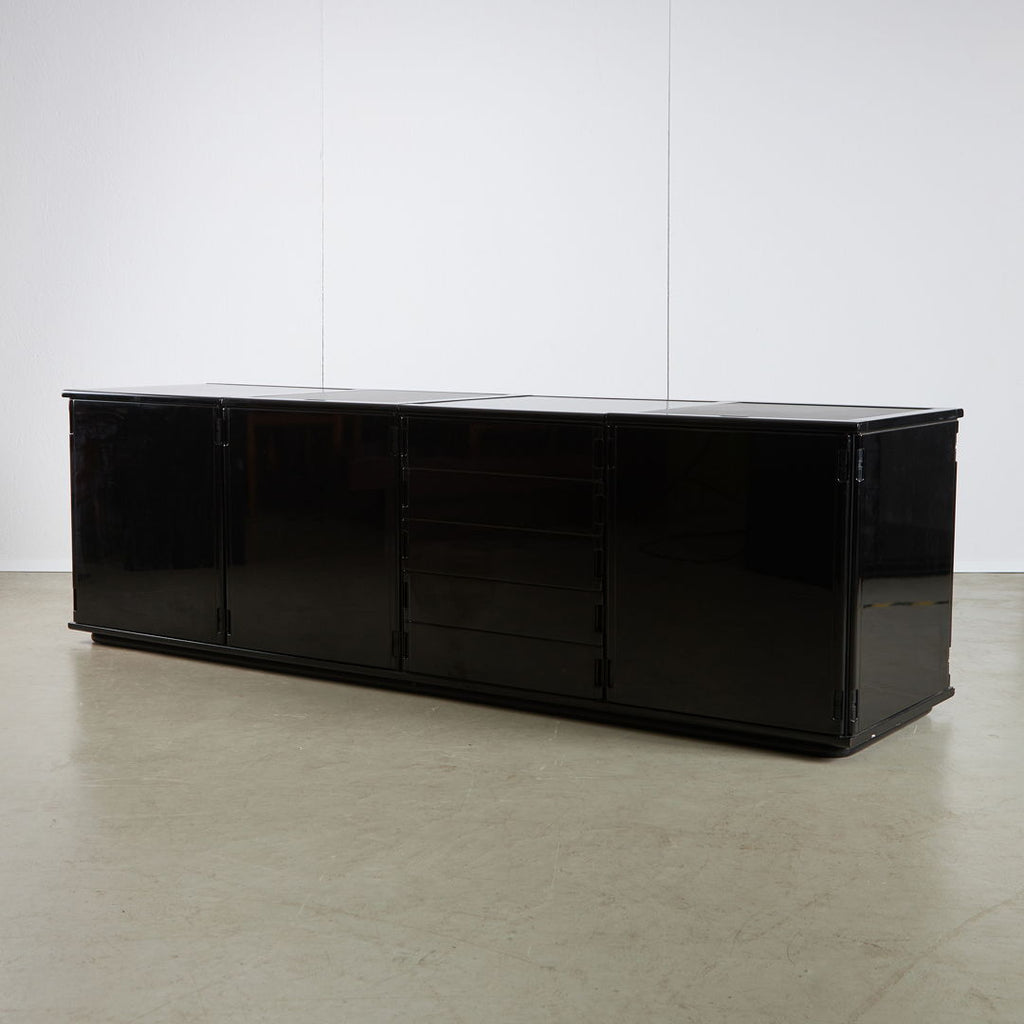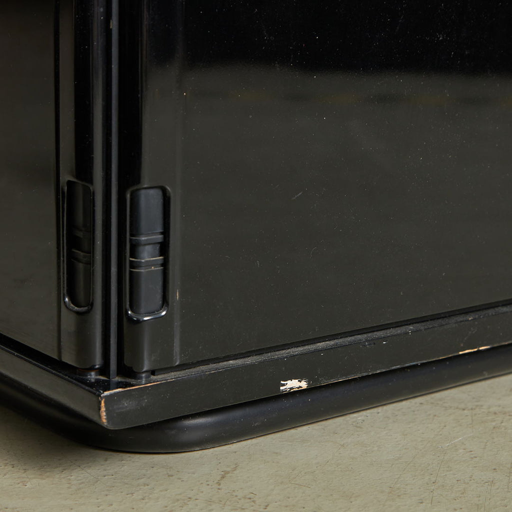 희귀한 Gianfranco Frattini Larco 시리즈의 Molteni 사이드보드는 블랙 래커와 고광택 아크릴 표면의 조합을 선보이며 상단 표면의 무광택 블랙 패널로 보완됩니다. 이 모듈형 케이스굿 시리즈는 삽입된 관형 금속 베이스에 함께 결합된 4개의 부품으로 구성됩니다. 사이드보드는 서랍, 문, 병 걸이, 성형 플라스틱 사운드 시스템 내부를 수용하는 플립 탑이 있는 중간 베이 등 다양한 보관 옵션을 제공합니다. 또한 플립 탑 바로 아래에 작동하는 비닐 플레이어가 있습니다. 서랍과 문에는 매끄러운 매립형 손잡이가 장착되어 있어 세련된 외관을 더욱 돋보이게 합니다. 이 품목은 모든 기능을 갖추고 있으며 좋은 빈티지 상태입니다. 사진에서 볼 수 있듯이 세월과 사용에 따른 긁힘과 마모 흔적이 발견될 수 있습니다.