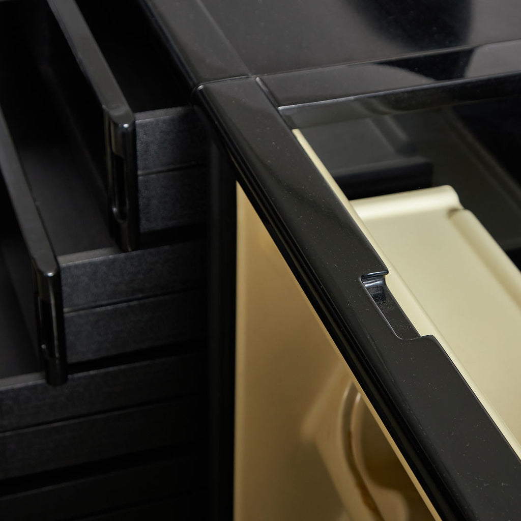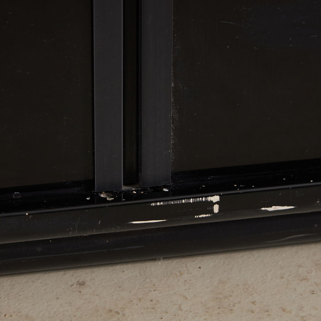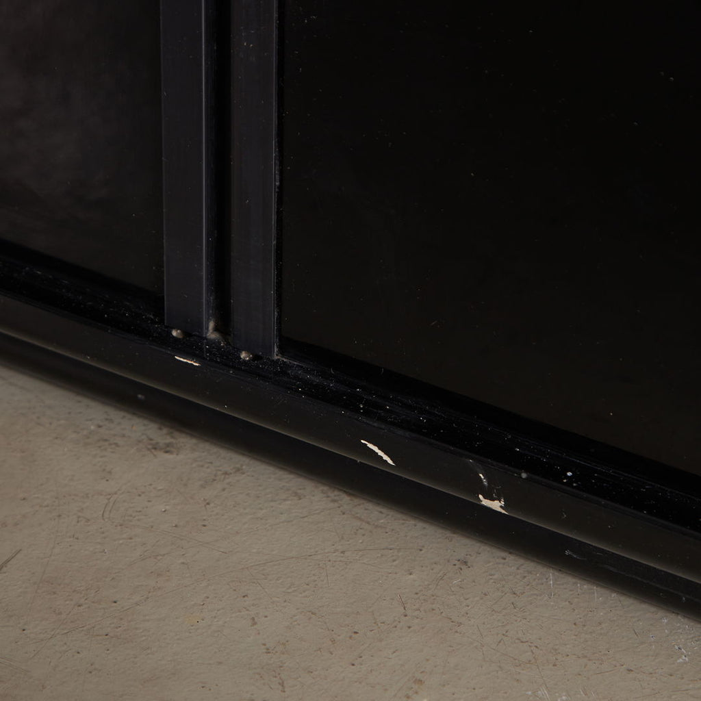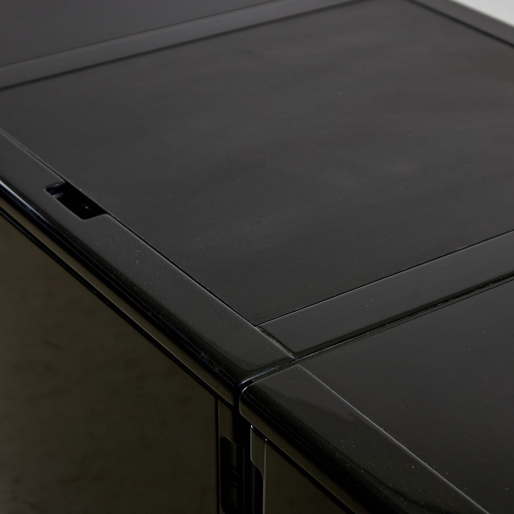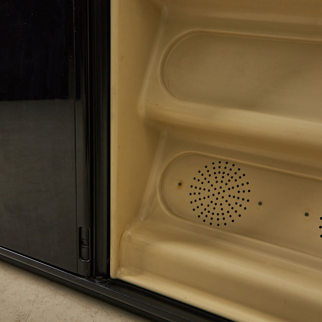 희귀한 Gianfranco Frattini Larco 시리즈의 Molteni 사이드보드는 블랙 래커와 고광택 아크릴 표면의 조합을 선보이며 상단 표면의 무광택 블랙 패널로 보완됩니다. 이 모듈형 케이스굿 시리즈는 삽입된 관형 금속 베이스에 함께 결합된 4개의 부품으로 구성됩니다. 사이드보드는 서랍, 문, 병 걸이, 성형 플라스틱 사운드 시스템 내부를 수용하는 플립 탑이 있는 중간 베이 등 다양한 보관 옵션을 제공합니다. 또한 플립 탑 바로 아래에 작동하는 비닐 플레이어가 있습니다. 서랍과 문에는 매끄러운 매립형 손잡이가 장착되어 있어 세련된 외관을 더욱 돋보이게 합니다. 이 품목은 모든 기능을 갖추고 있으며 좋은 빈티지 상태입니다. 사진에서 볼 수 있듯이 세월과 사용에 따른 긁힘과 마모 흔적이 발견될 수 있습니다.