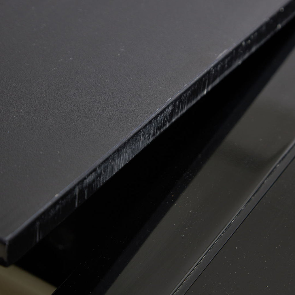 The Molteni sideboard from the rare Gianfranco Frattini Larco Series showcases a combination of black lacquer and high gloss acrylic surfaces, which are complemented by matte black panels on the top surface. This modular casegood series consists of four pieces joined together on an inset tubular metal base. The sideboard offers various storage options such as drawers, doors, a bottle rack, and a middle bay with a flip top that houses a molded plastic sound system interior. Additionally, it features a functioning vinyl player positioned just below the flip top. The drawers and doors are equipped with seamless recessed pulls, enhancing their sleek appearance. The item is fully functional and is in a nice vintage condition, scratches and signs of wear consistent with age and use can be spotted, as seen on the photos.