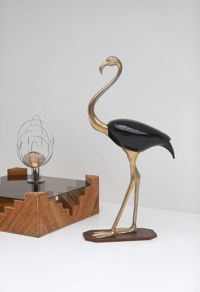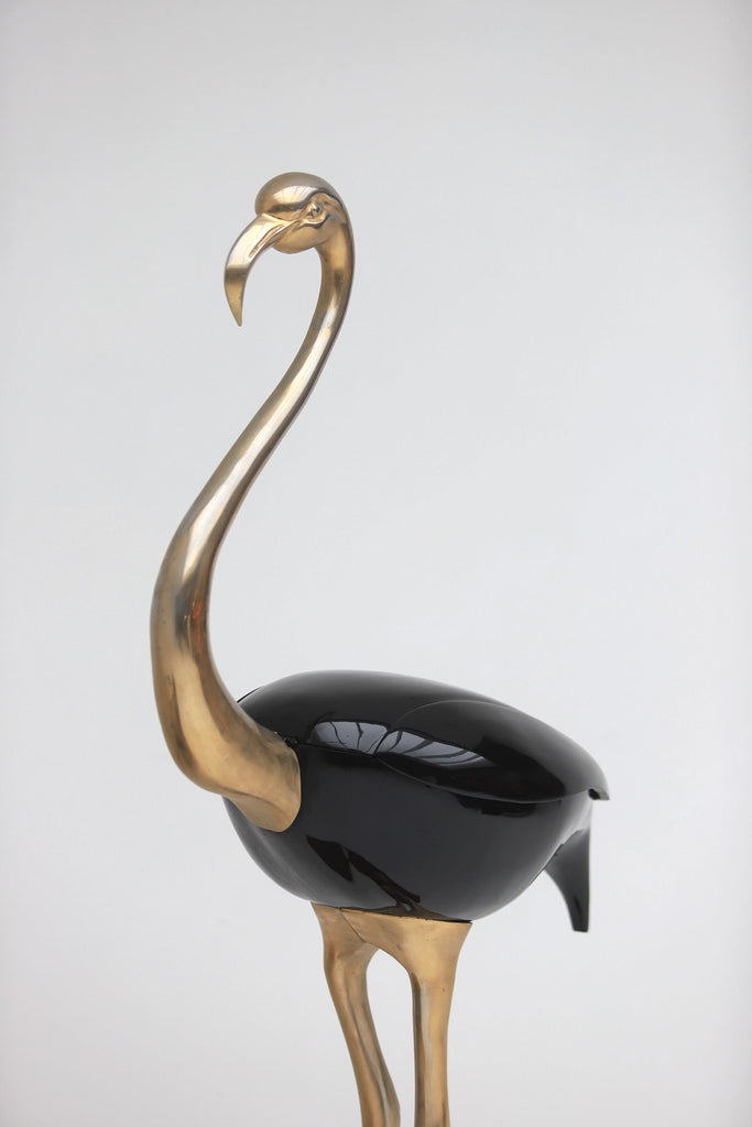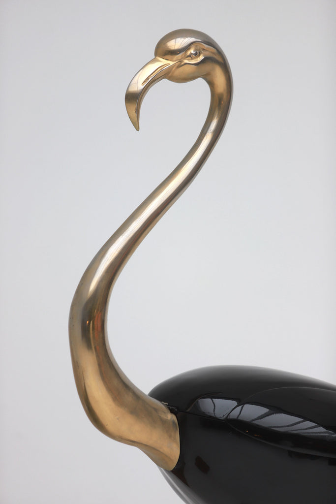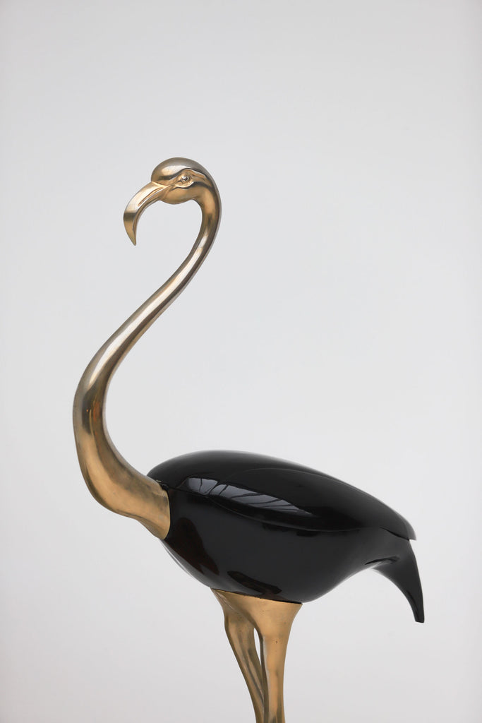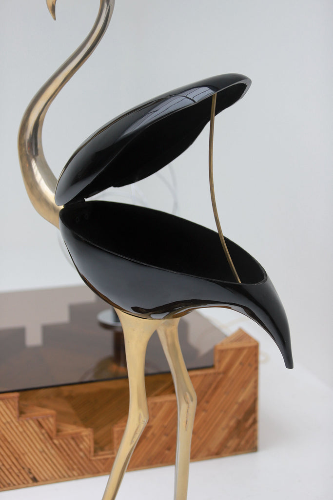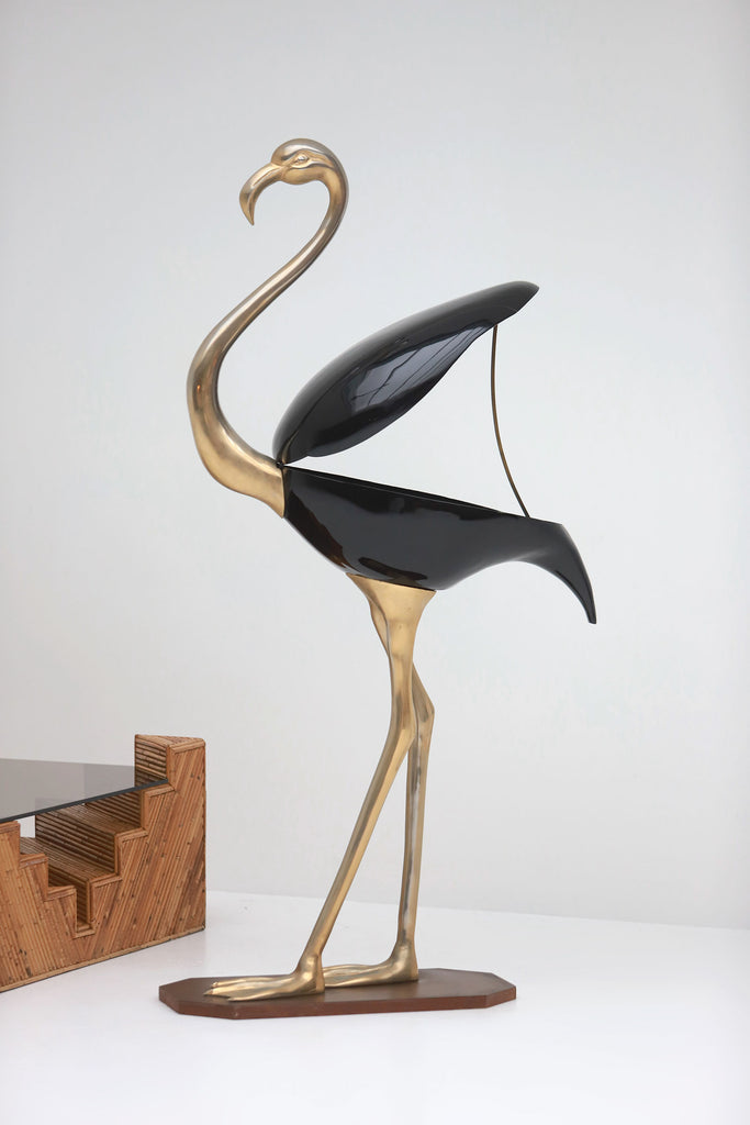 1970년 프랑스 폰디카(Fondica)의 대형 플라밍고 조각. 조각품은 완전히 황동으로 만들어졌으며 검은색 래커 처리된 보관함이 있습니다. 덮개를 열 때 원래 금속 지지대가 날개 아래의 구획이 열린 상태를 유지하는 데 도움이 됩니다. 컴파트먼트 내부는 블랙 벨벳으로 안감 처리되어 있습니다. Fondica가 제작한 시리즈 중 가장 큰 실물 크기 플라밍고입니다. 이 장식용 새는 실제 중심이며 입구, 침실 또는 거실에 적합합니다. 매우 장식적인 가치와 더불어 다양한 용도로 활용되고 있습니다. 플라밍고는 상태가 매우 좋으며 첫 번째 소유자로부터 왔습니다. 이 장식용 집에서 더 많은 항목을 찾을 수 있습니다. 웹 사이트에서 곧 사용할 수 있습니다.