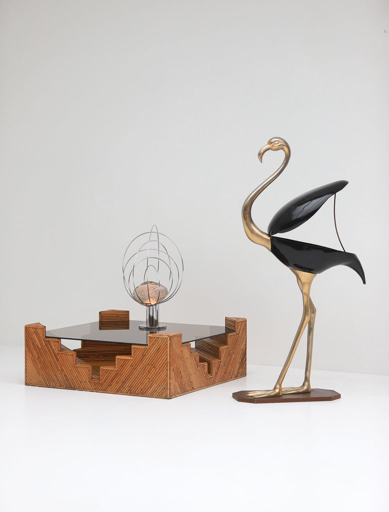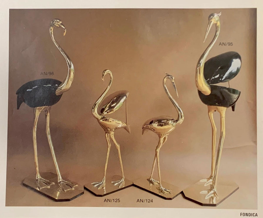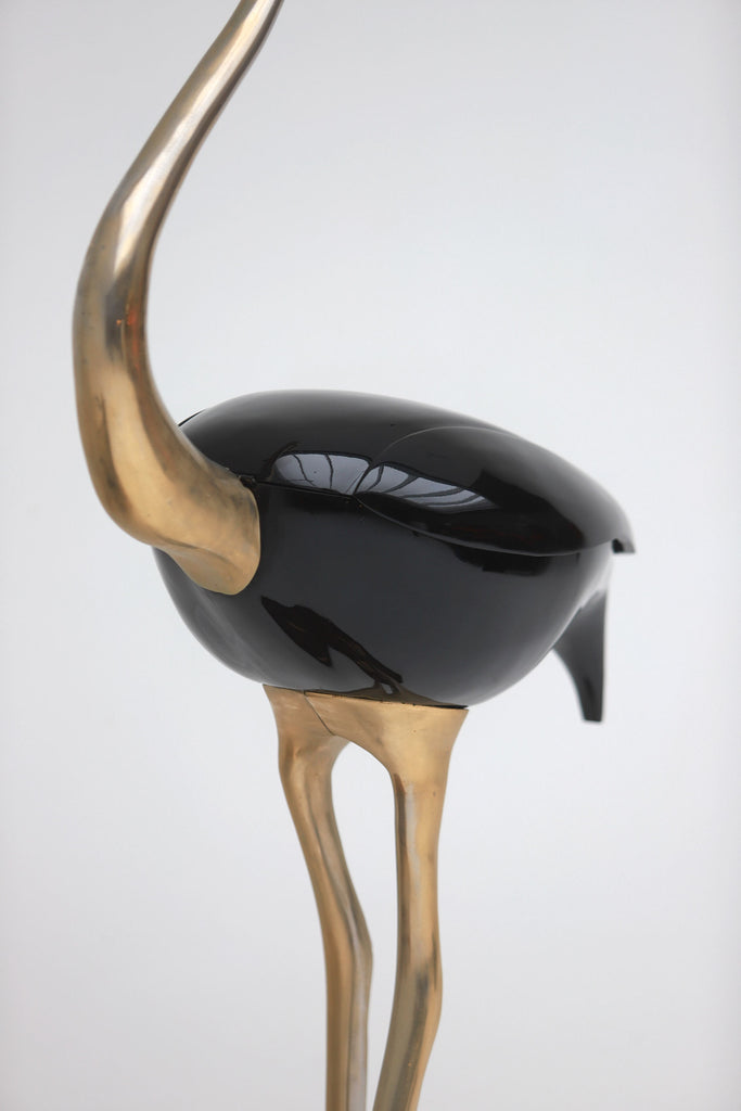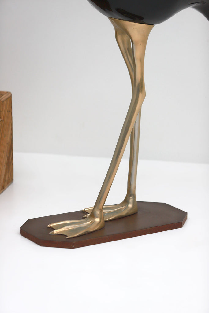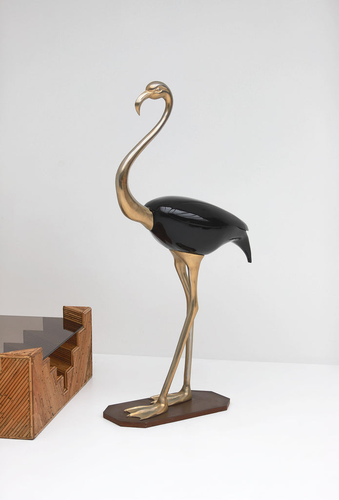 1970년 프랑스 폰디카(Fondica)의 대형 플라밍고 조각. 조각품은 완전히 황동으로 만들어졌으며 검은색 래커 처리된 보관함이 있습니다. 덮개를 열 때 원래 금속 지지대가 날개 아래의 구획이 열린 상태를 유지하는 데 도움이 됩니다. 컴파트먼트 내부는 블랙 벨벳으로 안감 처리되어 있습니다. Fondica가 제작한 시리즈 중 가장 큰 실물 크기 플라밍고입니다. 이 장식용 새는 실제 중심이며 입구, 침실 또는 거실에 적합합니다. 매우 장식적인 가치와 더불어 다양한 용도로 활용되고 있습니다. 플라밍고는 상태가 매우 좋으며 첫 번째 소유자로부터 왔습니다. 이 장식용 집에서 더 많은 항목을 찾을 수 있습니다. 웹 사이트에서 곧 사용할 수 있습니다.