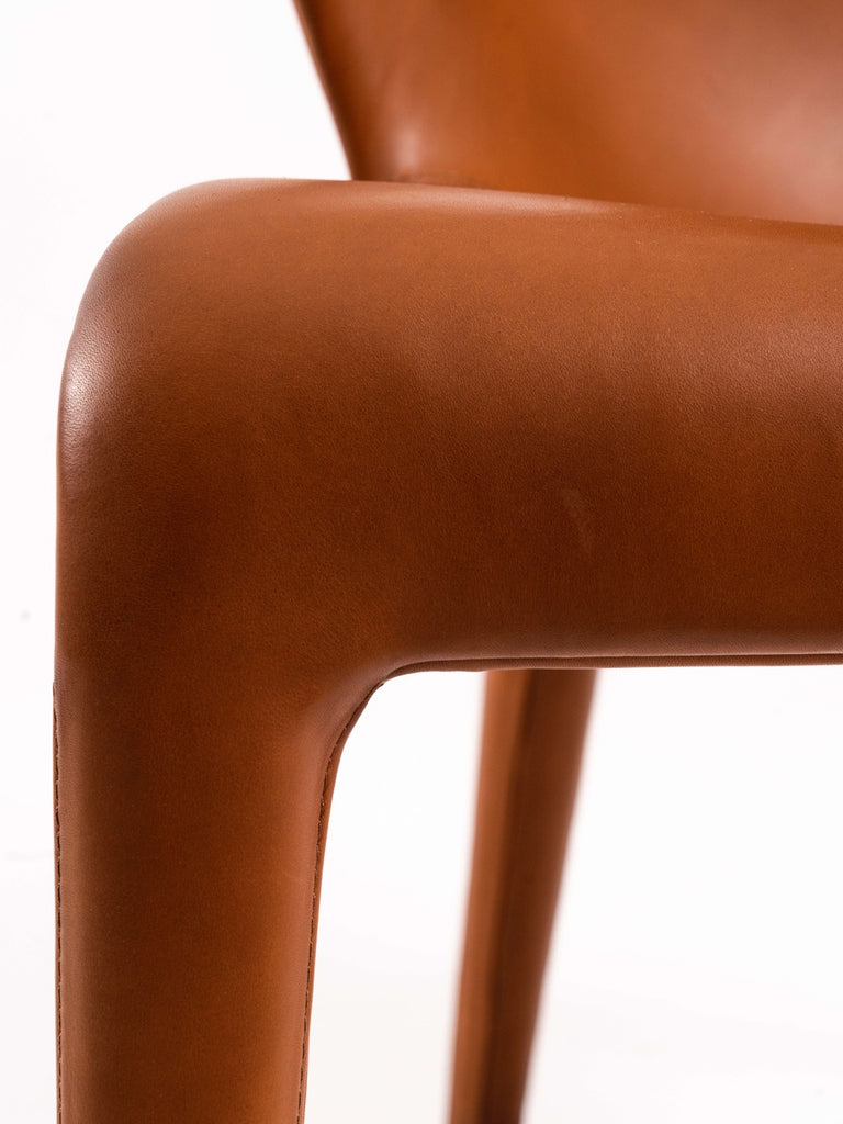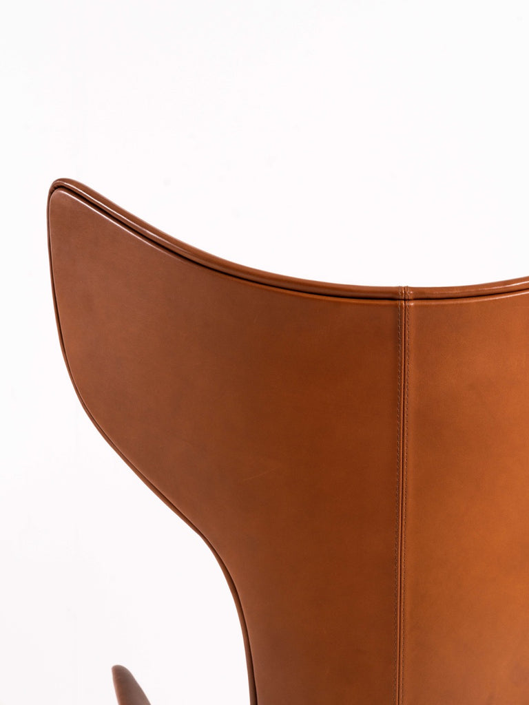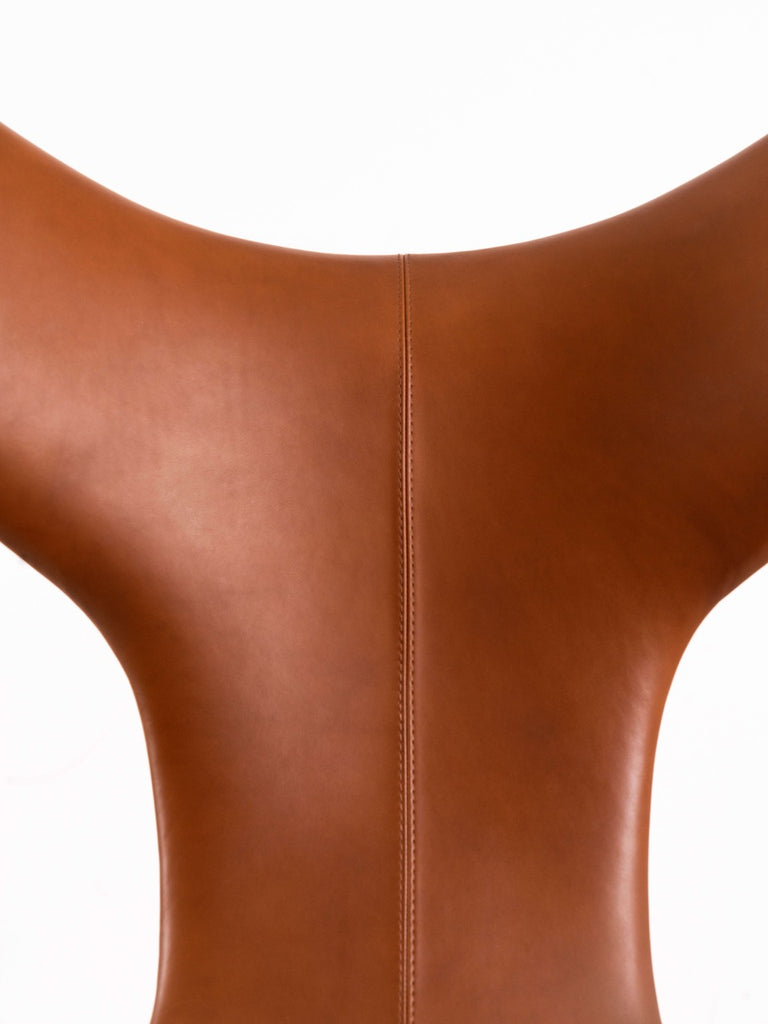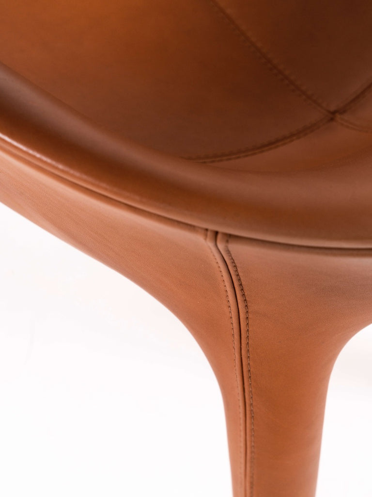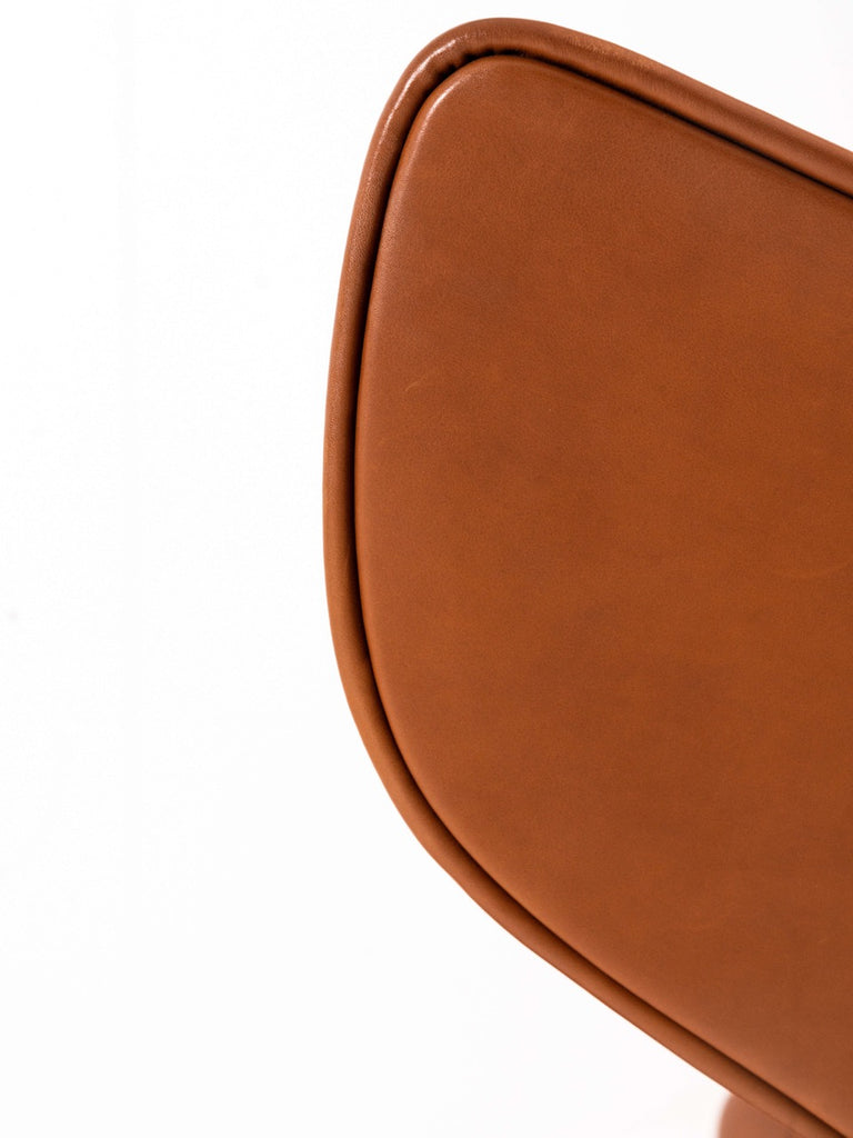 내부는 금속과 폴리우레탄으로 구성된 구조이며 외부는 고급 가죽커버로 제작되었습니다. 이 '브라운/탠' 컬러는 정말 따뜻하고 고급스러운 느낌을 줍니다. 이 의자는 상태가 양호하며 의자 밑부분에 브랜드 로고를 확인할 수 있습니다.