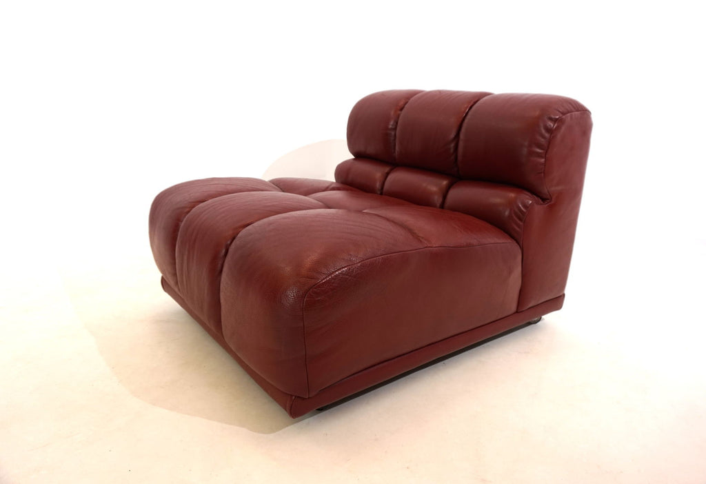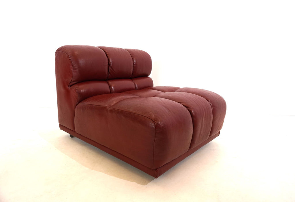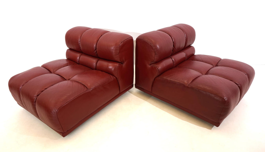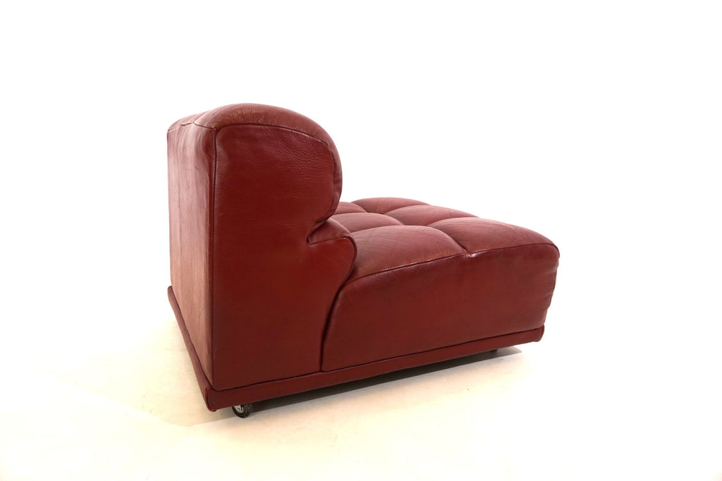 모듈형 안락의자 2개 세트는 상태가 아주 좋습니다. 가죽은 매우 고품질이며 두껍고 동시에 부드러운 품질입니다. 솔기가 고품질입니다. 카세트에 깊은 상처가 있는 선은 이탈리아 제조업체를 나타냅니다. 의자에는 바퀴가 부드럽게 돌아가기 때문에 쉽게 움직일 수 있습니다. 좌석은 매우 넓어서 안락의자를 넓은 2인용 의자로 사용하거나 개별 품목으로 사용할 수 있습니다. 환상적인 빨간색 색상을 지닌 이 안락의자는 어느 방에서나 하이라이트가 되며 아마도 70년대에 제작되었을 것입니다.