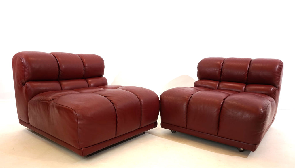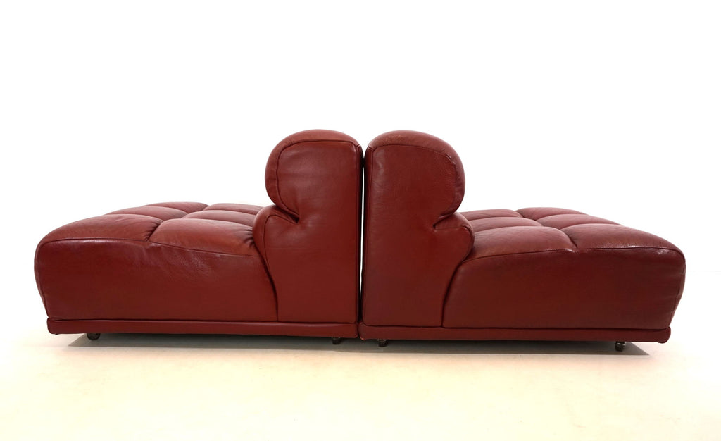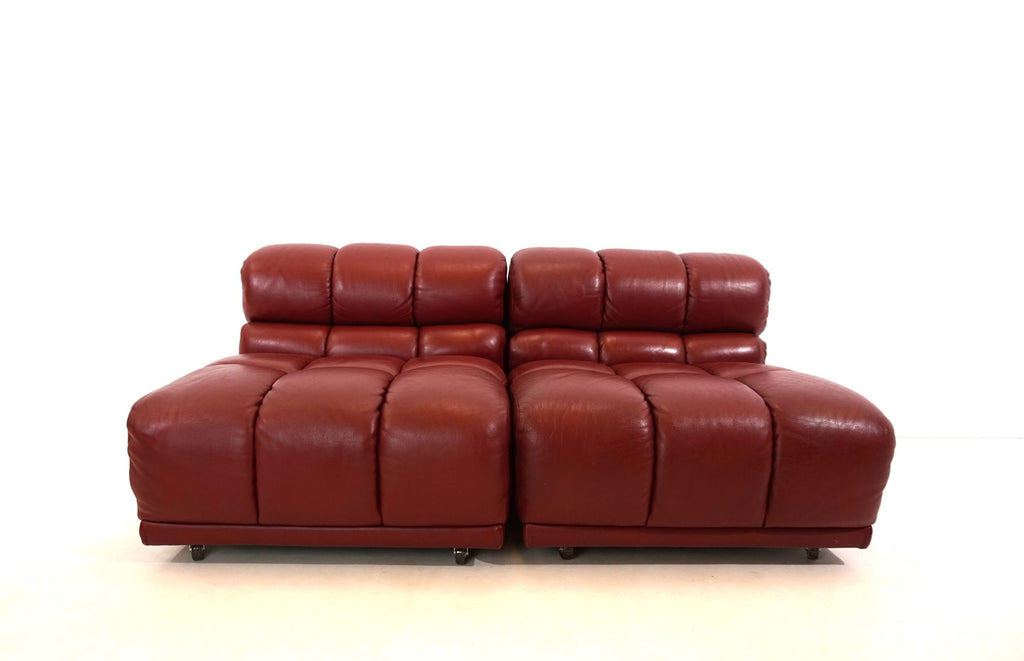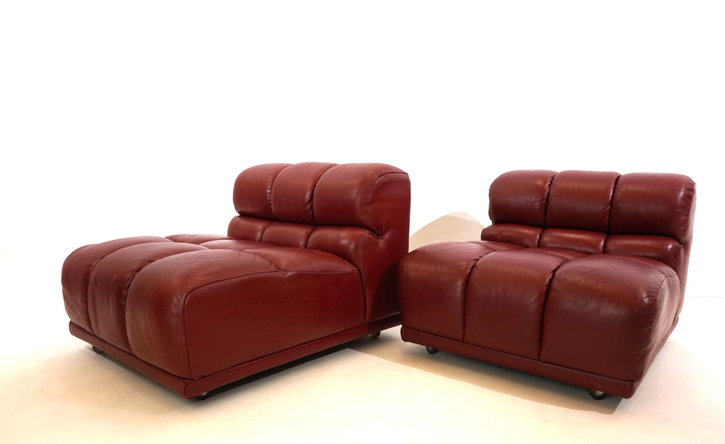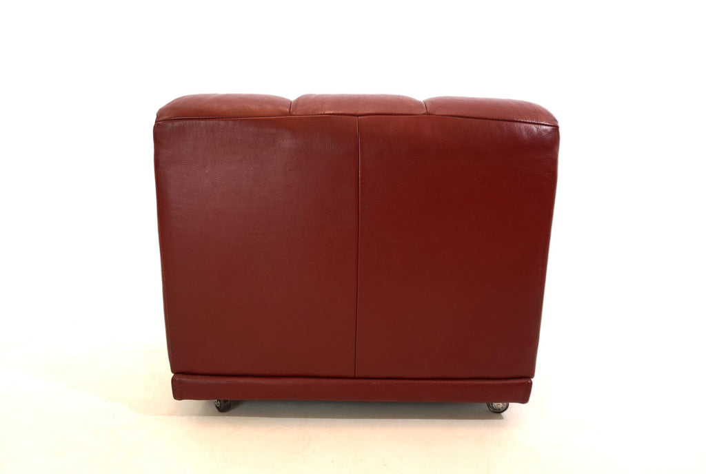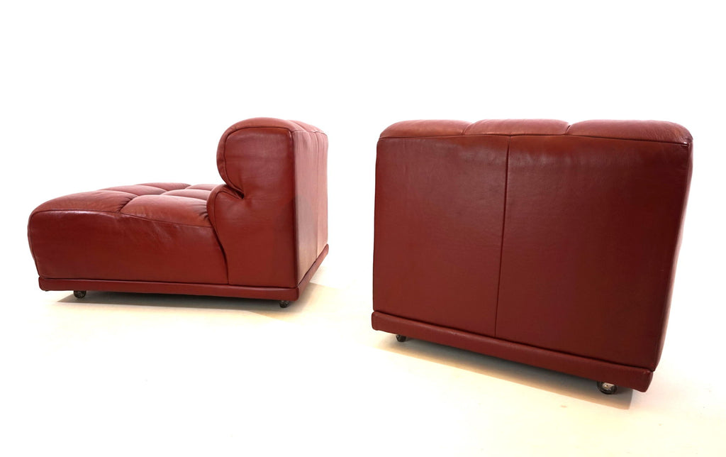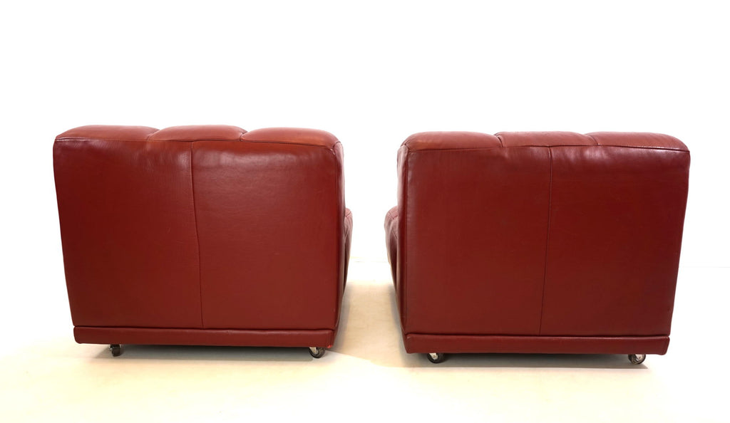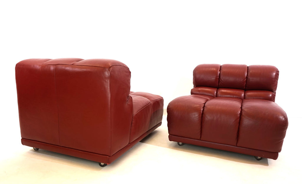 The set of 2 modular armchairs comes in fantastic condition. The leather is a very high quality, thick and at the same time soft quality. The seams are of high quality. The lines with the deep cuts in the cassettes indicate an Italian manufacturer. The chairs are easy to maneuver because they are on smooth-running wheels. The seats are extremely spacious, so that the armchairs can be used as a spacious two-seater or as individual pieces. With the fantastic red color, these armchairs are a highlight in any room and were probably made in the 70s.