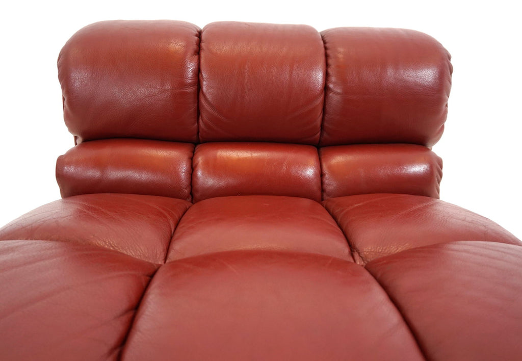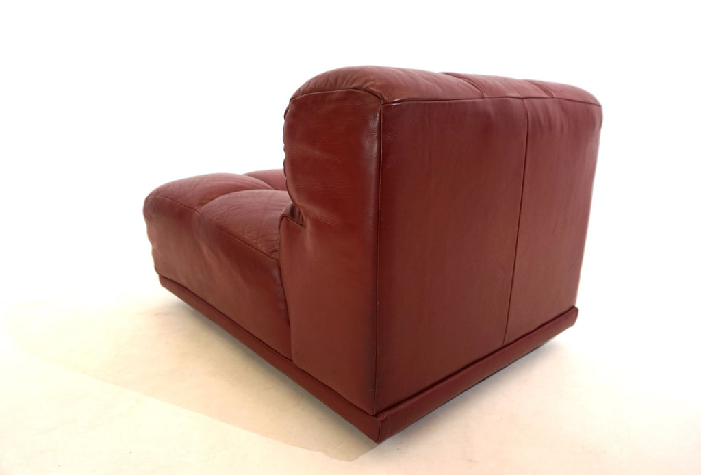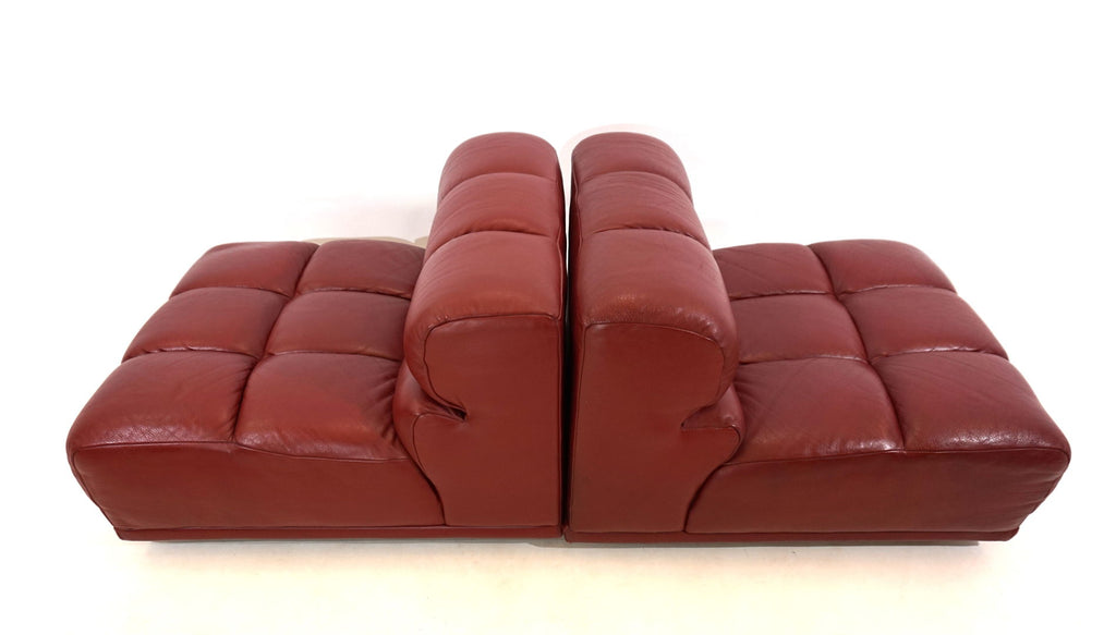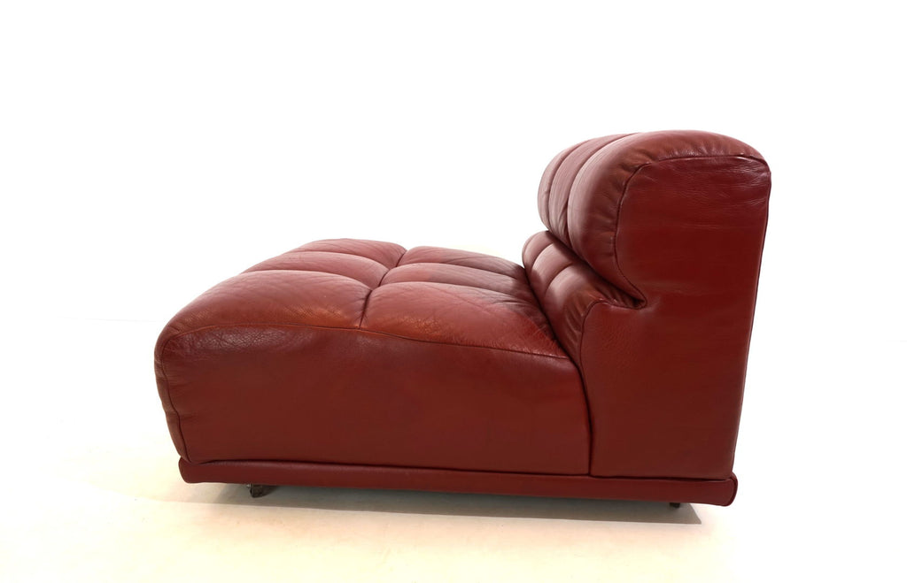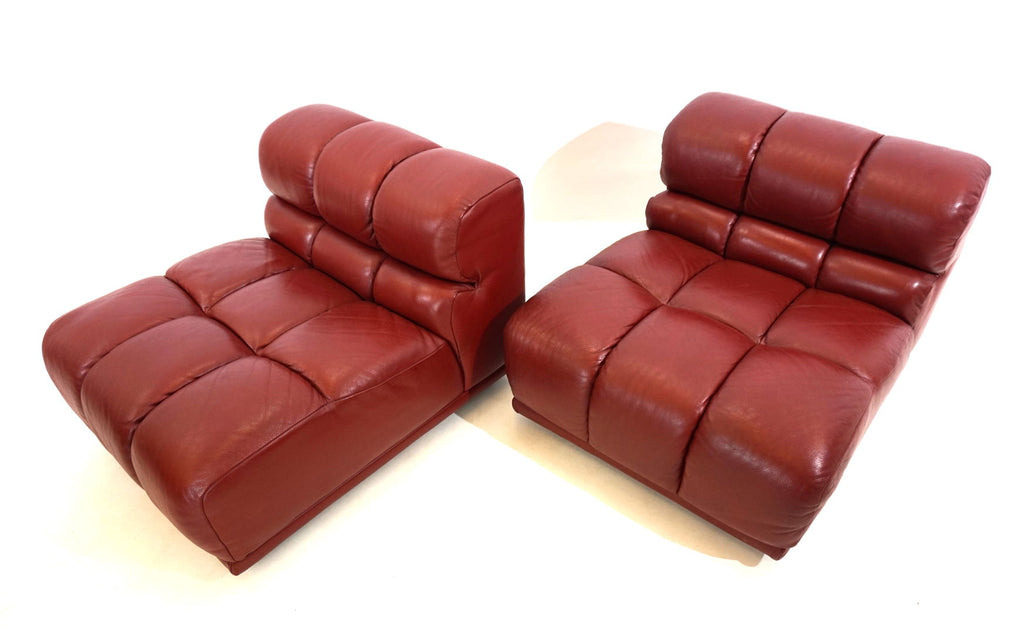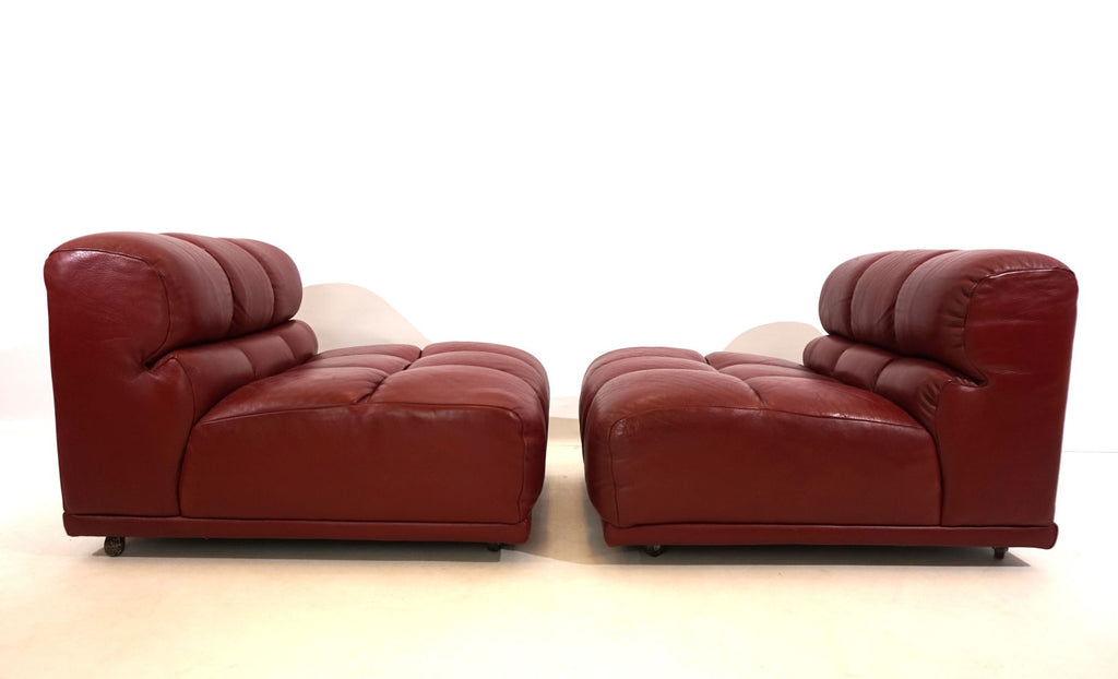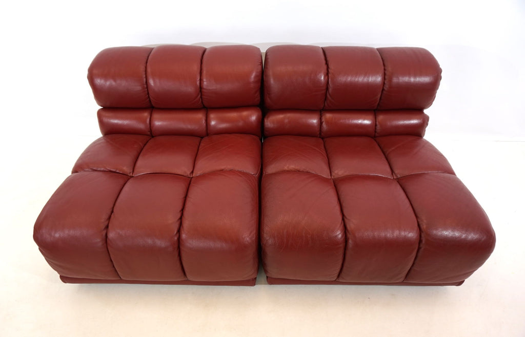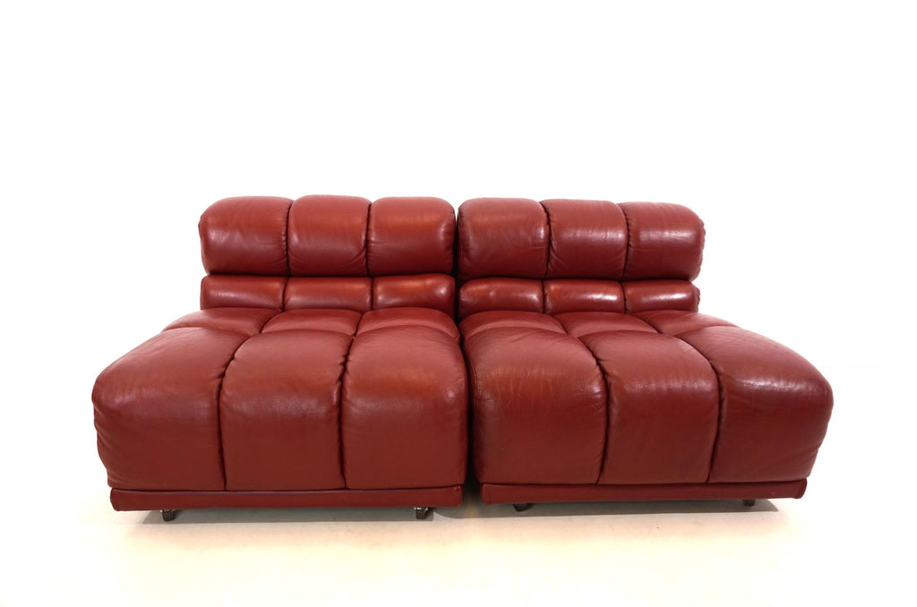 The set of 2 modular armchairs comes in fantastic condition. The leather is a very high quality, thick and at the same time soft quality. The seams are of high quality. The lines with the deep cuts in the cassettes indicate an Italian manufacturer. The chairs are easy to maneuver because they are on smooth-running wheels. The seats are extremely spacious, so that the armchairs can be used as a spacious two-seater or as individual pieces. With the fantastic red color, these armchairs are a highlight in any room and were probably made in the 70s.