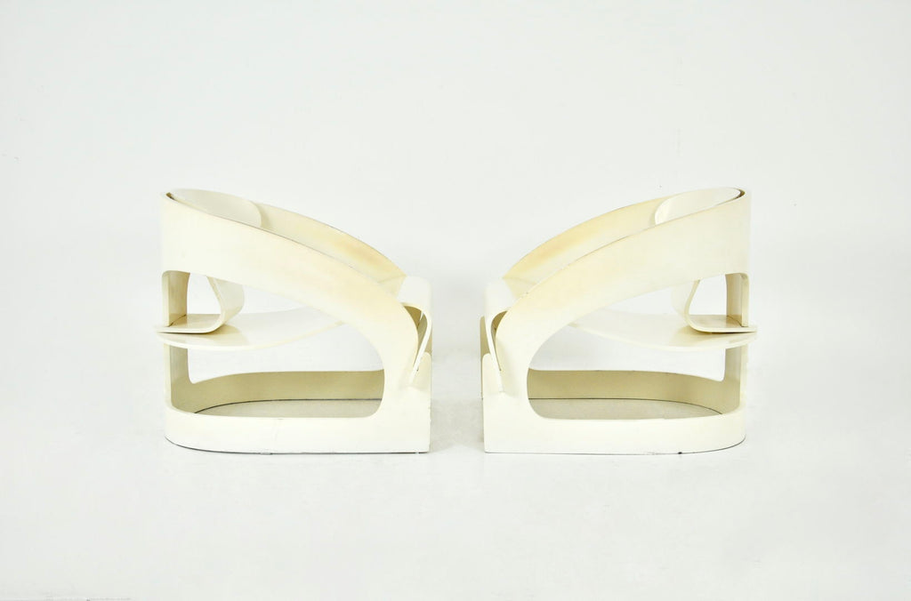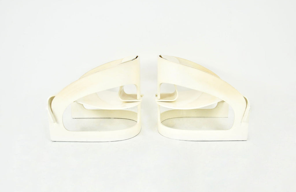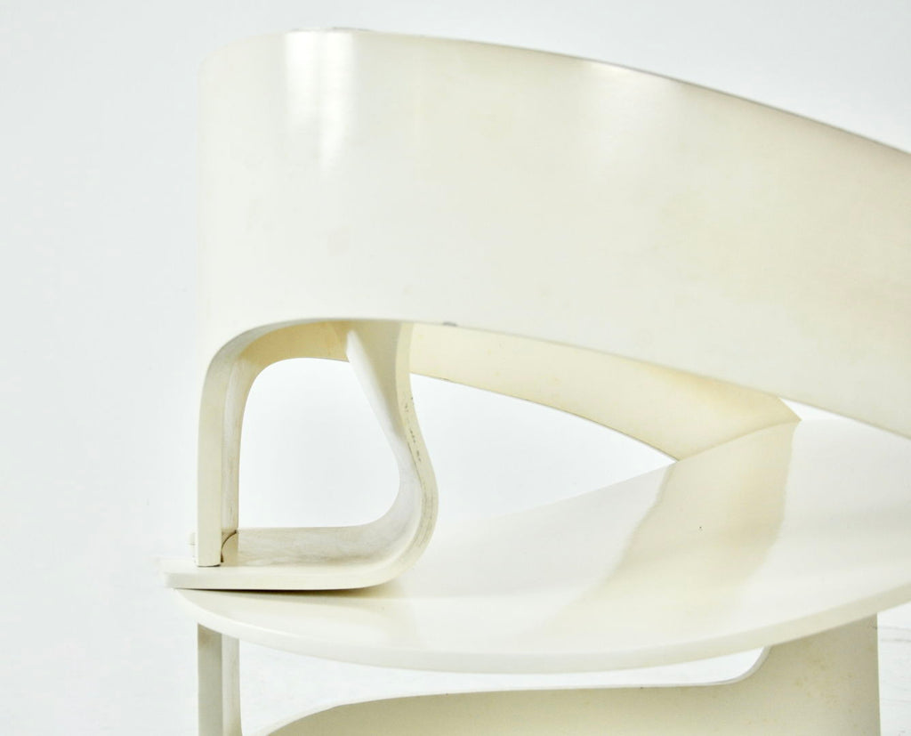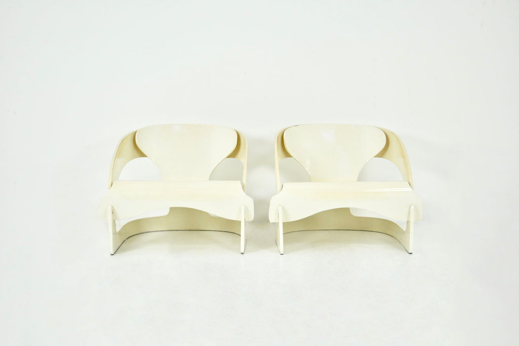 Set of 2 white wooden armchairs designed by Joe Colombo, Model 4801. Numbered 121. Seat height 34cm. Wear due to time and age.