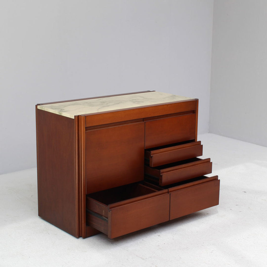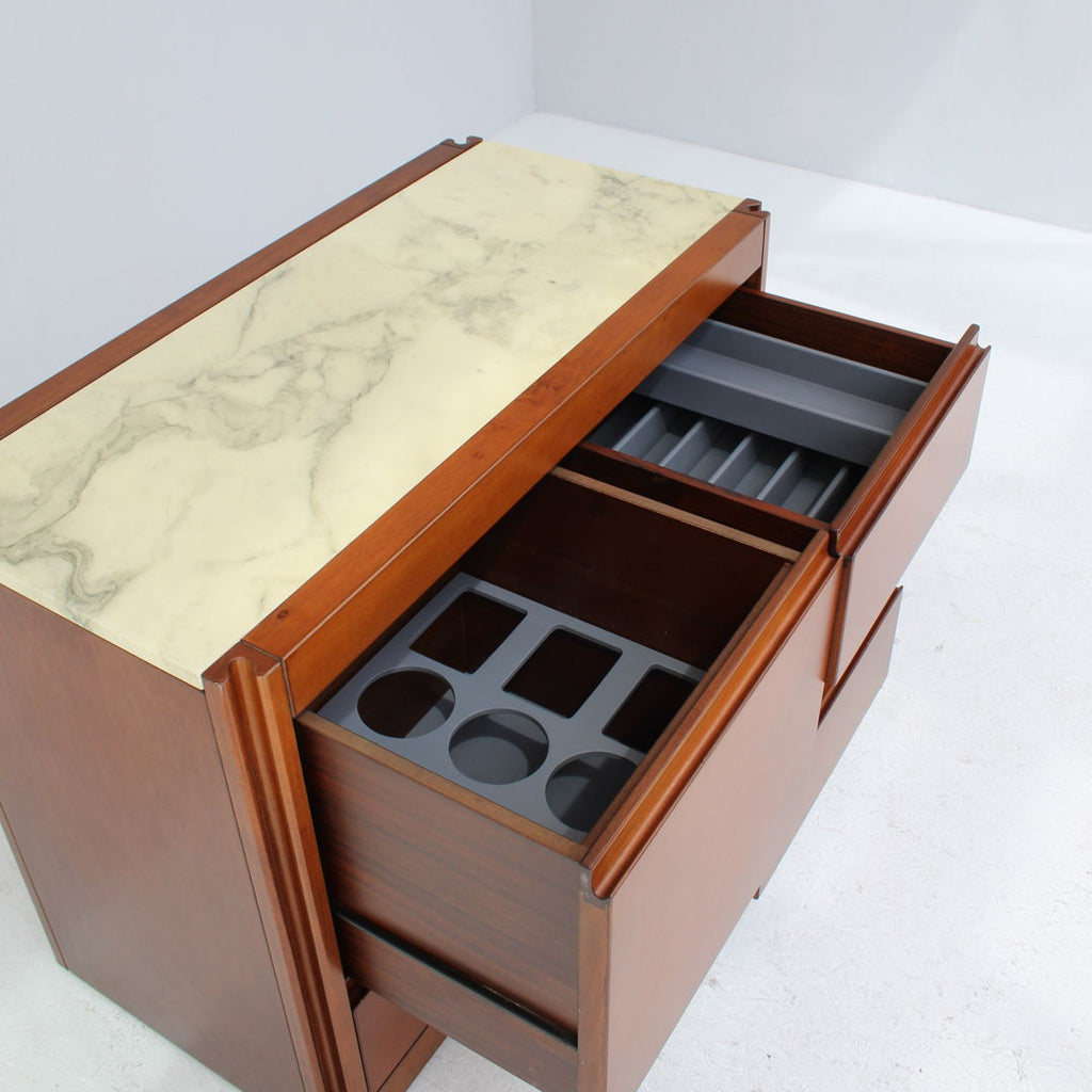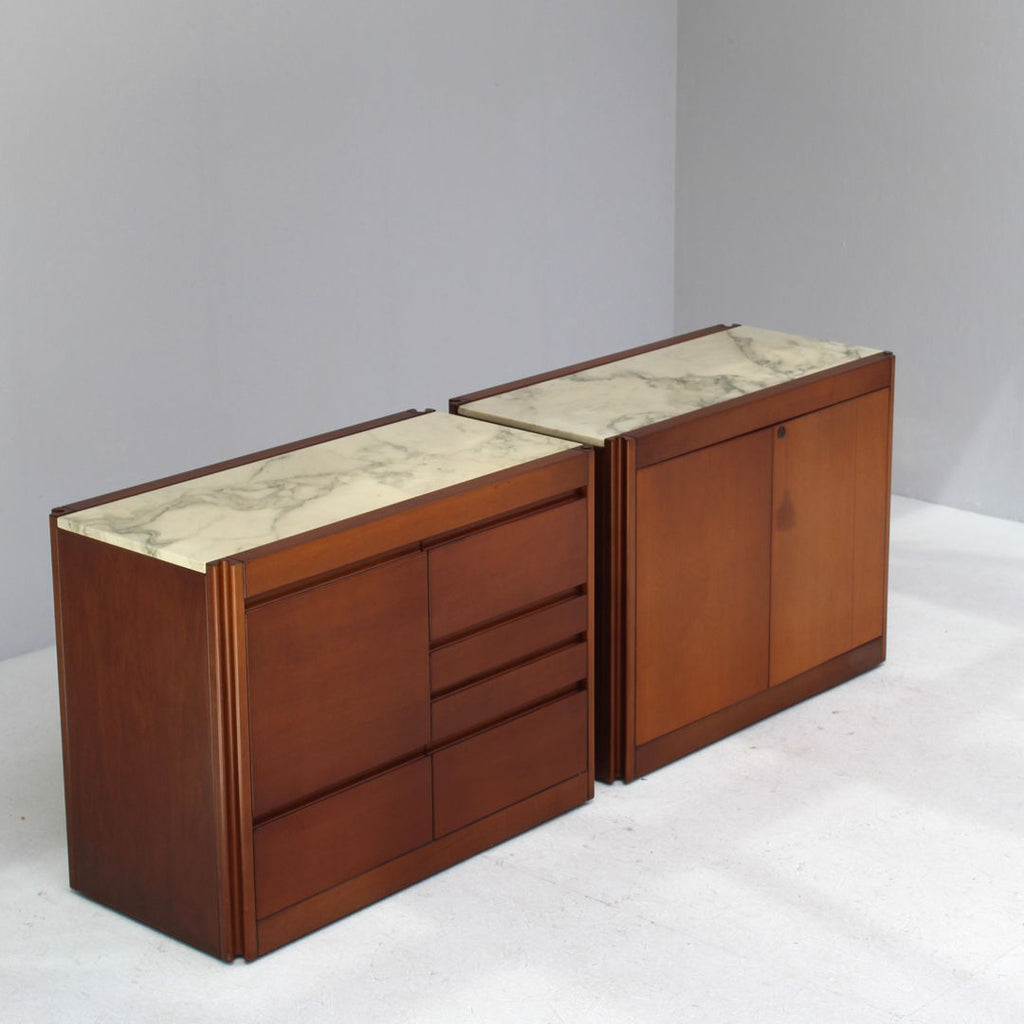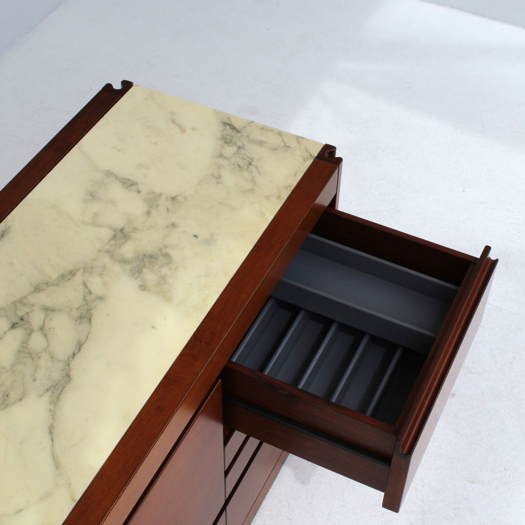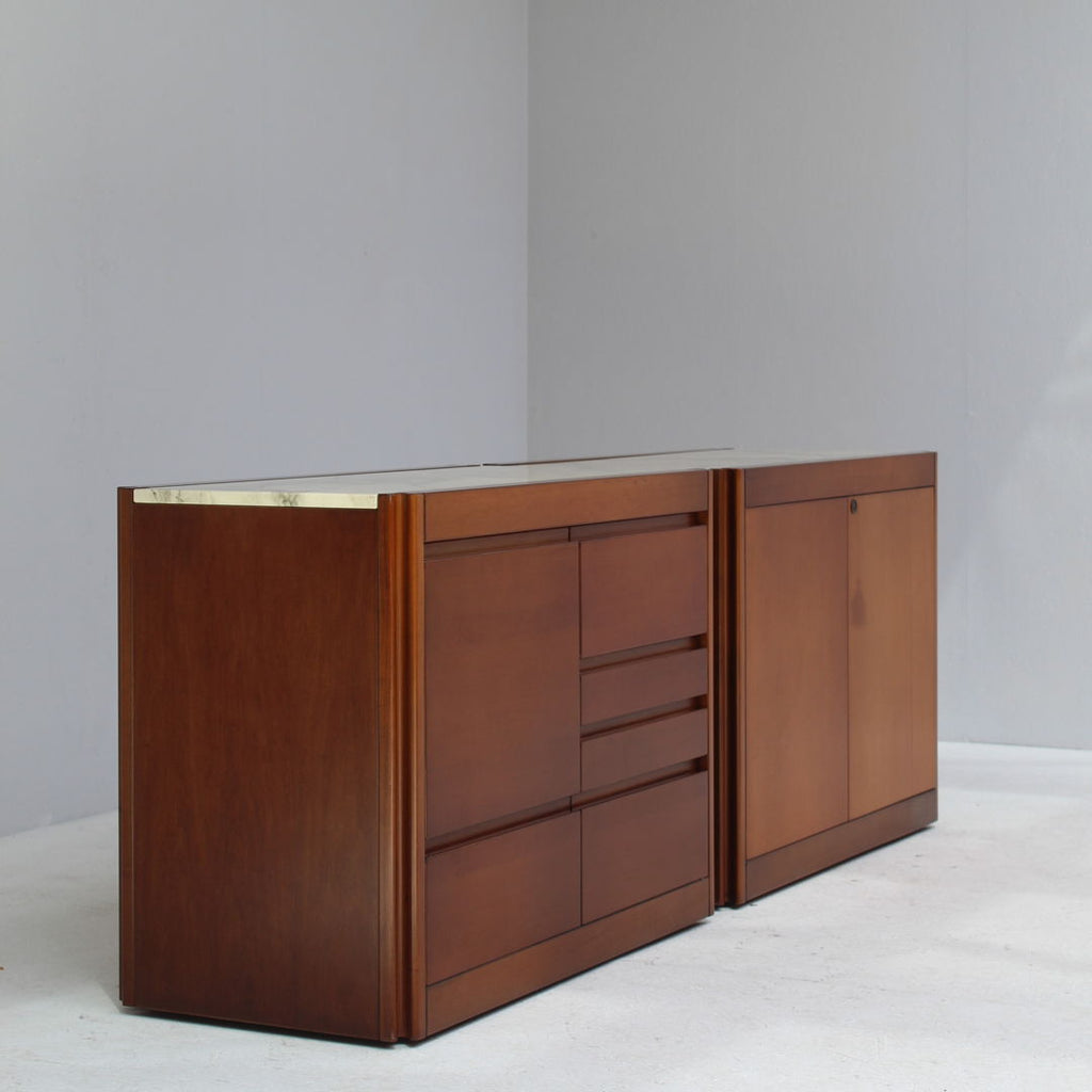 Angelo Mangiarotti가 Molteni를 위해 디자인한 모델 4D 사이드보드 세트와 커피 테이블, 1960년대. 대리석 상판과 견고한 호두나무. 각 조각 아래에 바퀴가 있습니다. 캐비닛 치수: H71.5 x B48 x L95.5 치수표: H36.5 x b95 x L95.5