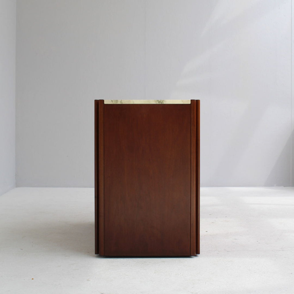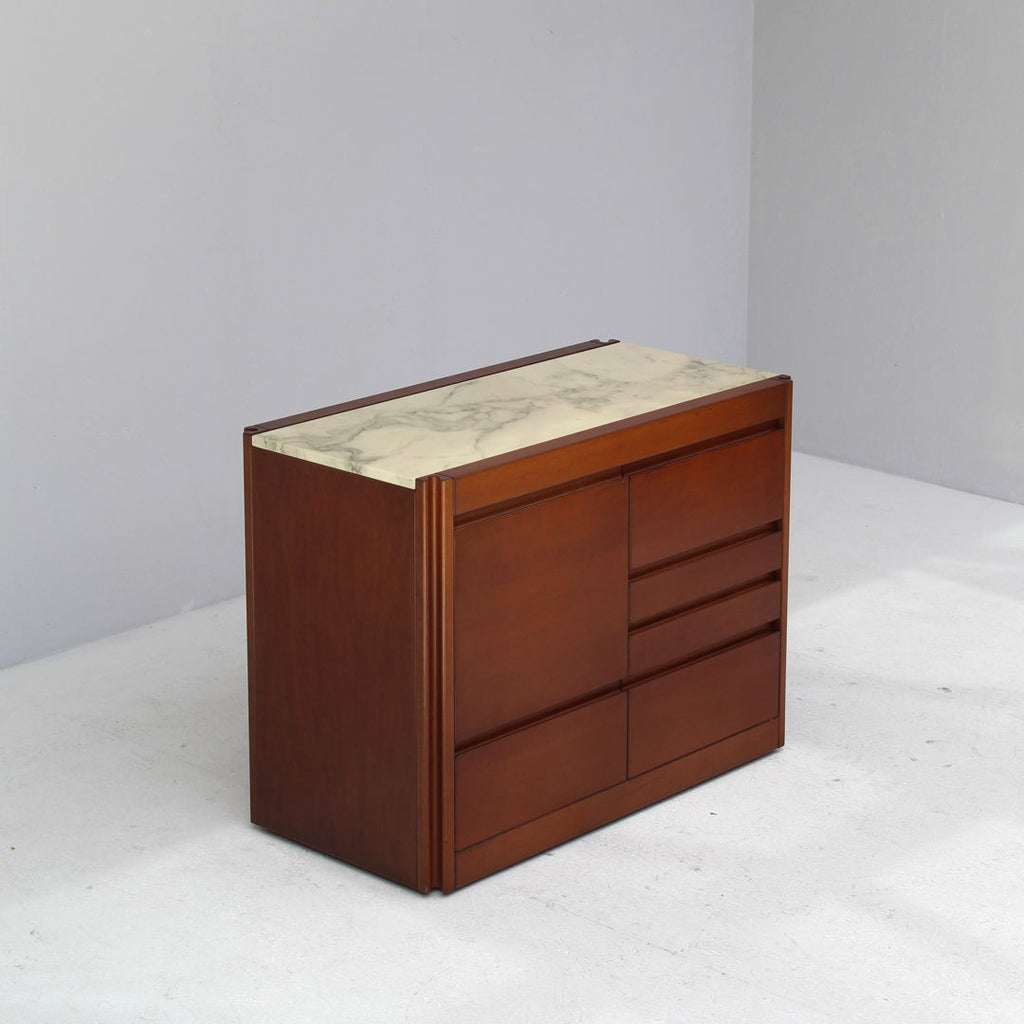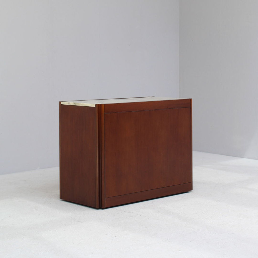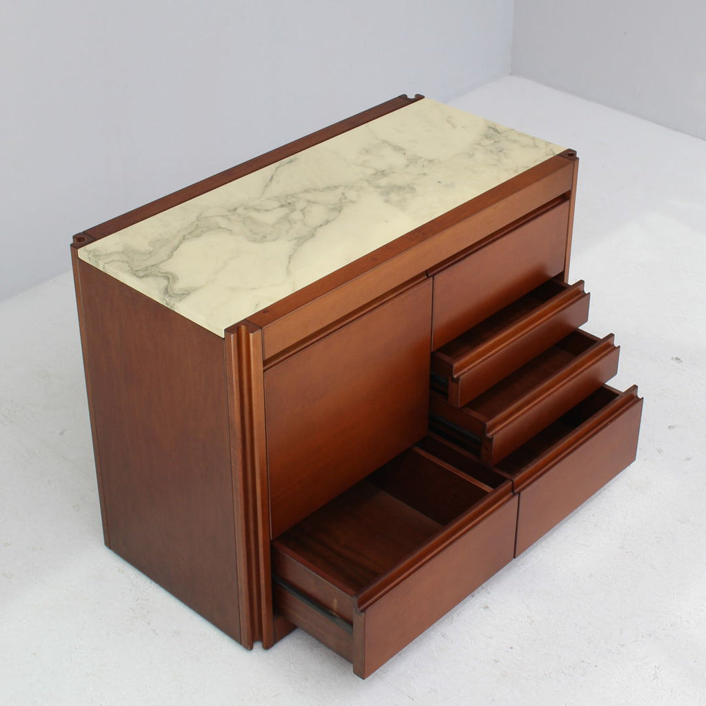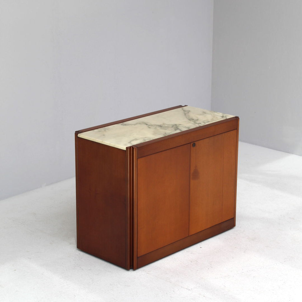 Angelo Mangiarotti가 Molteni를 위해 디자인한 모델 4D 사이드보드 세트와 커피 테이블, 1960년대. 대리석 상판과 견고한 호두나무. 각 조각 아래에 바퀴가 있습니다. 캐비닛 치수: H71.5 x B48 x L95.5 치수표: H36.5 x b95 x L95.5