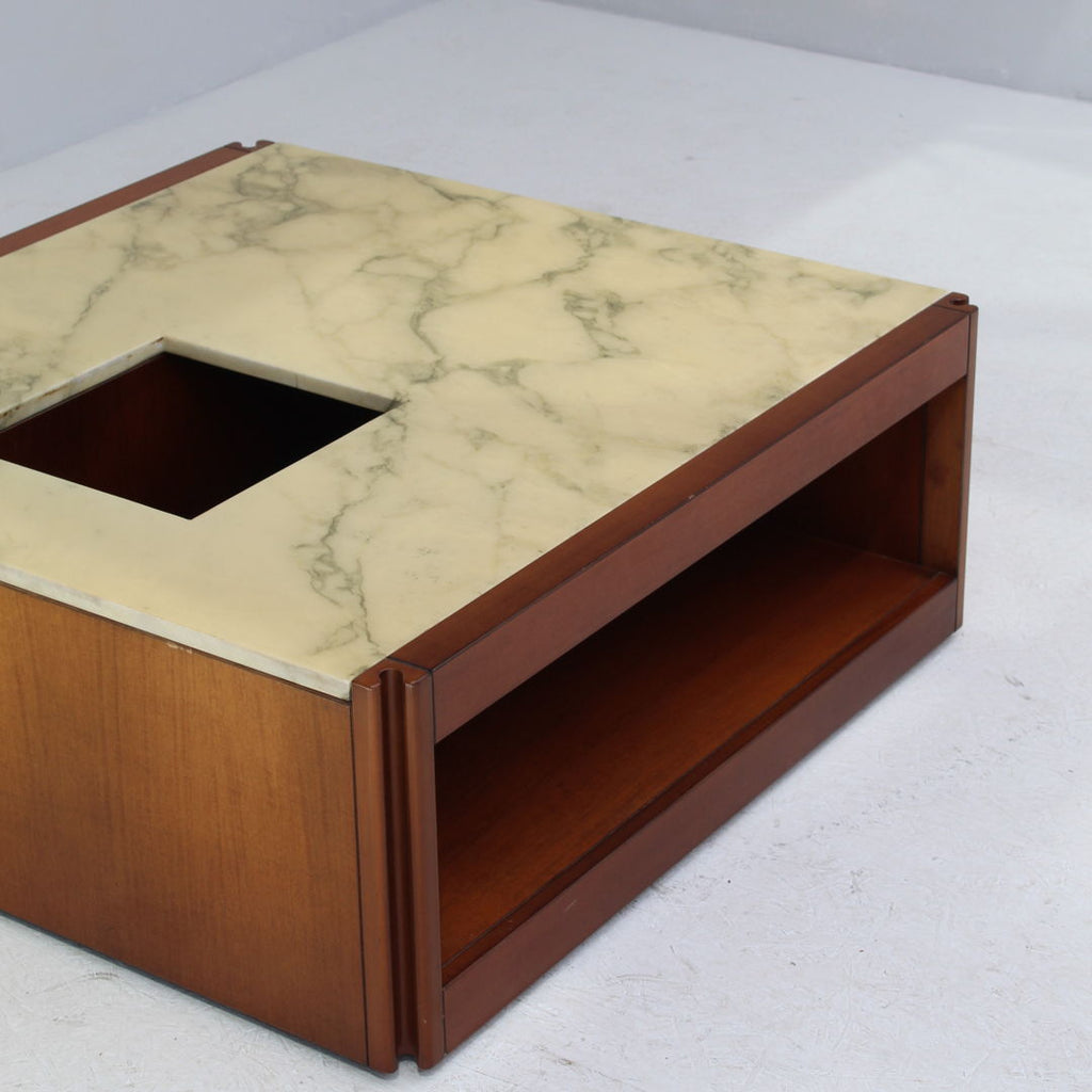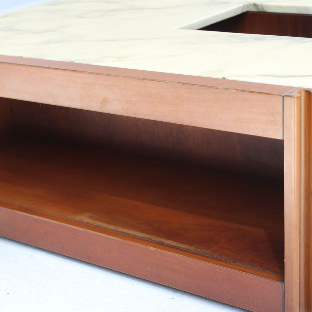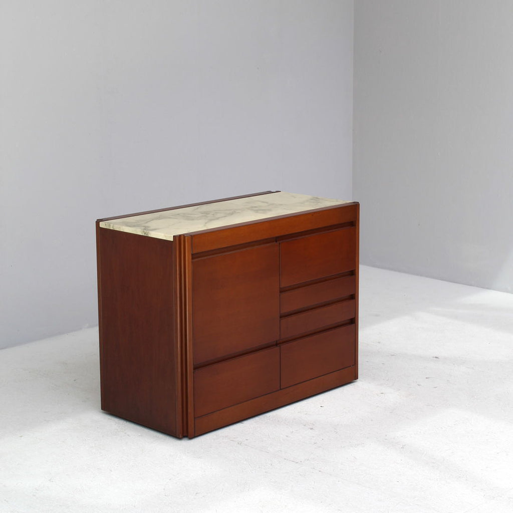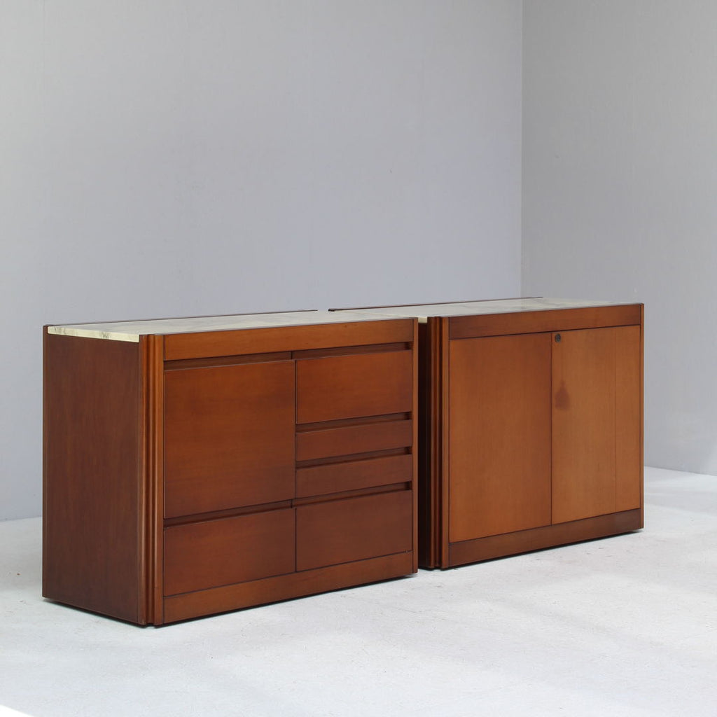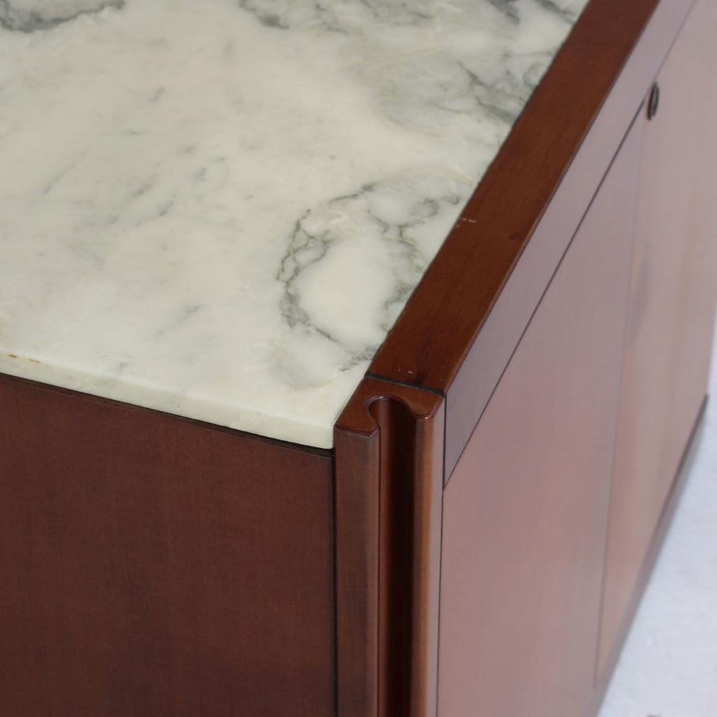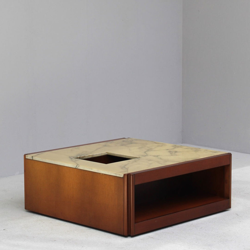 Angelo Mangiarotti가 Molteni를 위해 디자인한 모델 4D 사이드보드 세트와 커피 테이블, 1960년대. 대리석 상판과 견고한 호두나무. 각 조각 아래에 바퀴가 있습니다. 캐비닛 치수: H71.5 x B48 x L95.5 치수표: H36.5 x b95 x L95.5
