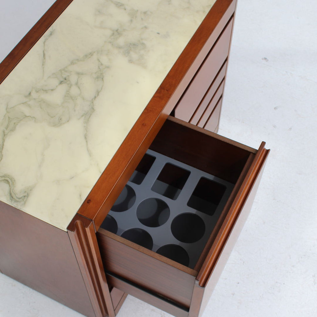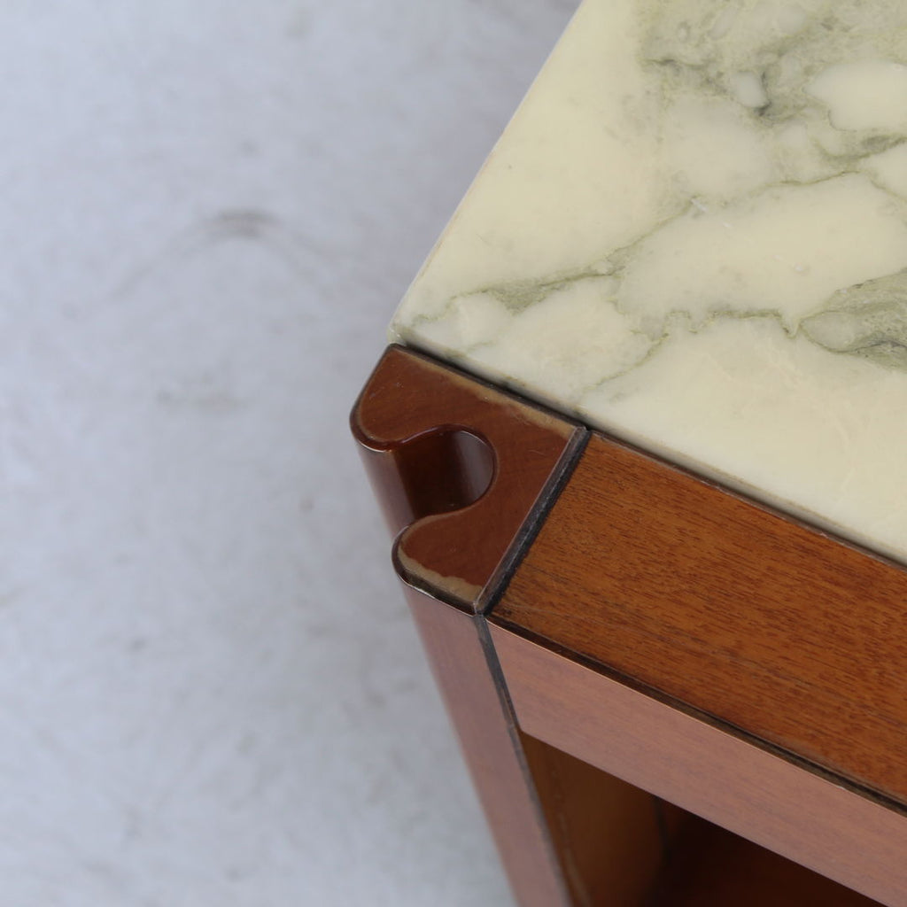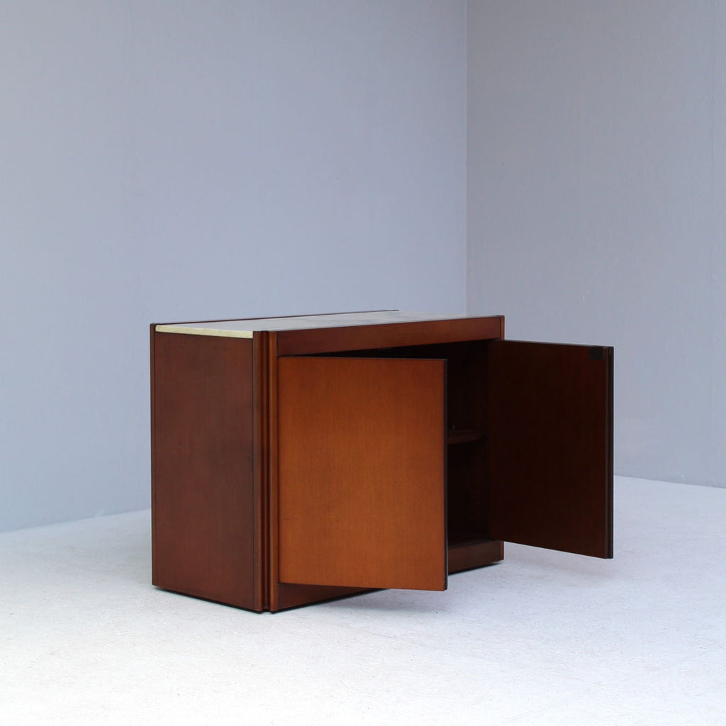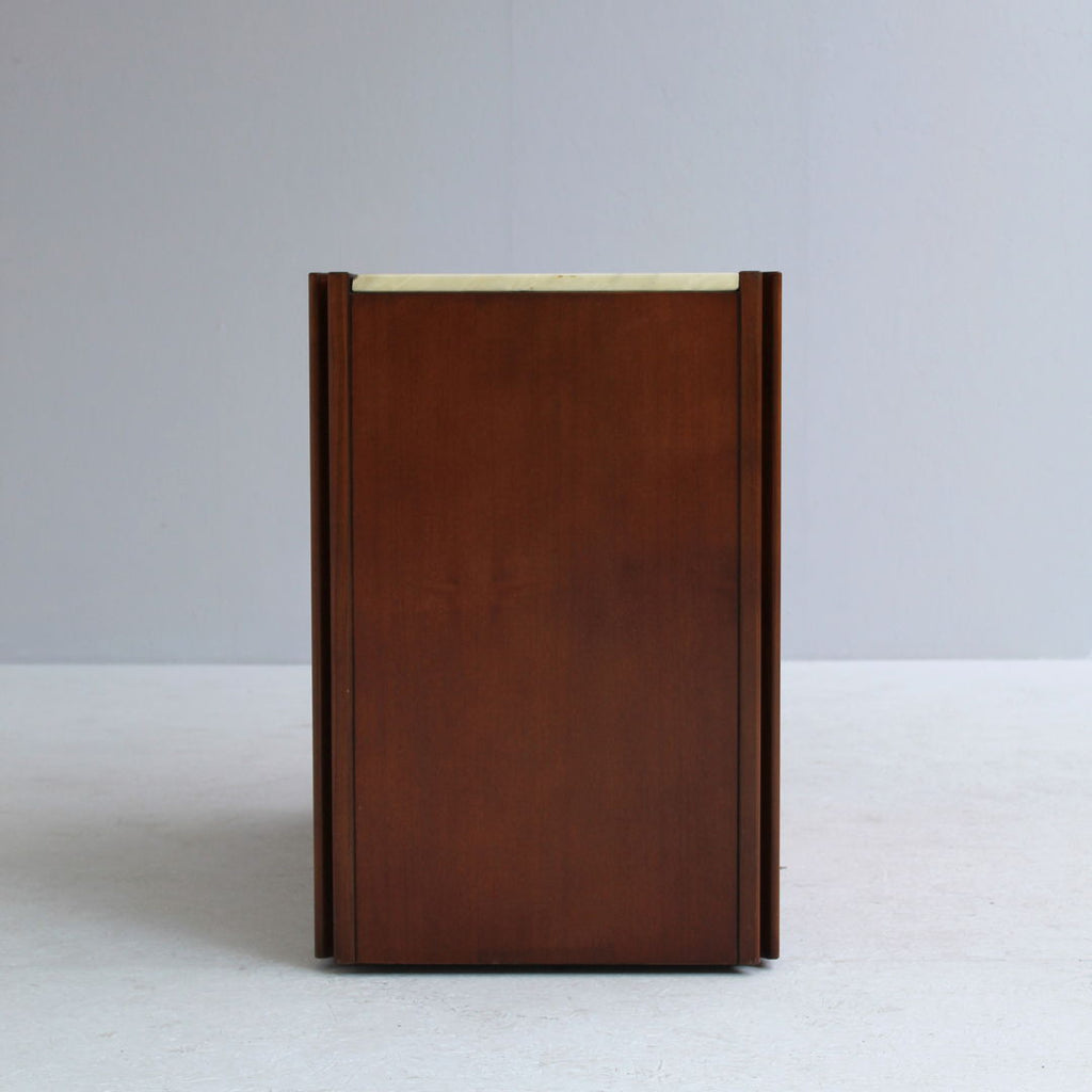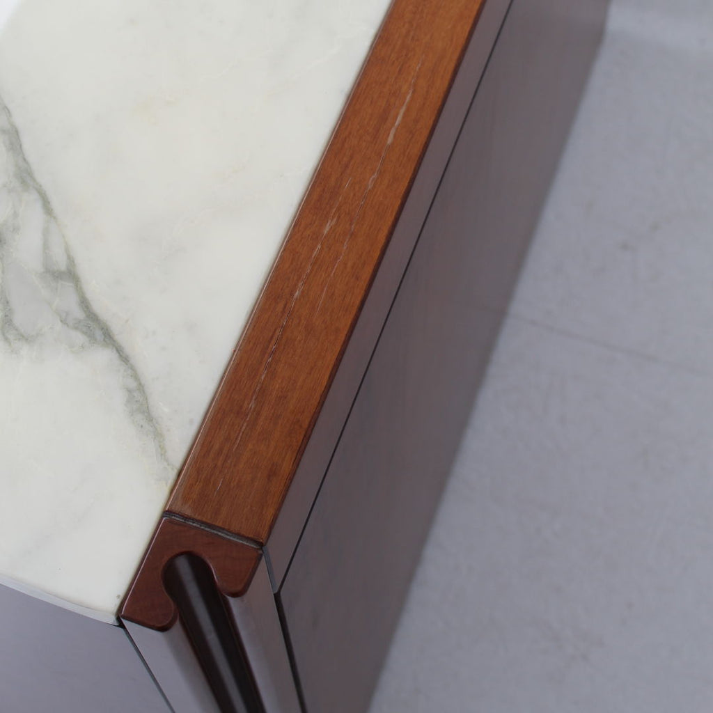 Angelo Mangiarotti가 Molteni를 위해 디자인한 모델 4D 사이드보드 세트와 커피 테이블, 1960년대. 대리석 상판과 견고한 호두나무. 각 조각 아래에 바퀴가 있습니다. 캐비닛 치수: H71.5 x B48 x L95.5 치수표: H36.5 x b95 x L95.5