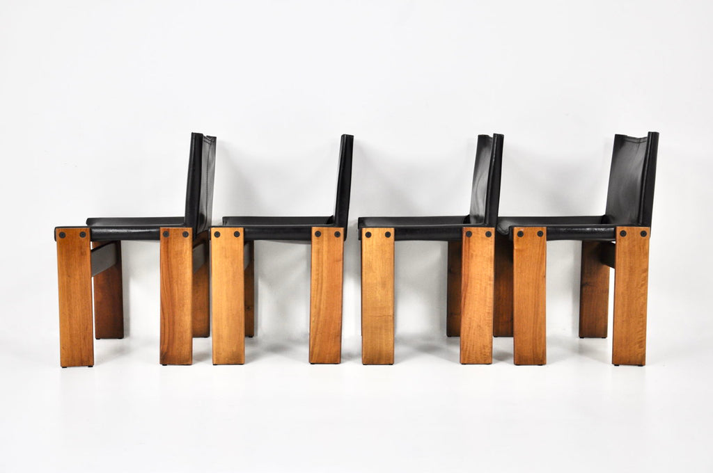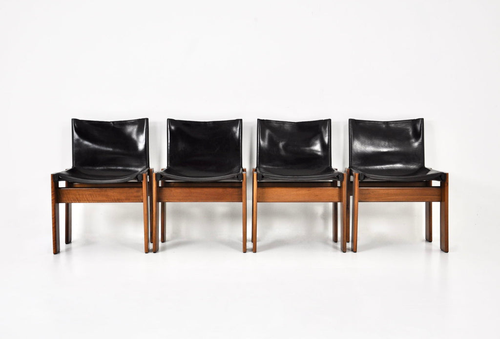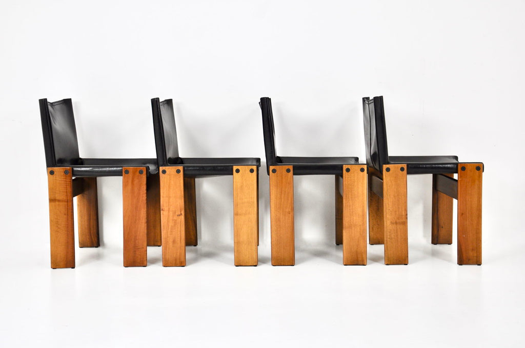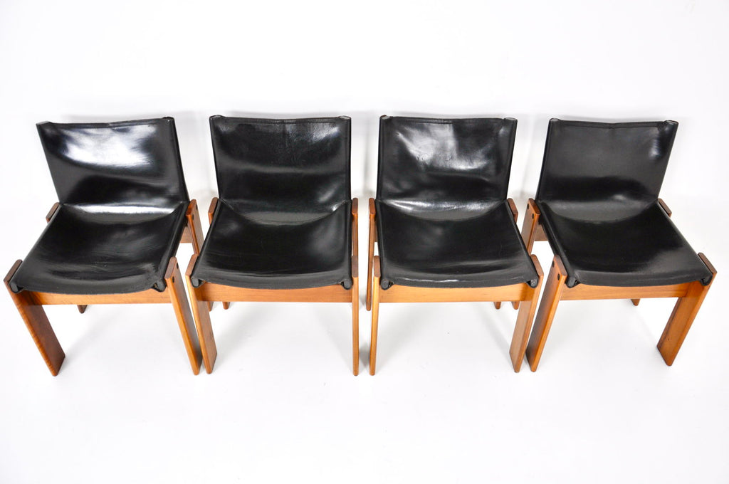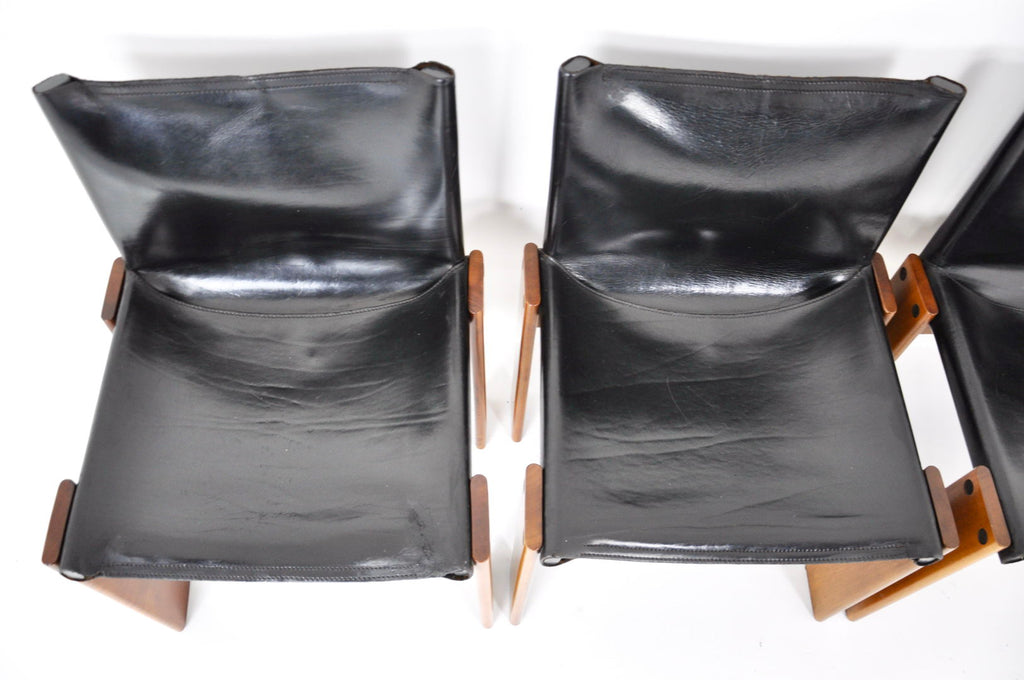 Afra & Tobia Scarpa가 디자인한 블랙 가죽과 목재 의자 4개 세트. 모델: 몽크. 좌석 높이: 43cm 의자의 시대와 사용 연식으로 인해 마모되었습니다.