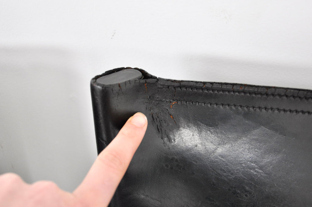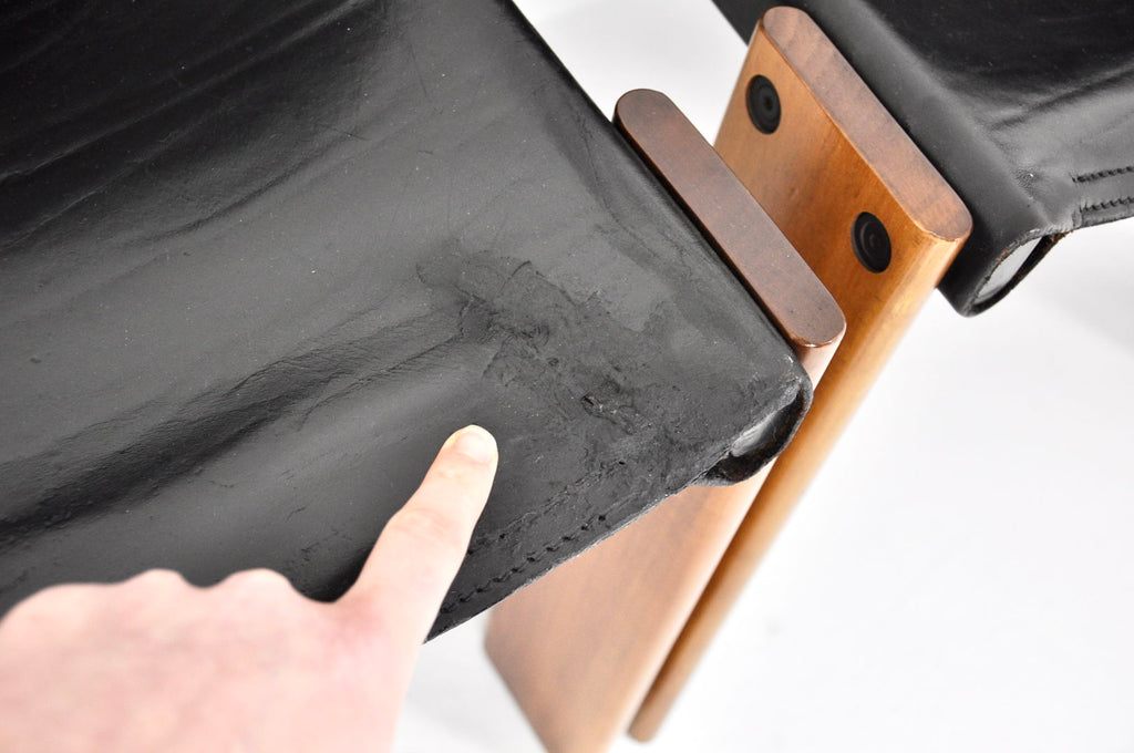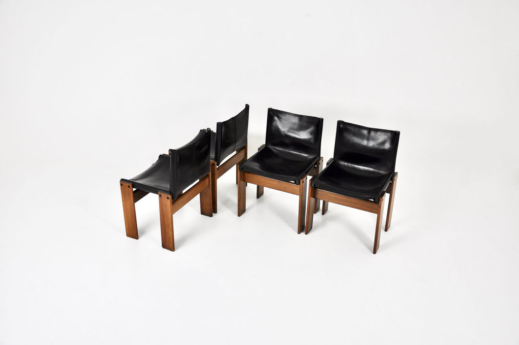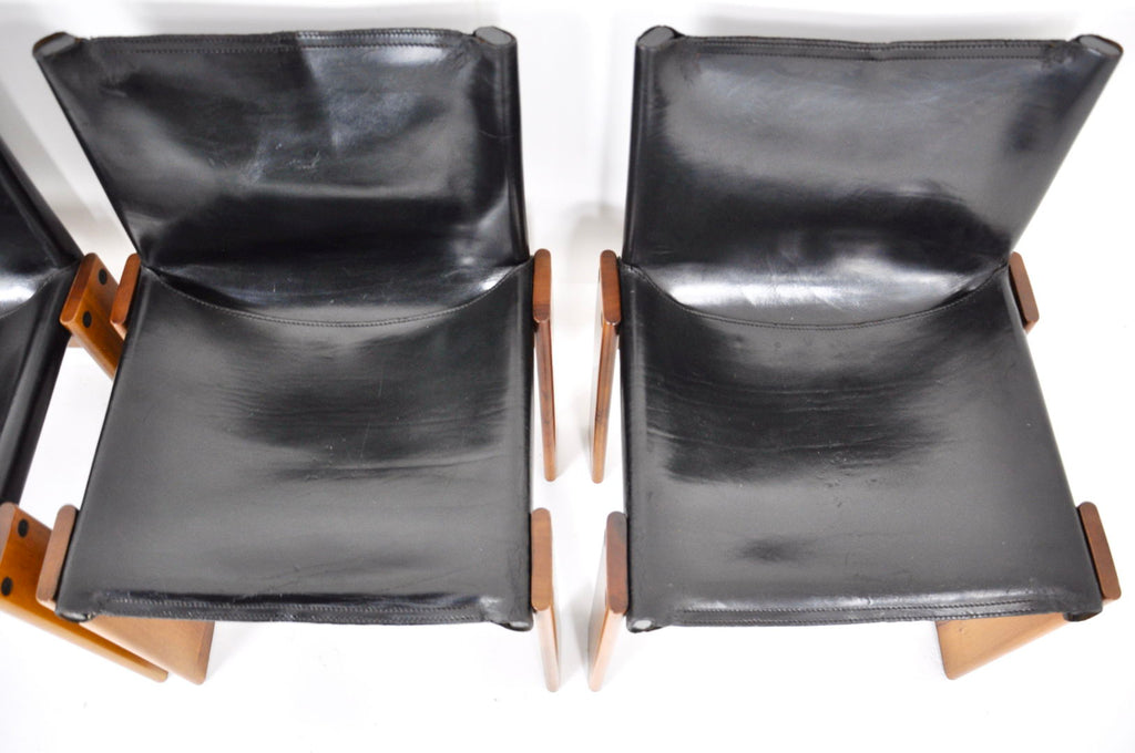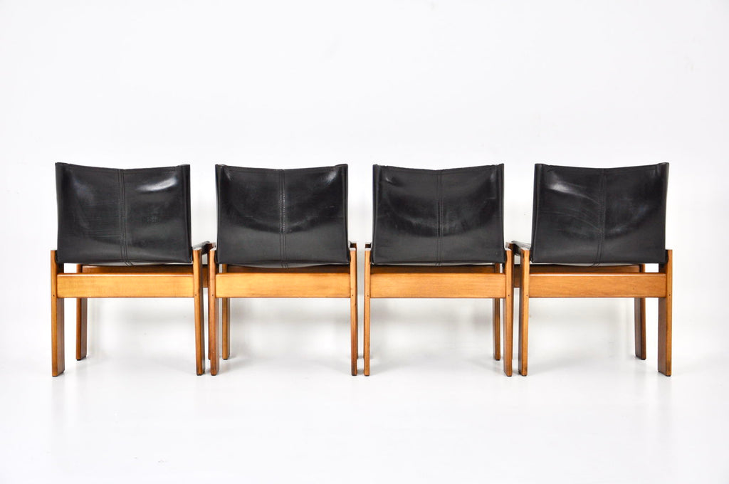 Afra & Tobia Scarpa가 디자인한 블랙 가죽과 목재 의자 4개 세트. 모델: 몽크. 좌석 높이: 43cm 의자의 시대와 사용 연식으로 인해 마모되었습니다.