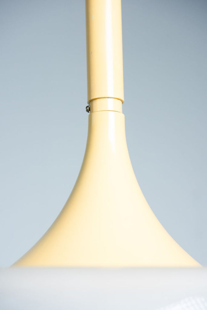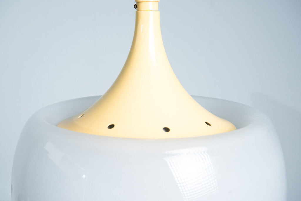 60년대 Martinelli Luci를 위해 Elio Martinelli가 디자인한 버섯 모양의 흰색 래커 메탈과 반투명 유리 펜던트입니다. 램프는 아름다운 녹청 처리로 원래 상태를 유지합니다. 전기가 확인되었으며 작동 상태이며 E27 소켓이며 LED에 적합합니다. 유리 전등갓 높이는 27cm입니다.