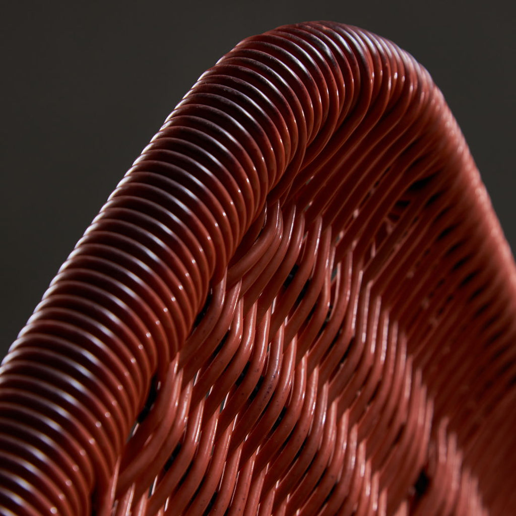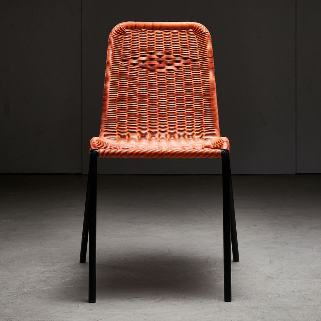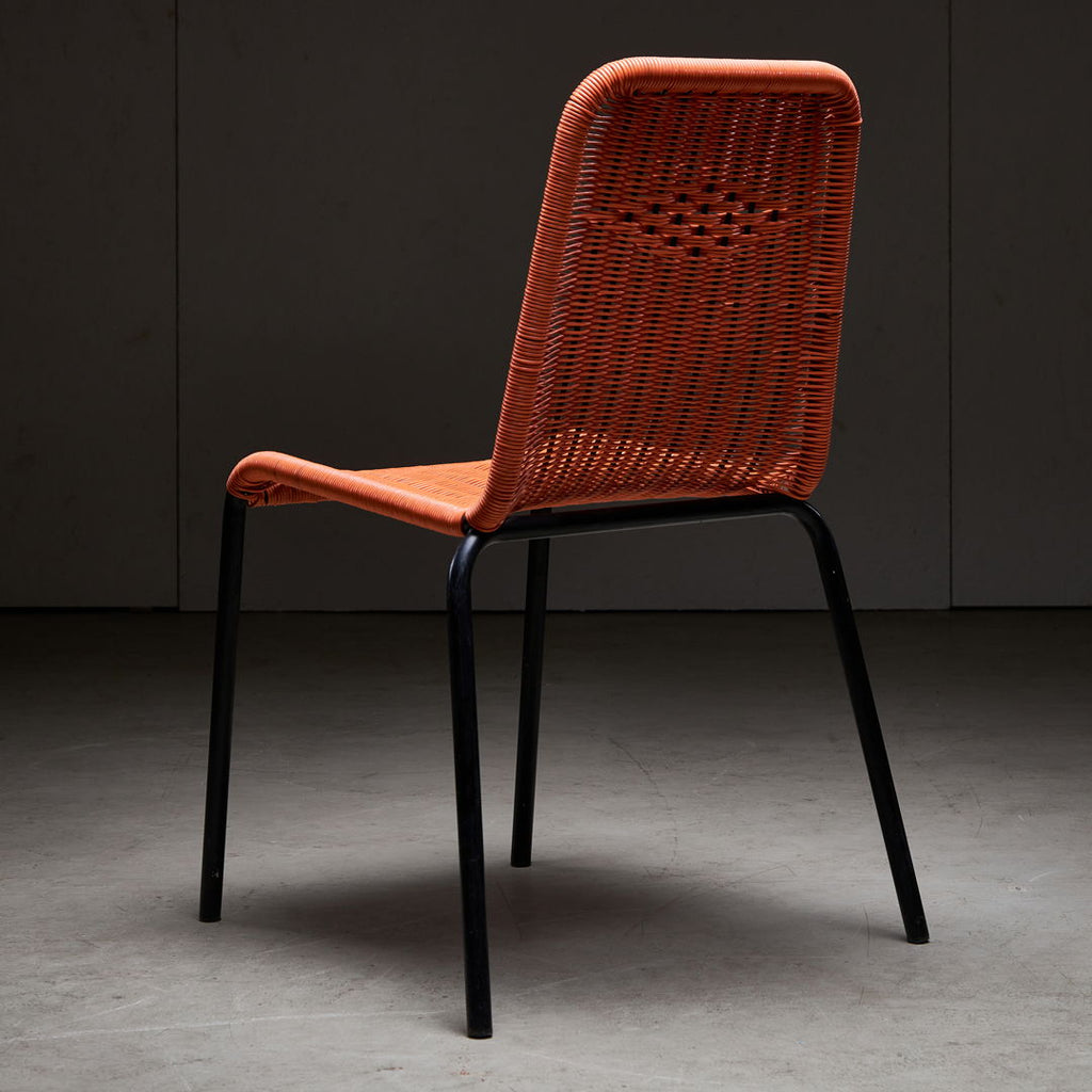 "Black tube frame garden chairs from the 1960s. The seat and backrest are made of orange braided plastic cable. These items are in a very good condition, with some minor scratches on the frames. 3 pieces available."
