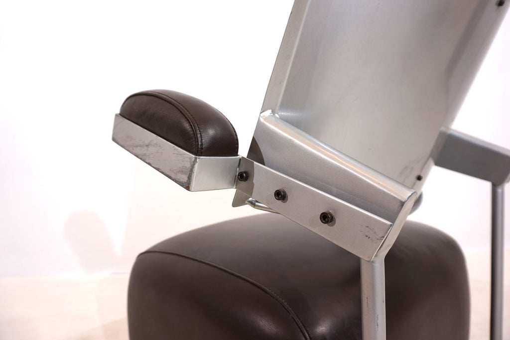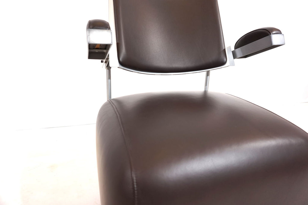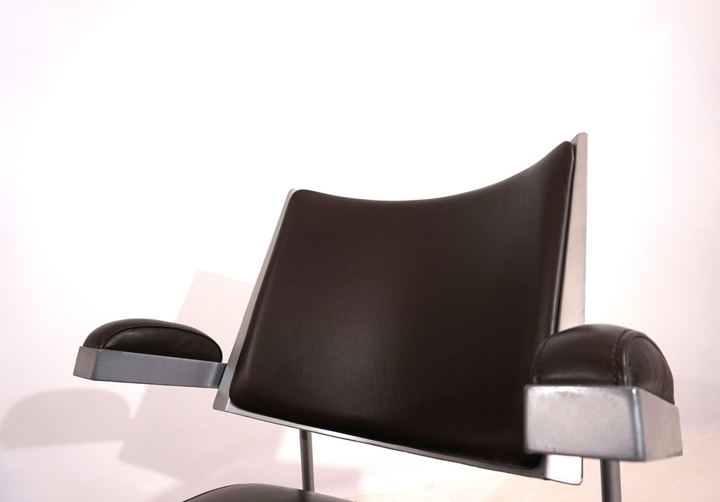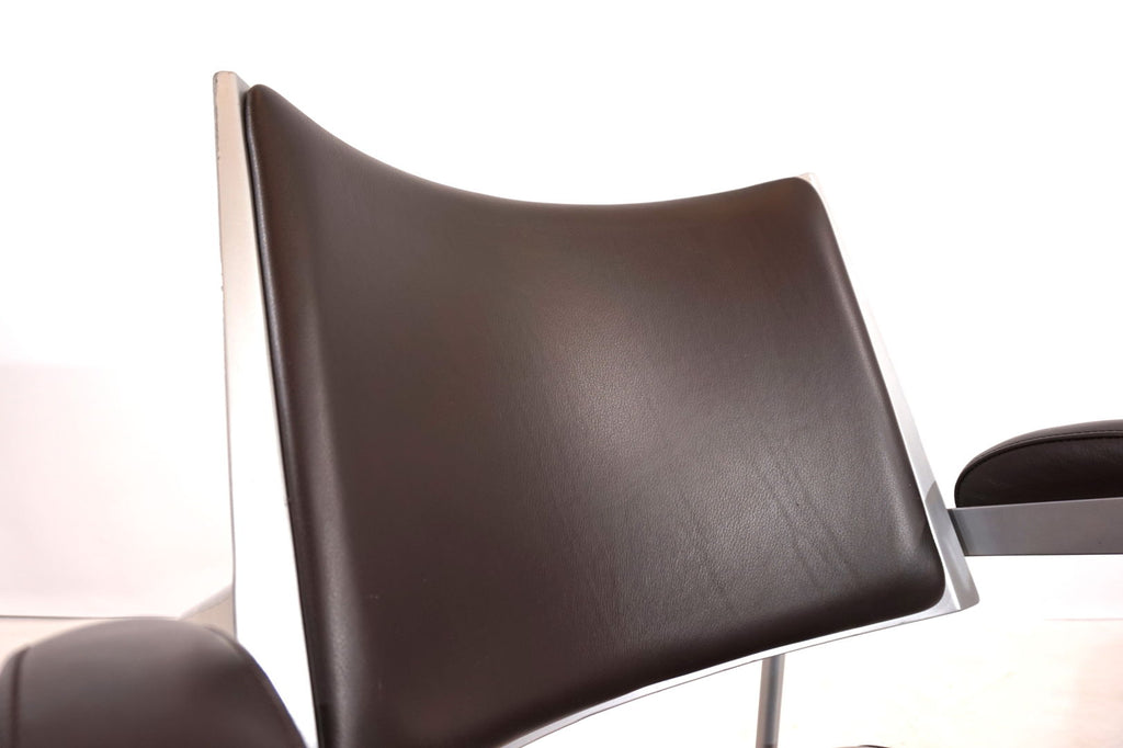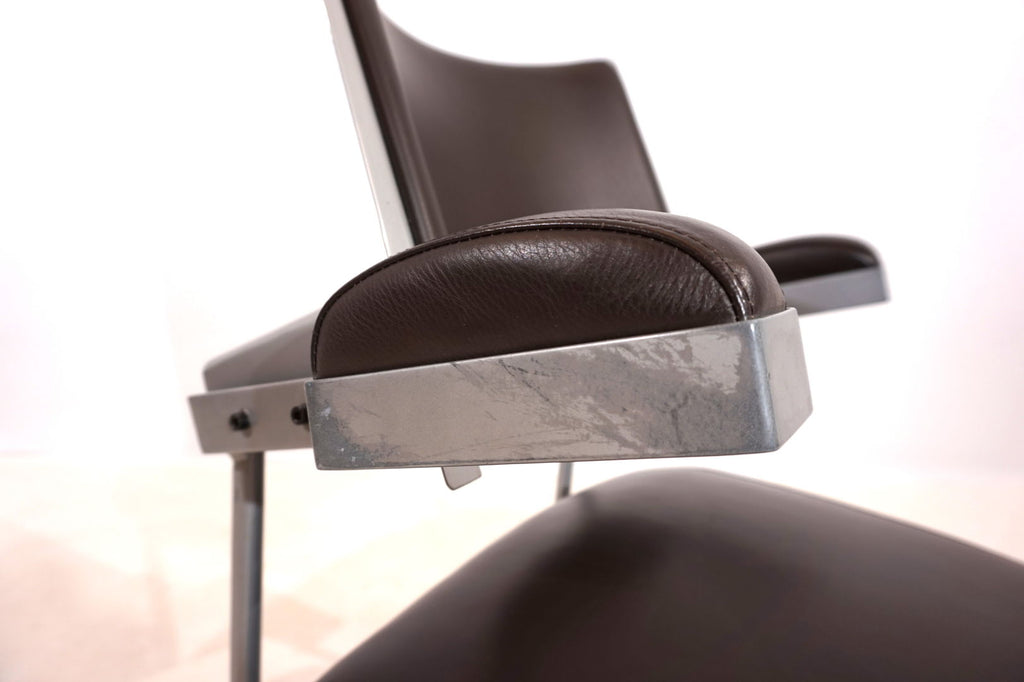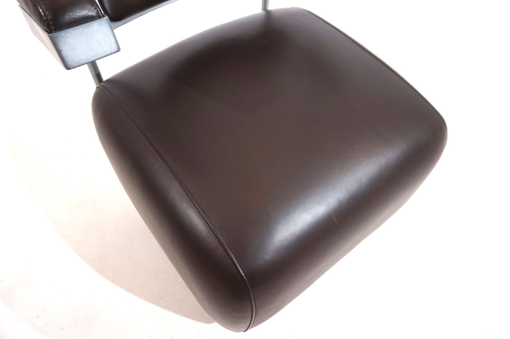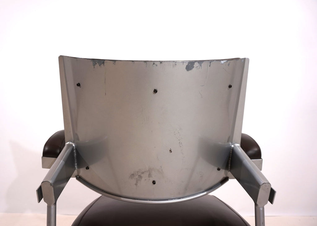 The Oscar armchair comes in brown leather covers with a light grey powder-coated metal frame. The leather covers of the seat cushion and backrest are in first-class condition. The metal frame shows slight signs of wear, the back of the backrest shows heavy signs of abrasion. The seating comfort of the armchair is impeccable and the swinging backrest offers a high level of comfort.