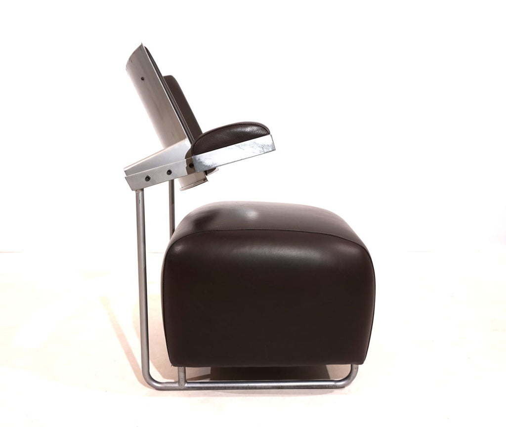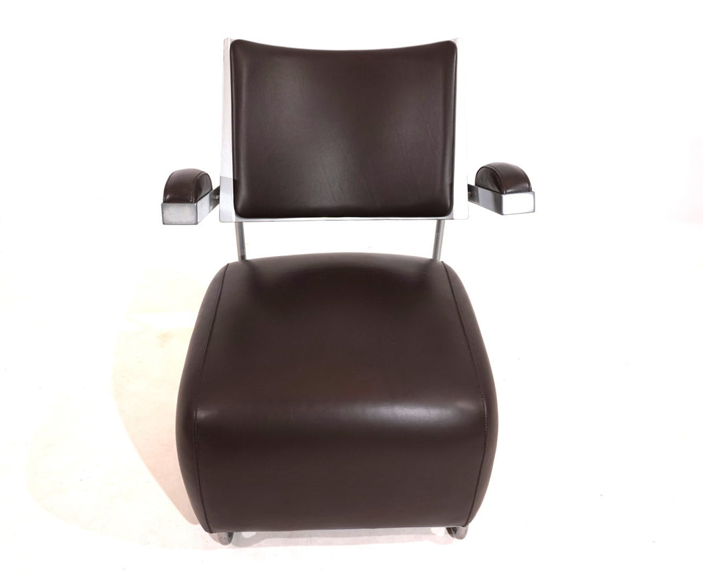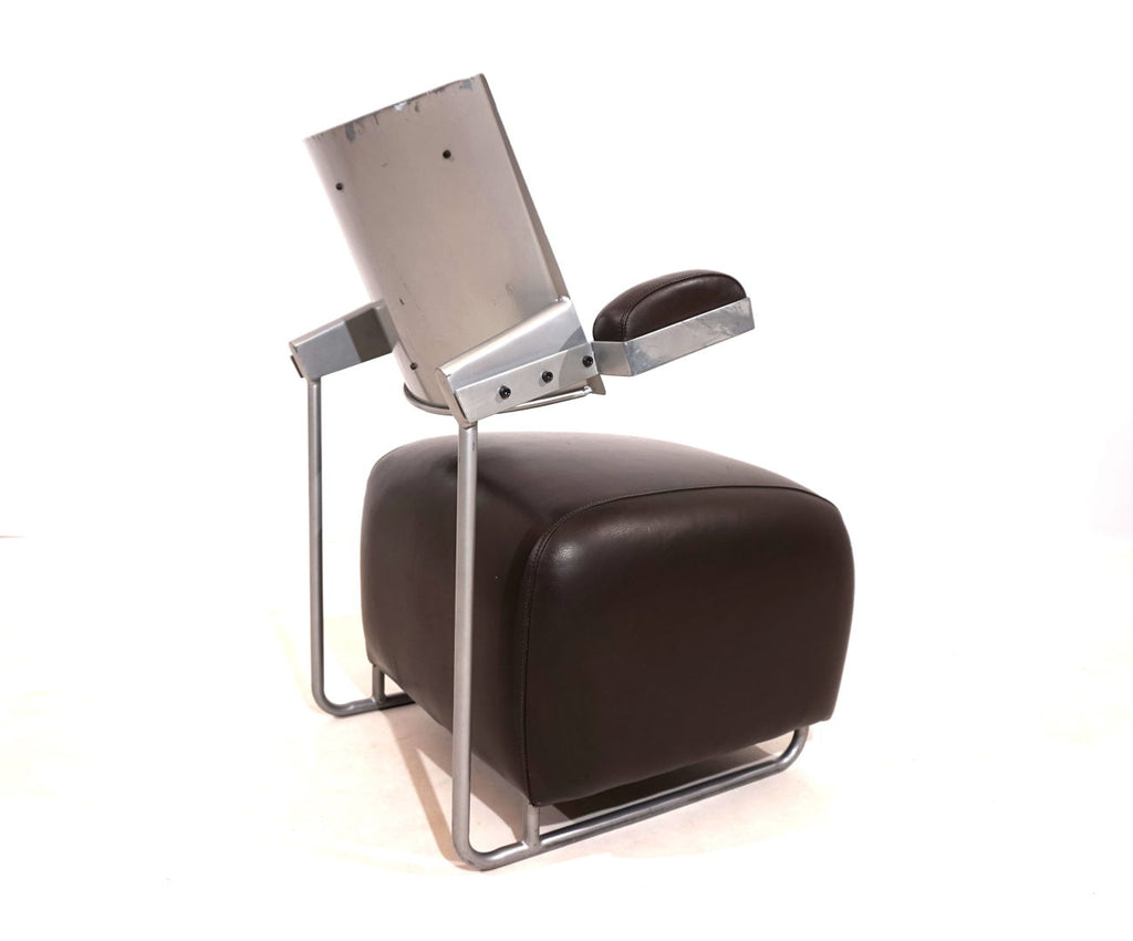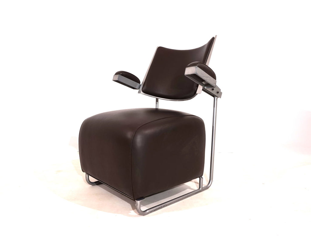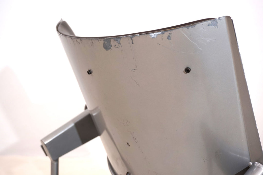 The Oscar armchair comes in brown leather covers with a light grey powder-coated metal frame. The leather covers of the seat cushion and backrest are in first-class condition. The metal frame shows slight signs of wear, the back of the backrest shows heavy signs of abrasion. The seating comfort of the armchair is impeccable and the swinging backrest offers a high level of comfort.