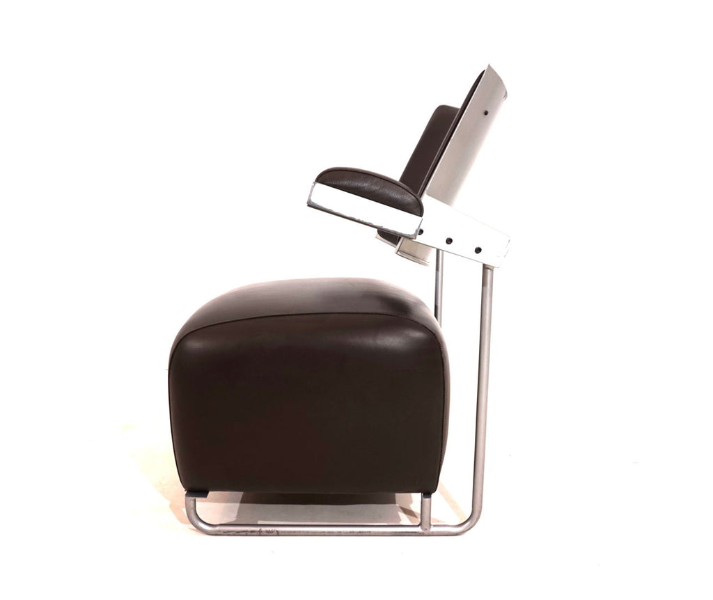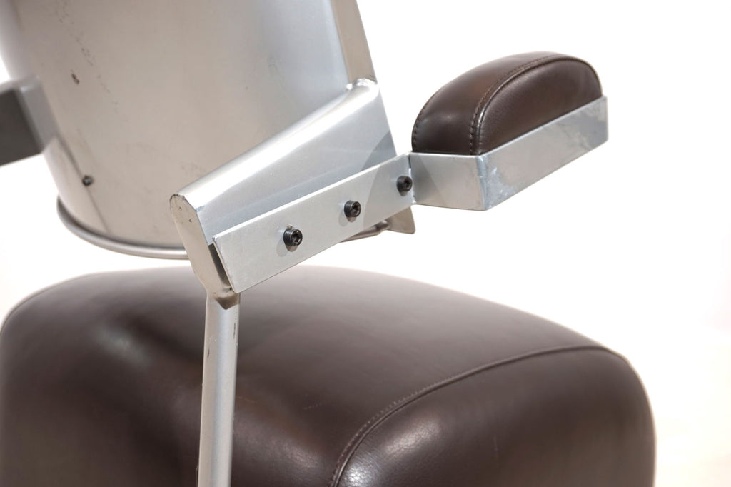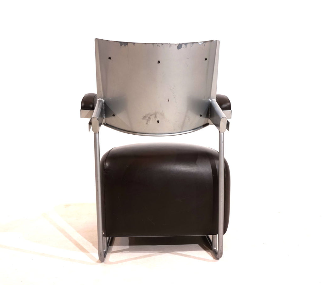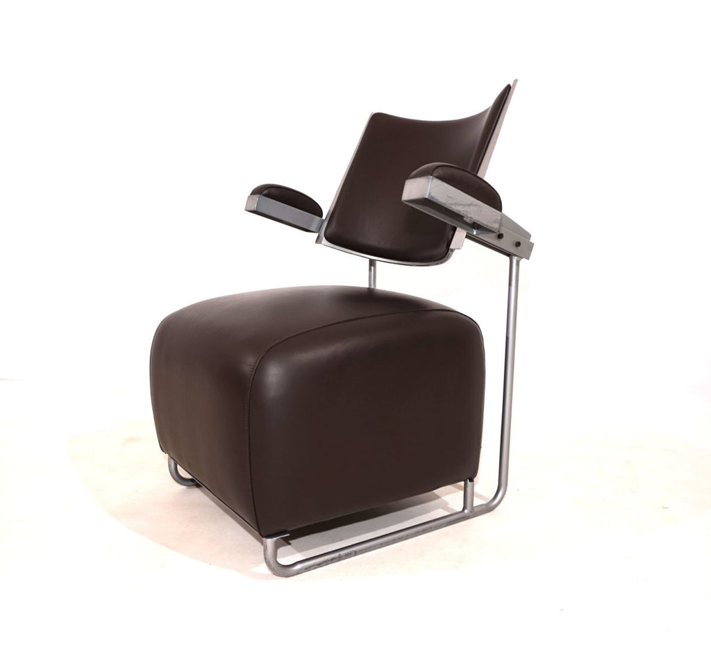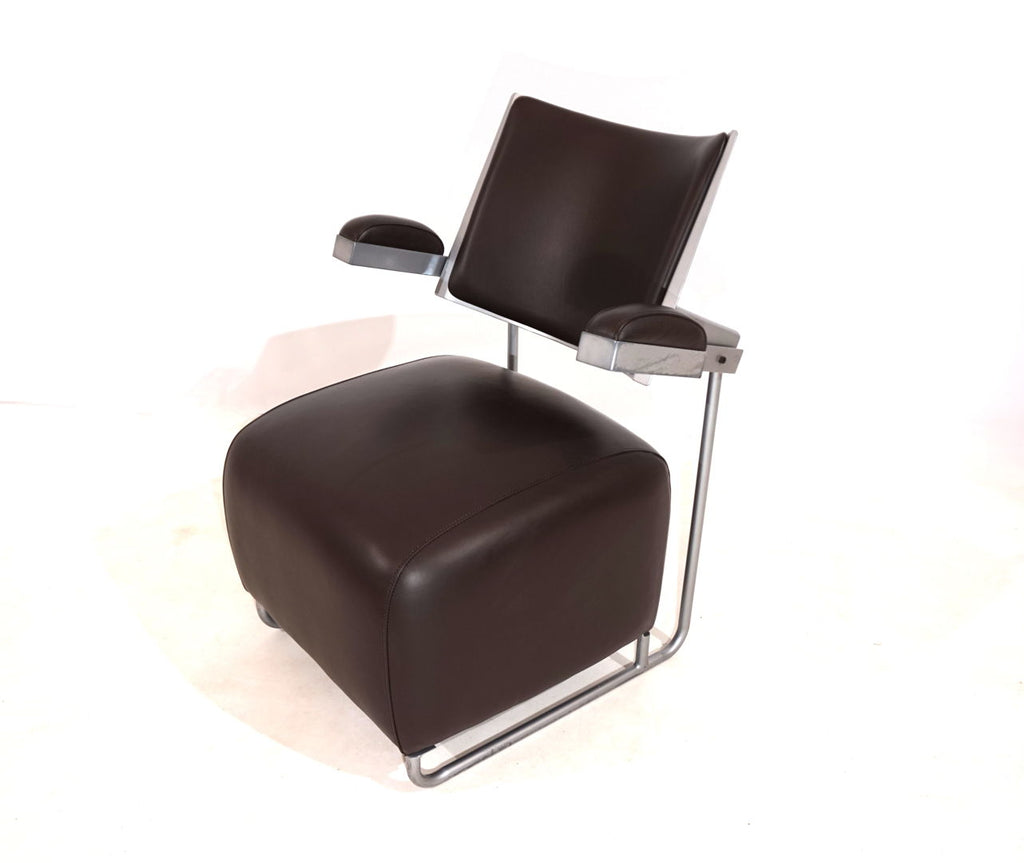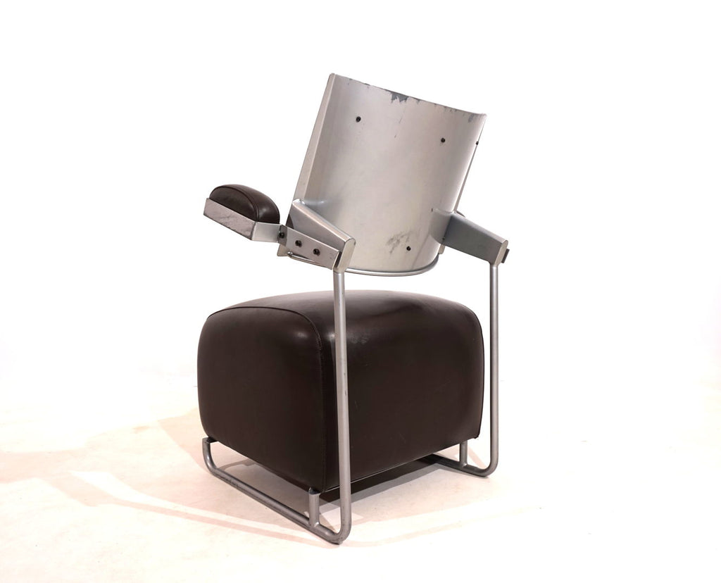 The Oscar armchair comes in brown leather covers with a light grey powder-coated metal frame. The leather covers of the seat cushion and backrest are in first-class condition. The metal frame shows slight signs of wear, the back of the backrest shows heavy signs of abrasion. The seating comfort of the armchair is impeccable and the swinging backrest offers a high level of comfort.