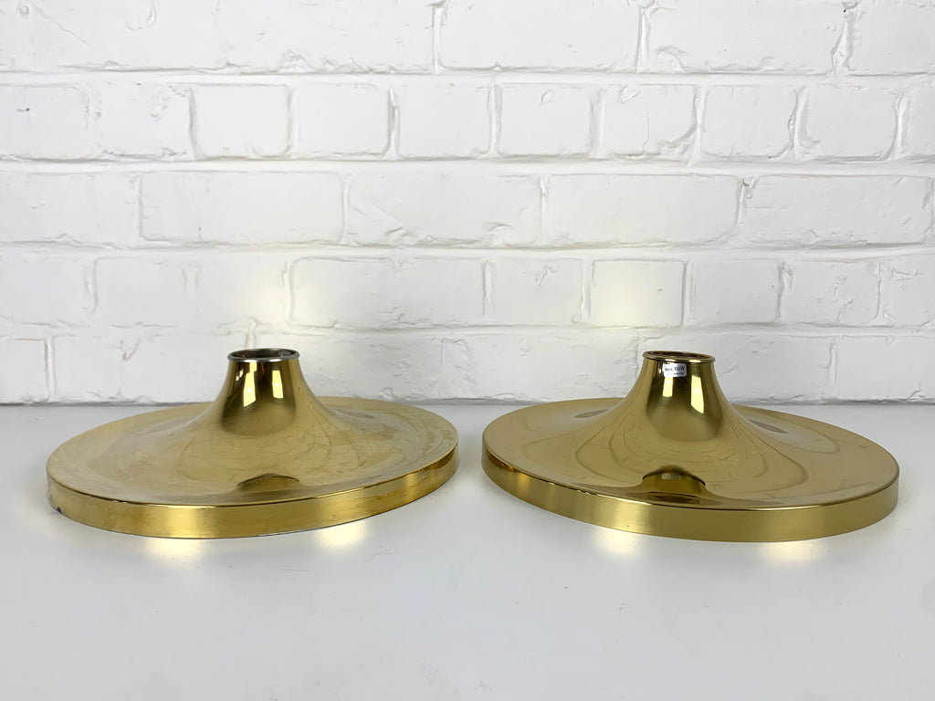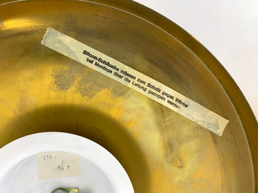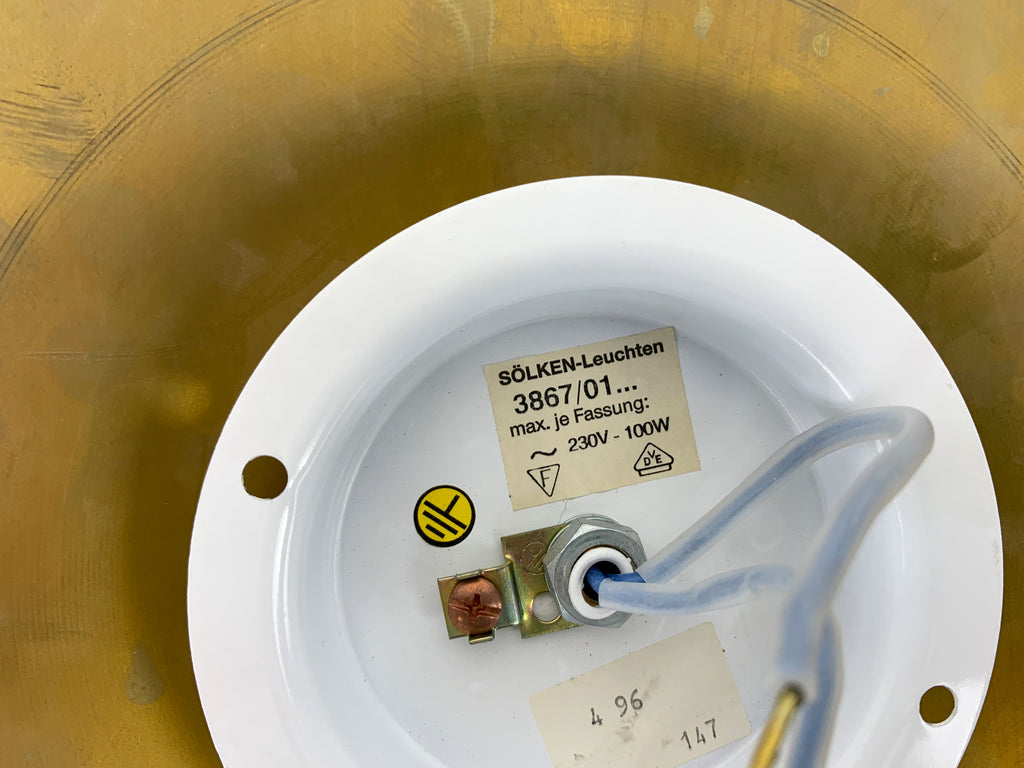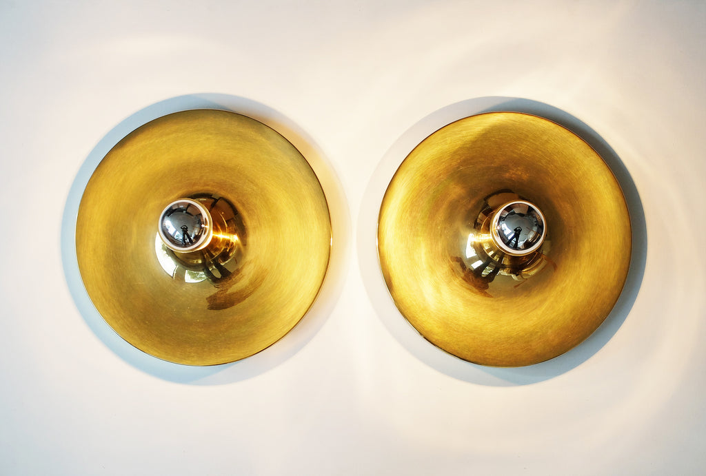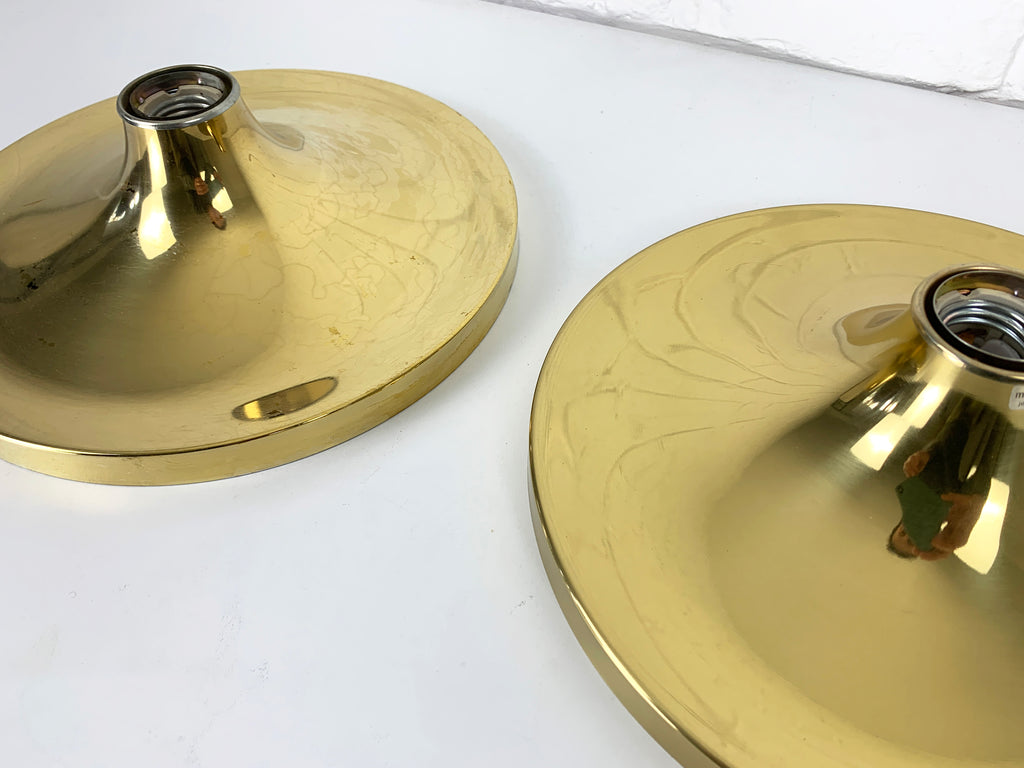 독일 Sölken Leuchten에서 제조한 한 쌍의 독일 벽 조명. 60년대 또는 70년대에 제작된 우주 시대 스타일. 반짝이는 금색/황동 마감, 매우 좋은 상태(조명 중 하나는 NOS/New Old Stock이며 사용된 적이 없습니다) ! 28cm 직경 참고 = 제조사 = Sölken Leuchten