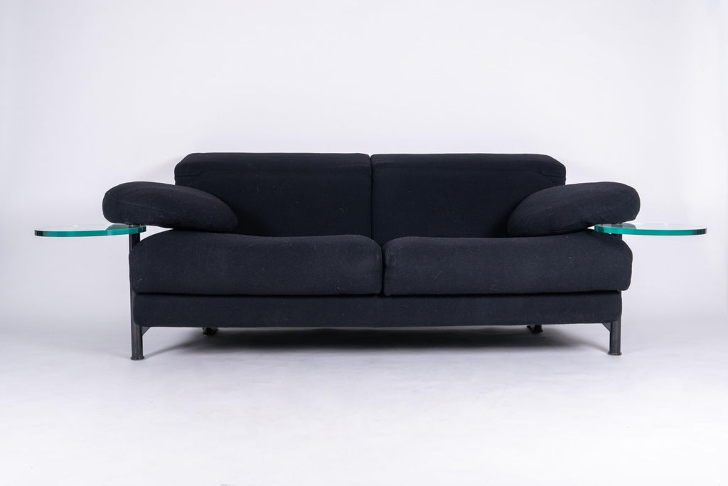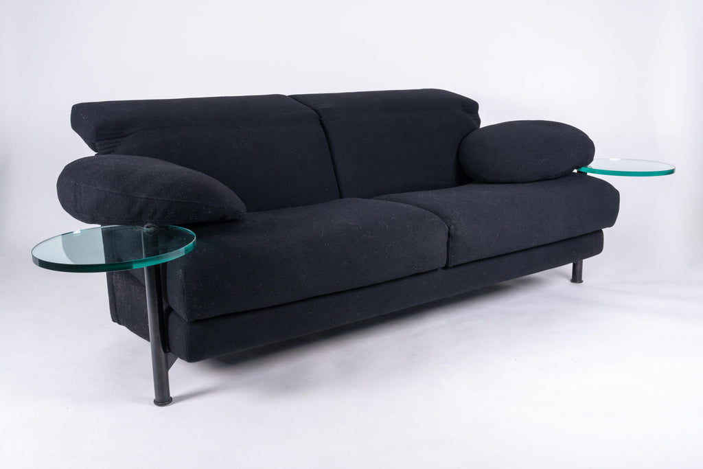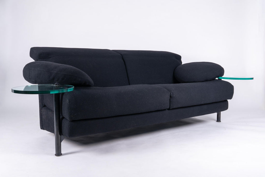 Beautiful sofa by Paolo Piva for B&B Italia, 1980s. The armrests are provided with transparent glass serving tables which swing out from underneath. Framework made of structural steel embedded in cold foamed polyurethane and black wool fabric in excellent condition. The backrests, which are easily adjustable, can assume various positions.