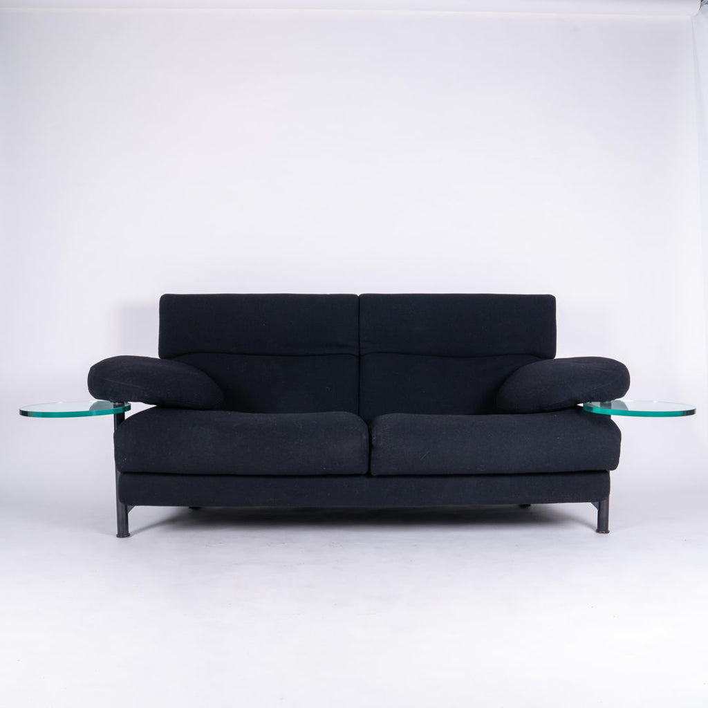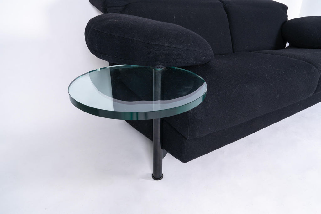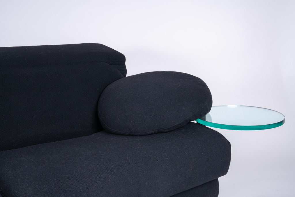 1980년대 B&B Italia를 위한 Paolo Piva의 아름다운 소파. 팔걸이에는 아래에서 회전하는 투명한 유리 서빙 테이블이 제공됩니다. 우수한 상태의 냉발포 폴리우레탄과 블랙 울 직물에 내장된 구조용 강철로 제작된 프레임워크. 쉽게 조절 가능한 등받이는 다양한 자세를 취할 수 있습니다. 원형 테이블: Ø 57 cm.