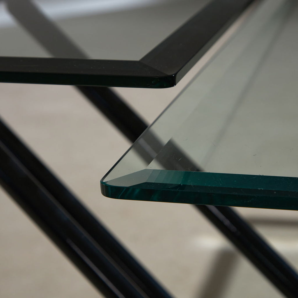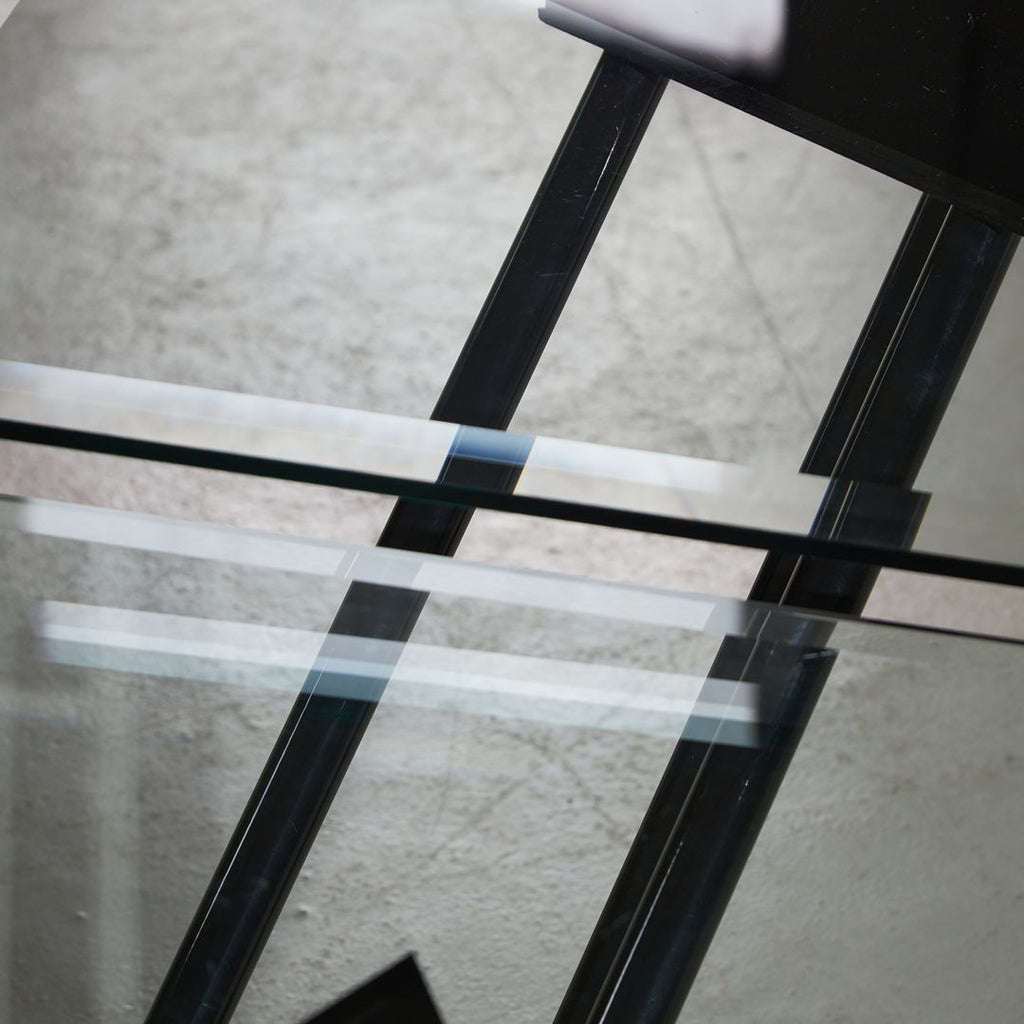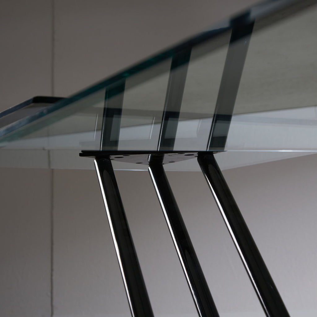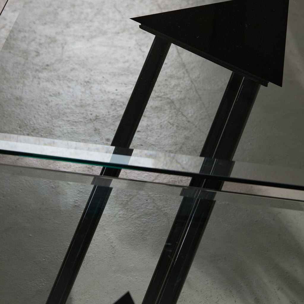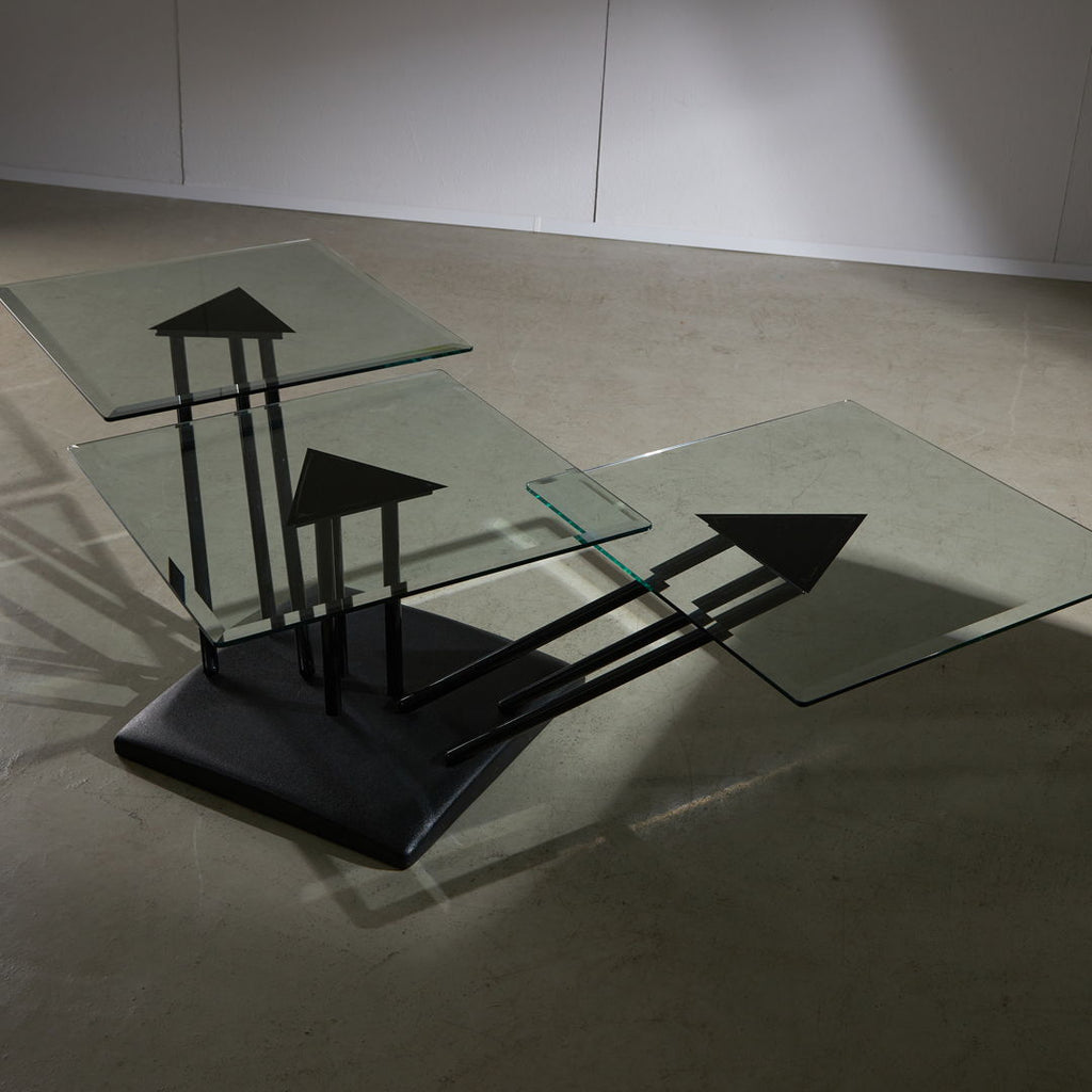 Glass and metal coffee or cocktail table with adjustable features, made by Italian manufacturer Bellato in the 1980’s. Unique design allows for repositioning of glass holder arms. Featuring a postmodern style, this table would be a chic and distinctive addition to any elegant interior. The sculptural design includes geometric shapes and surprising angles. Adjustable heights cater to various needs, making it versatile for different uses. Ideal for those who value daring and unconventional design, as well as a touch of Italian sophistication in their home décor. In a sturdy and very nice vintage condition with minor scrathes, and small wear on the joining surface of the glass panels.