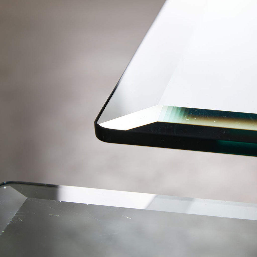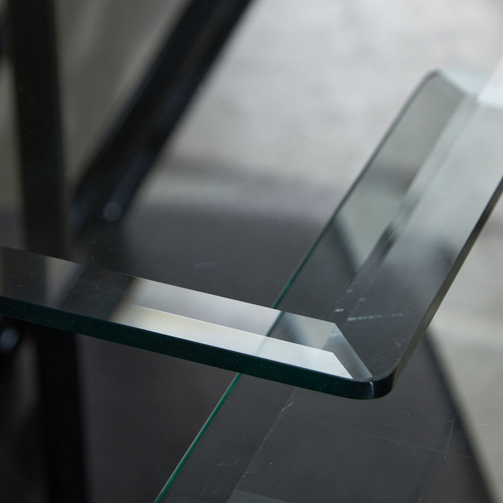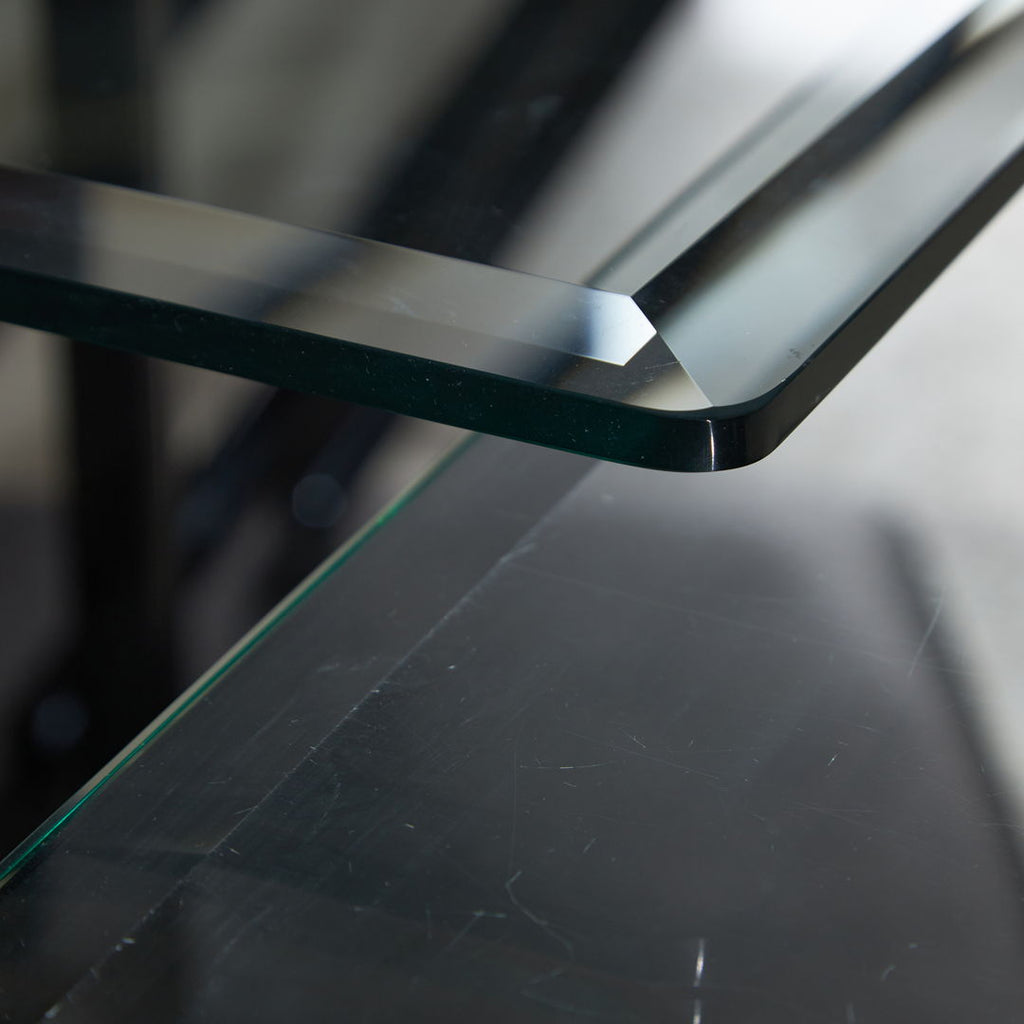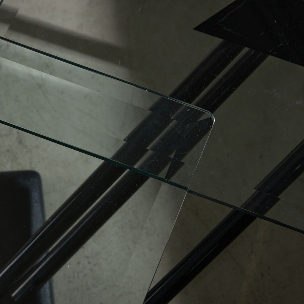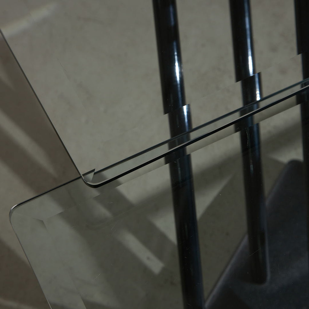 Glass and metal coffee or cocktail table with adjustable features, made by Italian manufacturer Bellato in the 1980’s. Unique design allows for repositioning of glass holder arms. Featuring a postmodern style, this table would be a chic and distinctive addition to any elegant interior. The sculptural design includes geometric shapes and surprising angles. Adjustable heights cater to various needs, making it versatile for different uses. Ideal for those who value daring and unconventional design, as well as a touch of Italian sophistication in their home décor. In a sturdy and very nice vintage condition with minor scrathes, and small wear on the joining surface of the glass panels.