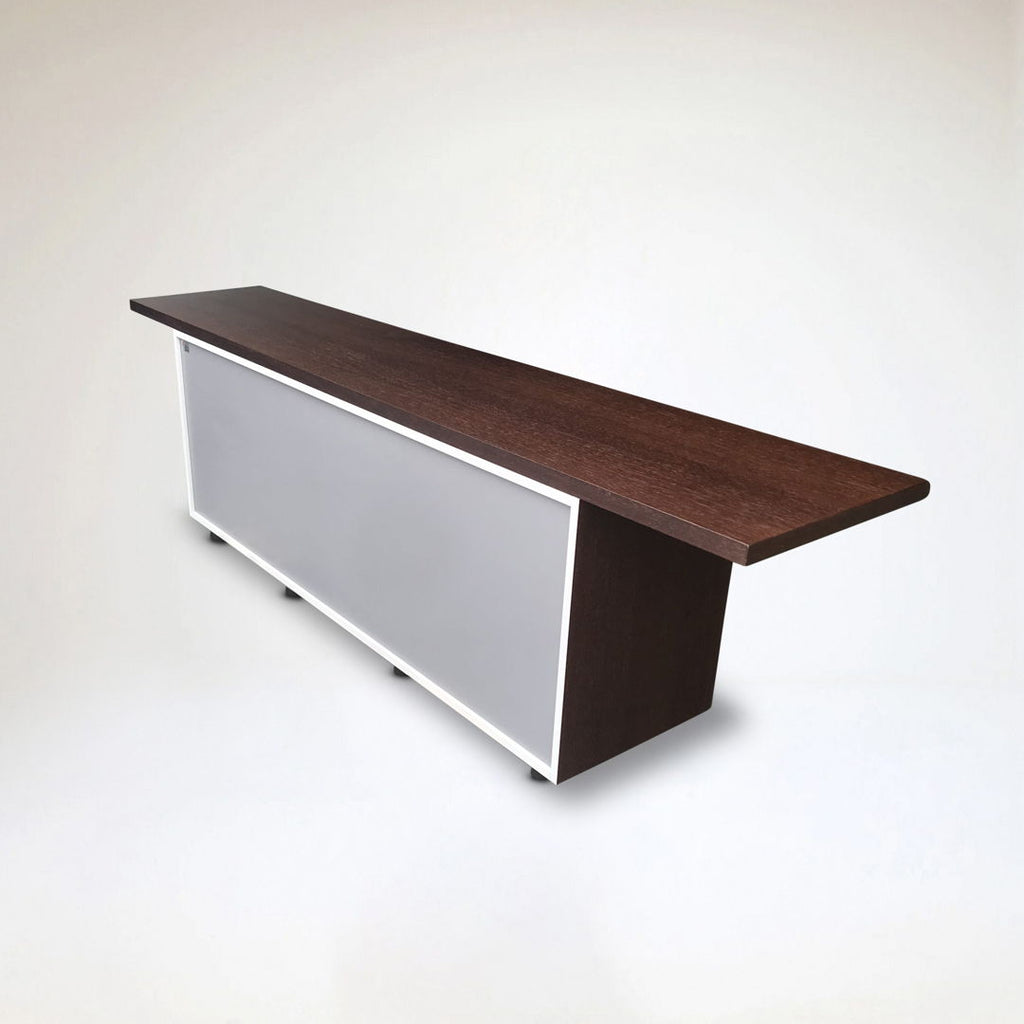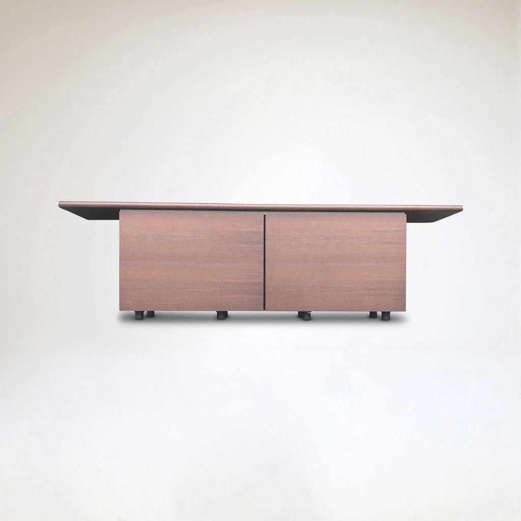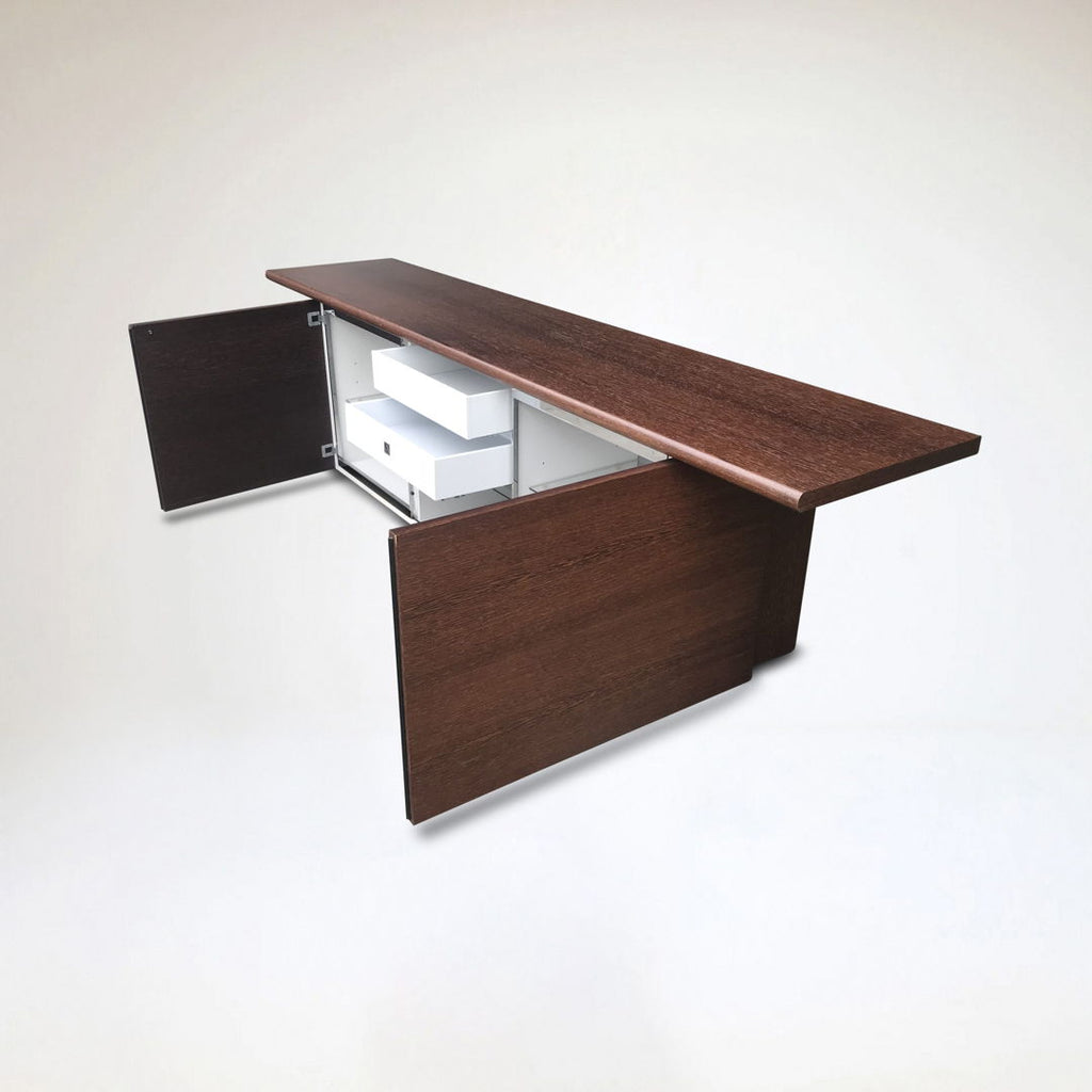 1977년부터 시작된 Giotto Stoppino의 인상적인 디자인은 이탈리아의 클래식 크레덴차 디자인을 포스트모던하게 해석한 것입니다. 쉐라톤은 오버사이즈 상단이 특징이며, 몸체에서 뚜렷하게 튀어나와 많은 자세를 제공합니다. 도어는 부분적으로 슬라이딩되고 부분적으로는 힌지 메커니즘을 사용하여 현대적으로 해석되었습니다. 크롬 프레임은 도어가 열렸을 때 시각적 장식을 제공합니다. 내부는 중앙의 미닫이 서랍과 바깥쪽 끝의 유리판으로 구성되어 있습니다. 생산된 대부분의 쉐라톤은 래커 처리된 외관을 특징으로 하는 반면, 이 특정 쉐라톤은 처리되지 않은 웬지 외관을 특징으로 합니다. 우리 의견으로는 이 좀 더 클래식한 디자인이 실제로 쉐라톤의 디자인에 훨씬 더 잘 어울리는 것 같습니다. 분명히 원래 표시가 사이드보드에 여전히 남아 있습니다. 찬장은 상태가 매우 양호하며 보존 상태가 매우 좋습니다. 상단에는 시각적 마모가 최소화되어 있습니다.
