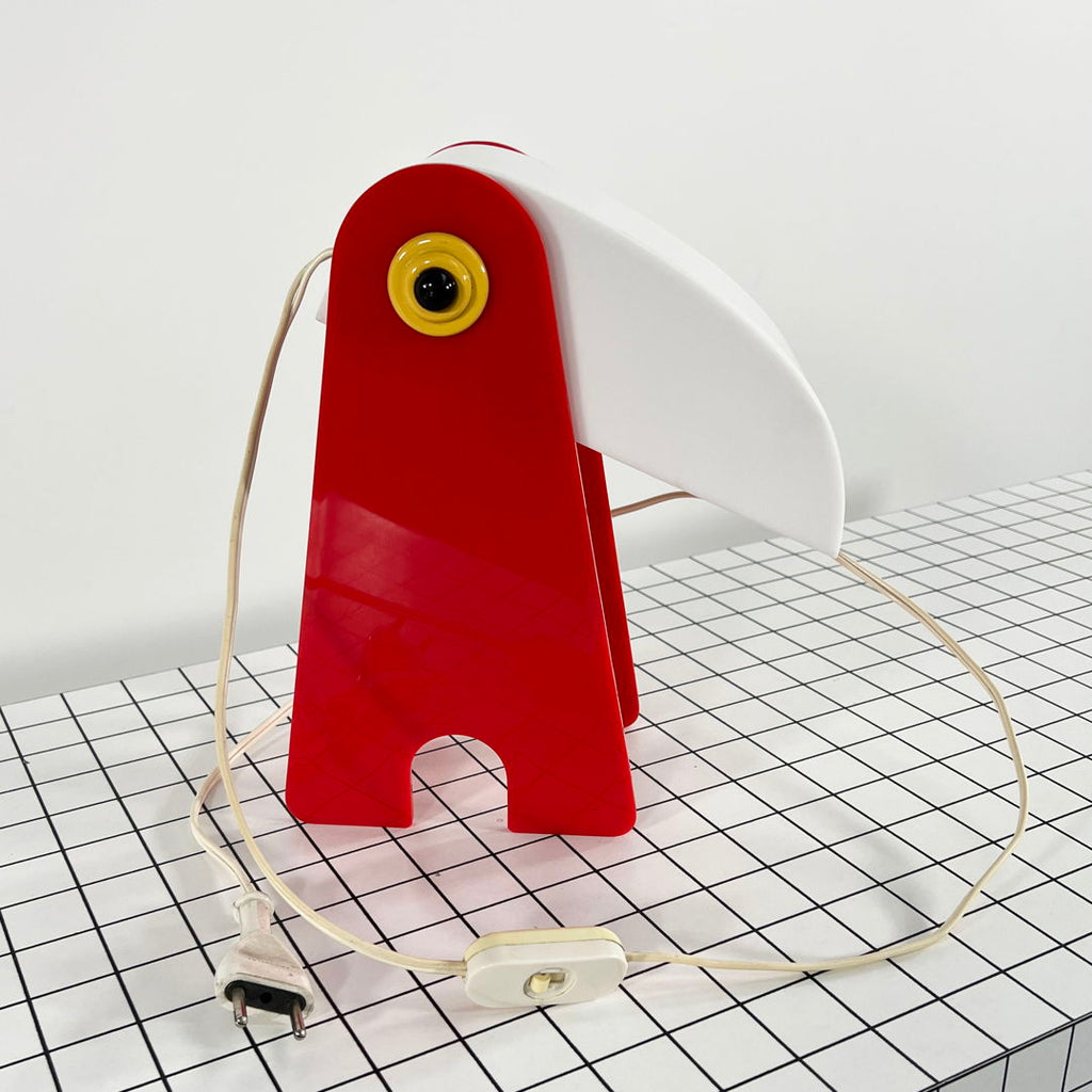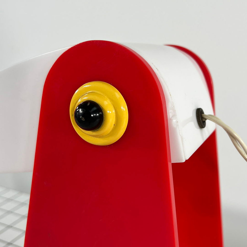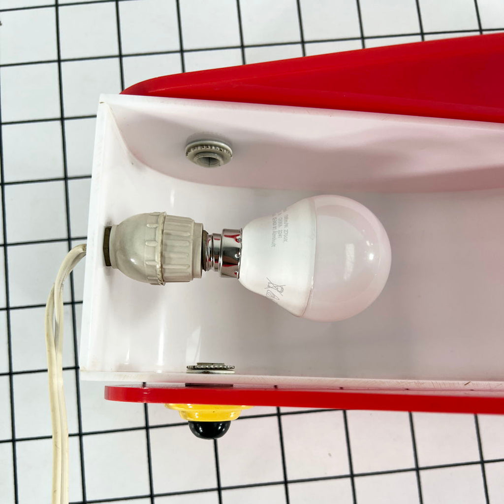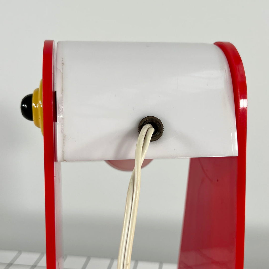 디자인 기간 - 60년대 치수 - 폭 11 cm x 깊이 20 cm x 높이 27 cm 소재 - 플라스틱 색상 - 빨간색, 노란색, 흰색 전기적 특성 - 유럽식 플러그(최대 240V) / 전구 E14 댓글 - 연식 및 사용에 따른 가벼운 마모. 부리 뒤쪽의 플라스틱에 표면적인 균열이 있습니다. 자세한 내용은 사진을 참조하세요.