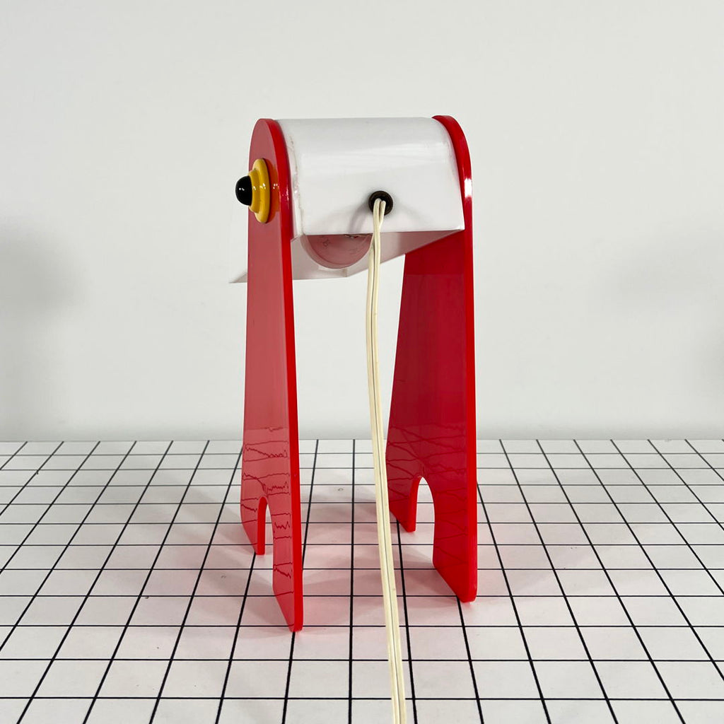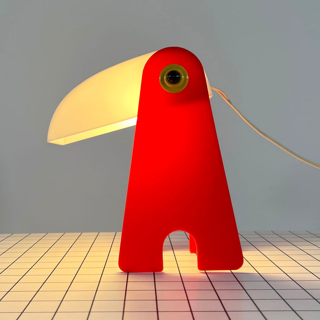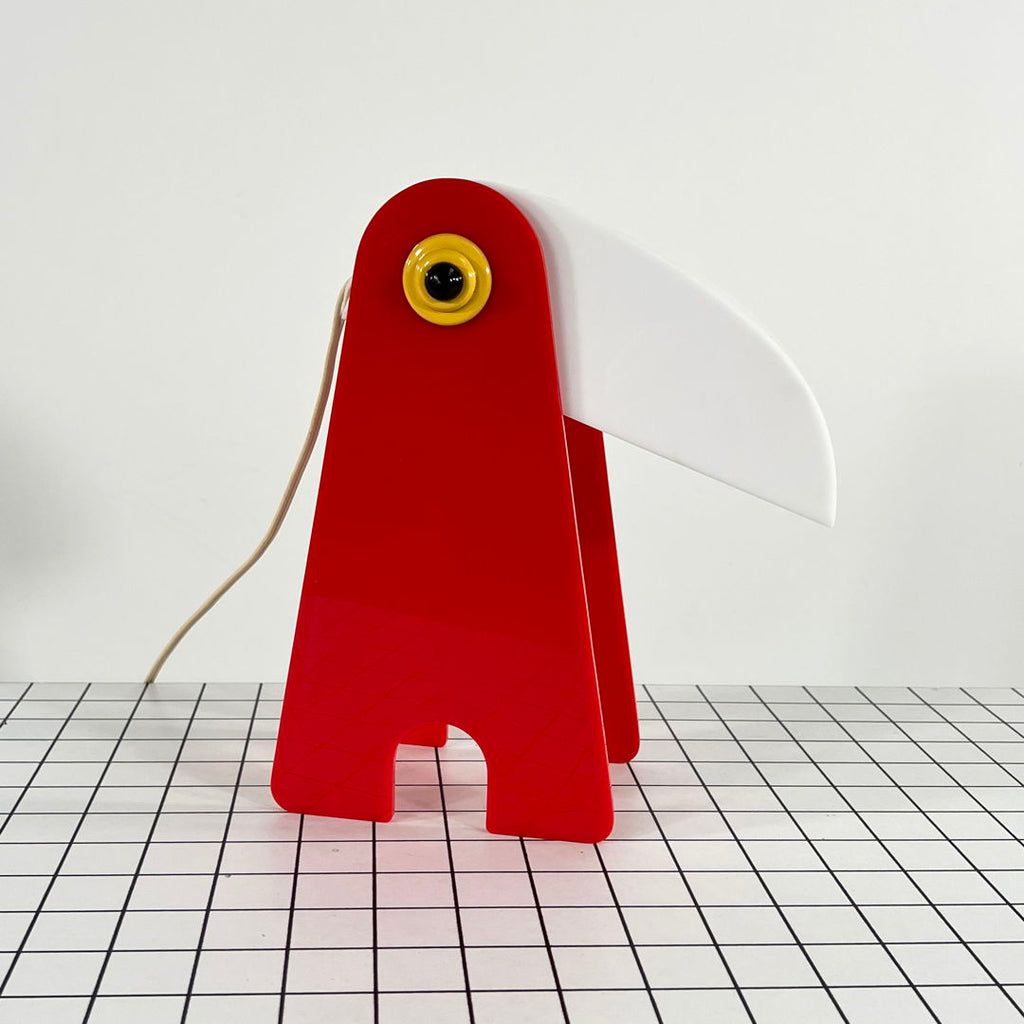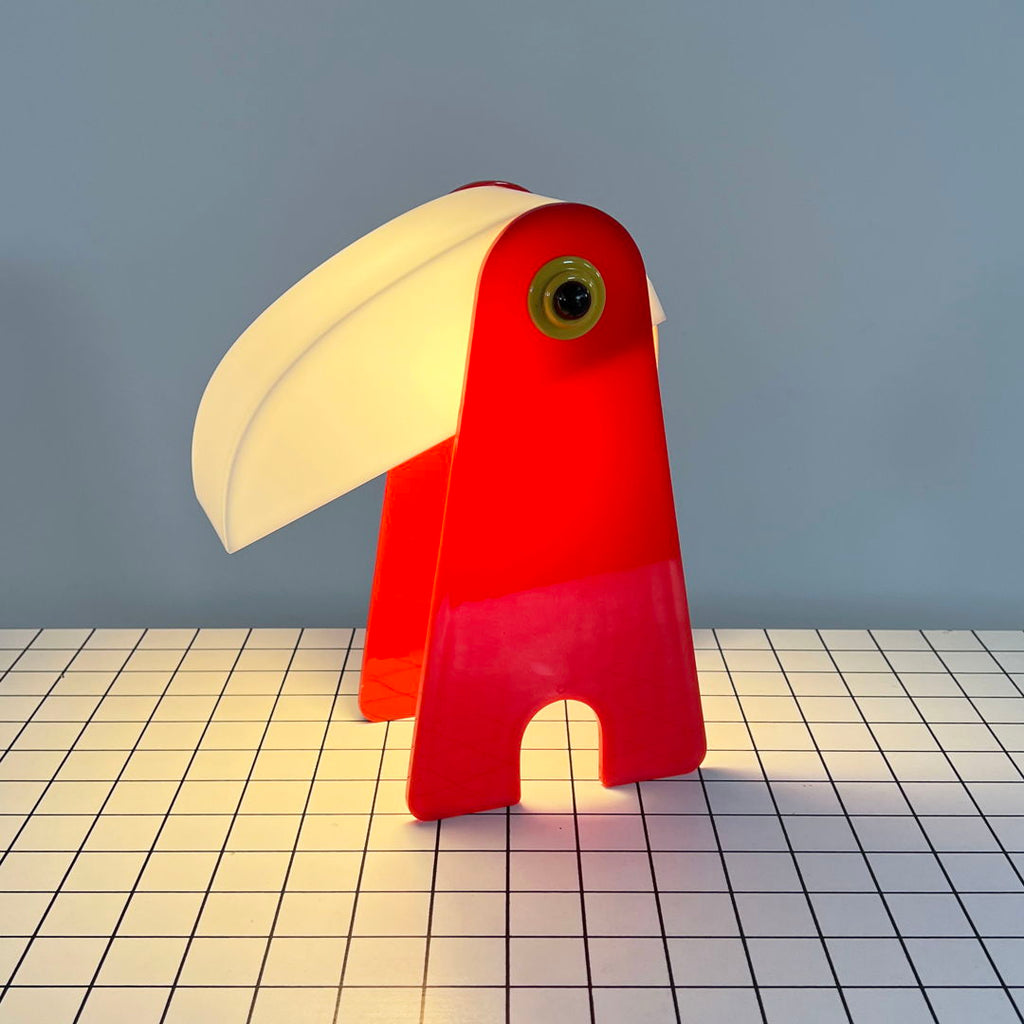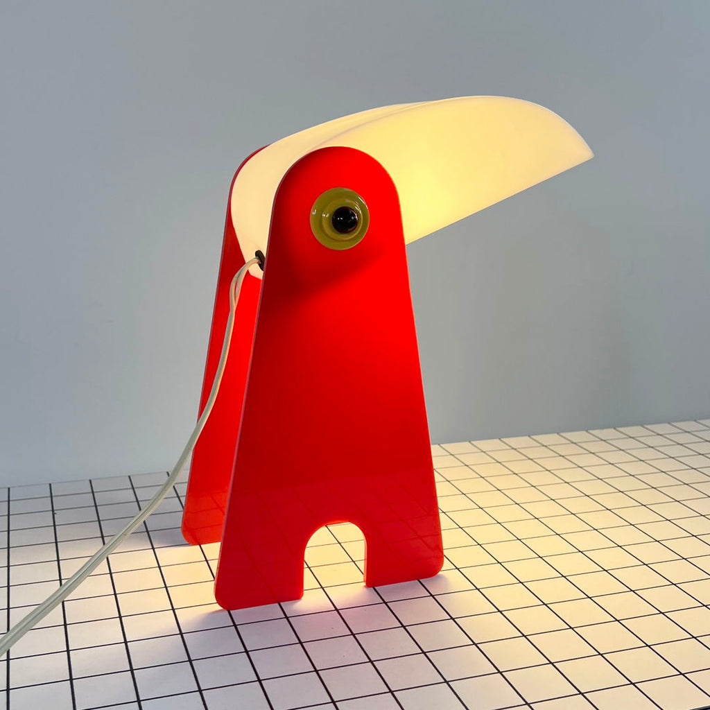 디자인 기간 - 60년대 치수 - 폭 11 cm x 깊이 20 cm x 높이 27 cm 소재 - 플라스틱 색상 - 빨간색, 노란색, 흰색 전기적 특성 - 유럽식 플러그(최대 240V) / 전구 E14 댓글 - 연식 및 사용에 따른 가벼운 마모. 부리 뒤쪽의 플라스틱에 표면적인 균열이 있습니다. 자세한 내용은 사진을 참조하세요.