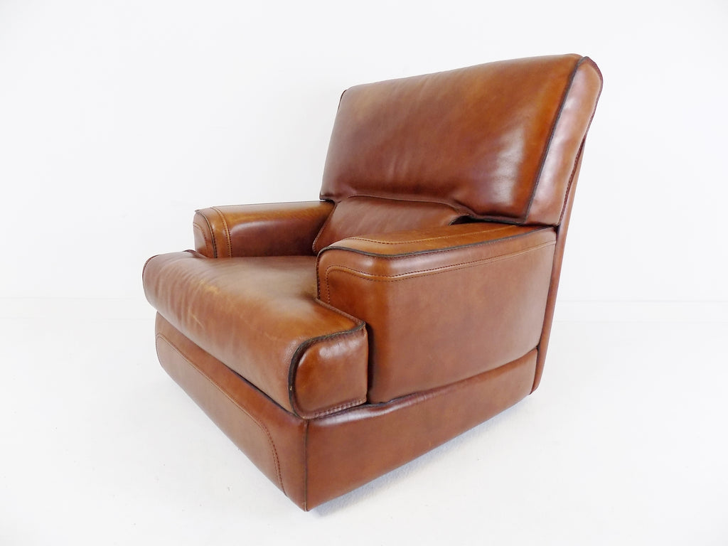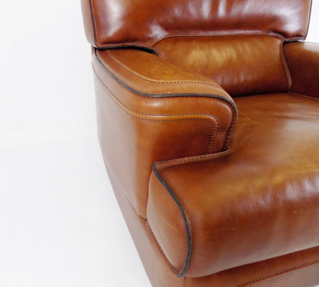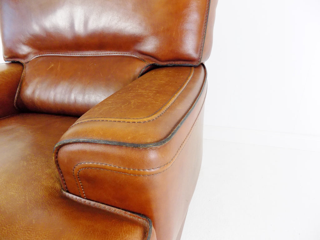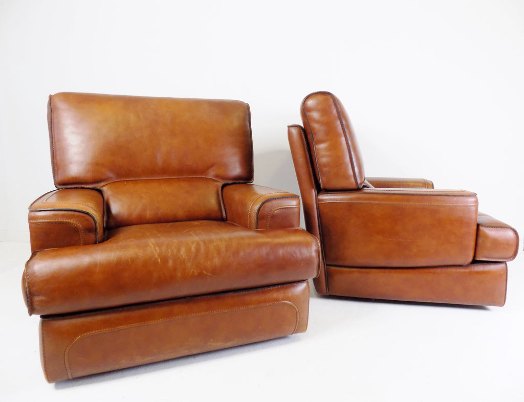 두 안락의자 모두 팔걸이와 좌석에 파티나 흔적이 있으며 아주 좋은 위스키 색 가죽으로 만들어졌습니다. 앱솔루트 스테이트먼트 암체어.